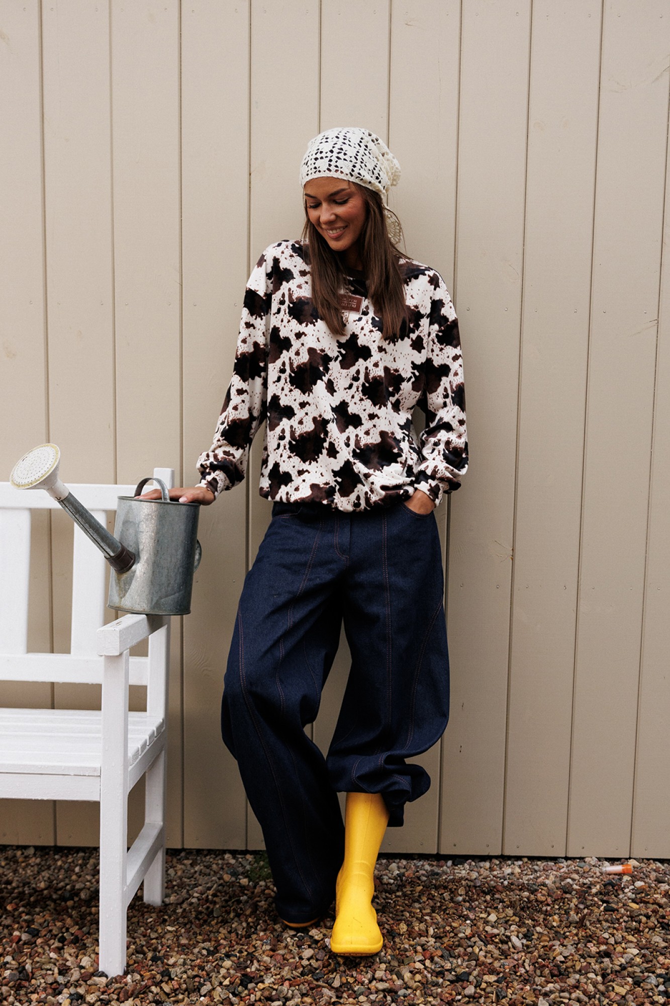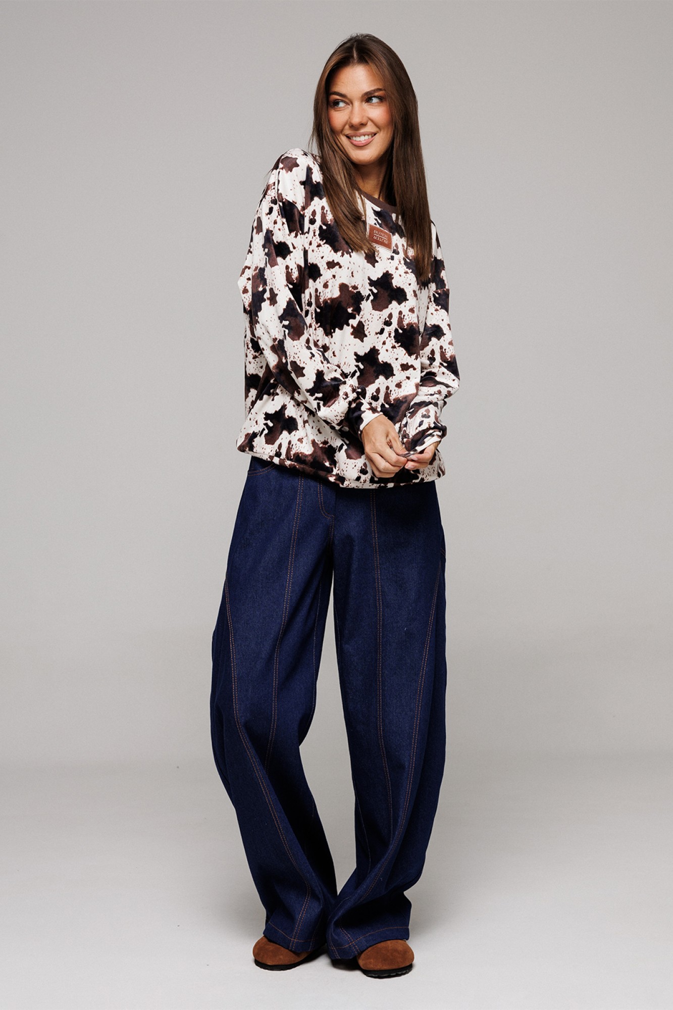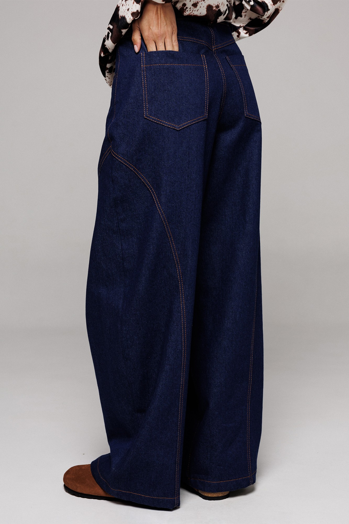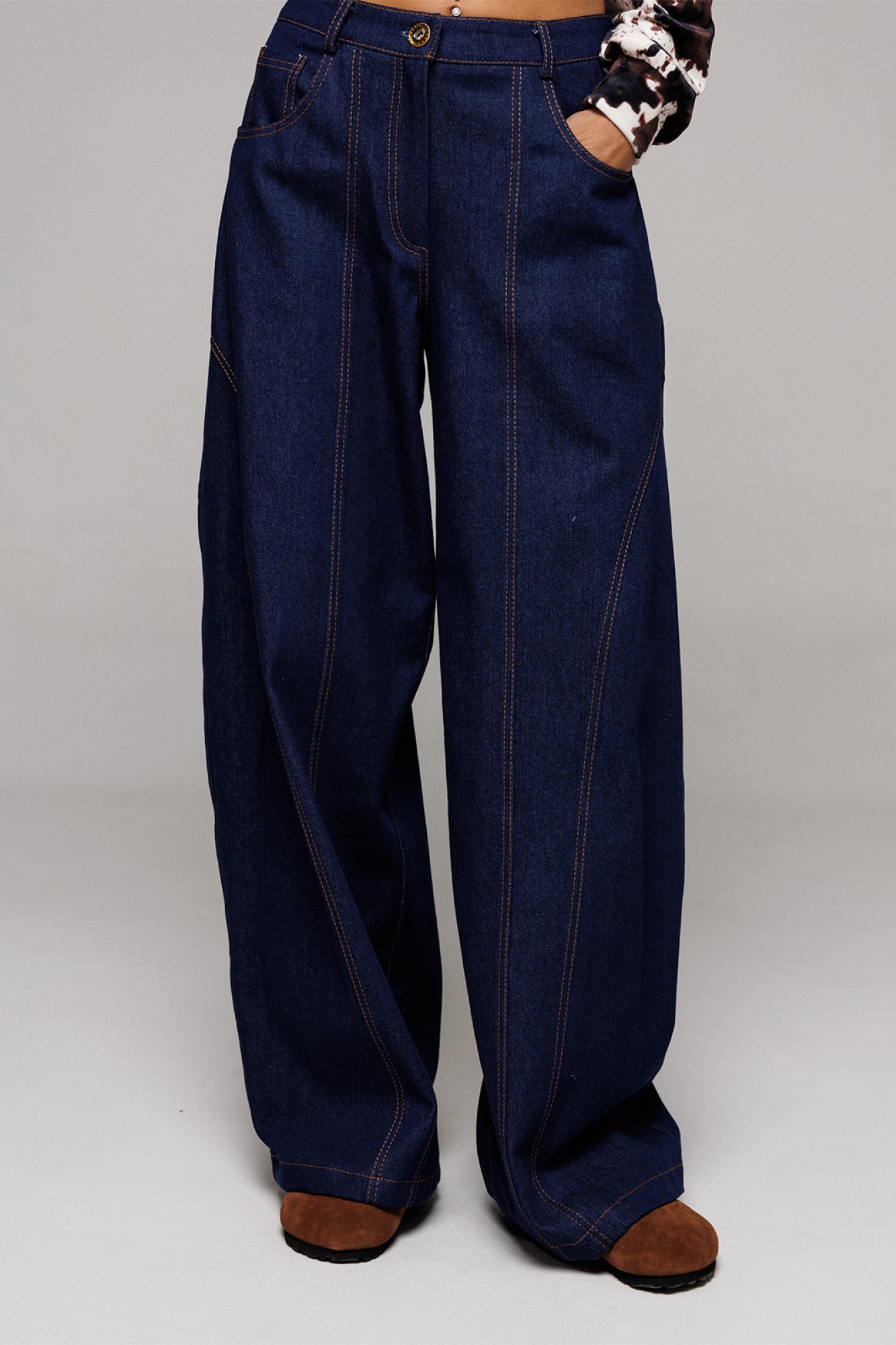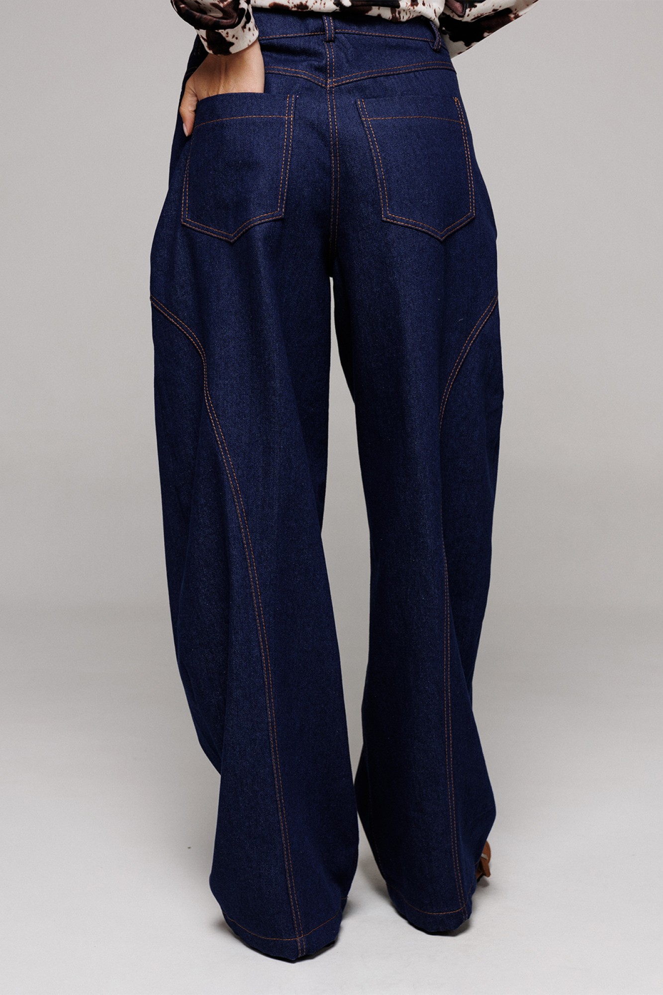 Брюки-джинсы немного заужены к низу. На притачном поясе со шлёвками, застежкой-гульфик. Пояс застегивается на петлю-пуговицу. По переду карманы и рельефы. По спинке кокетка, накладные карманы и рельефы.