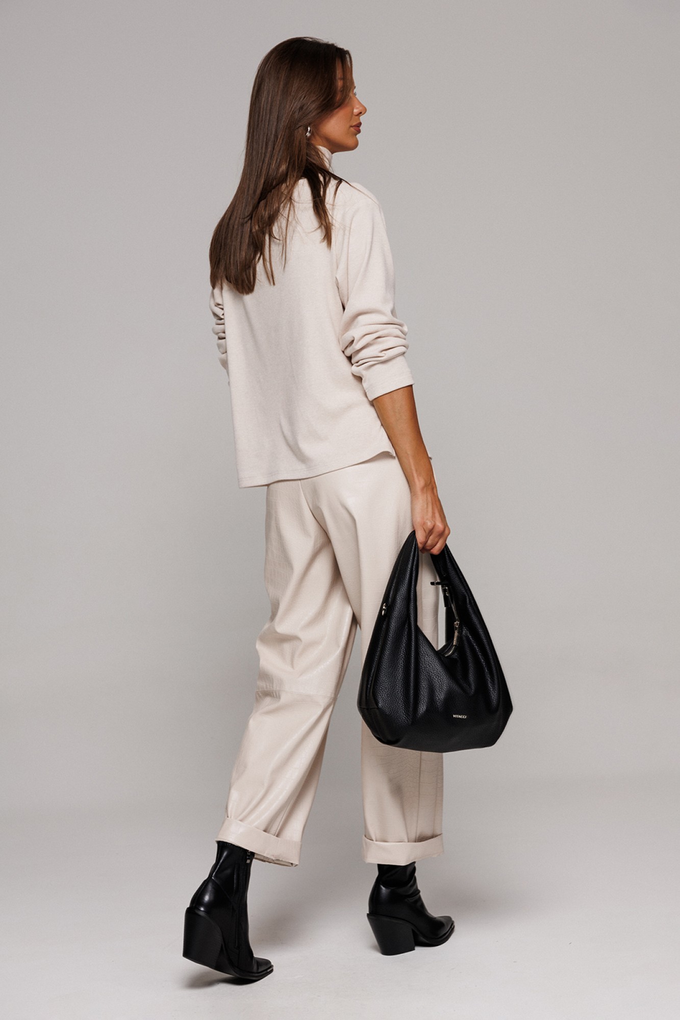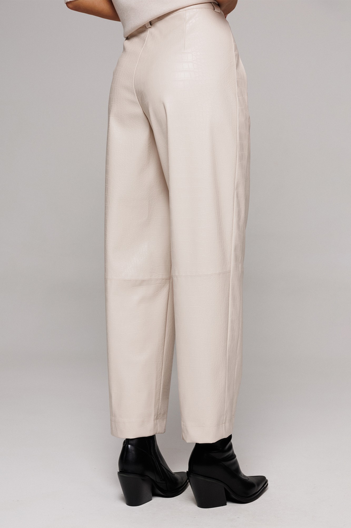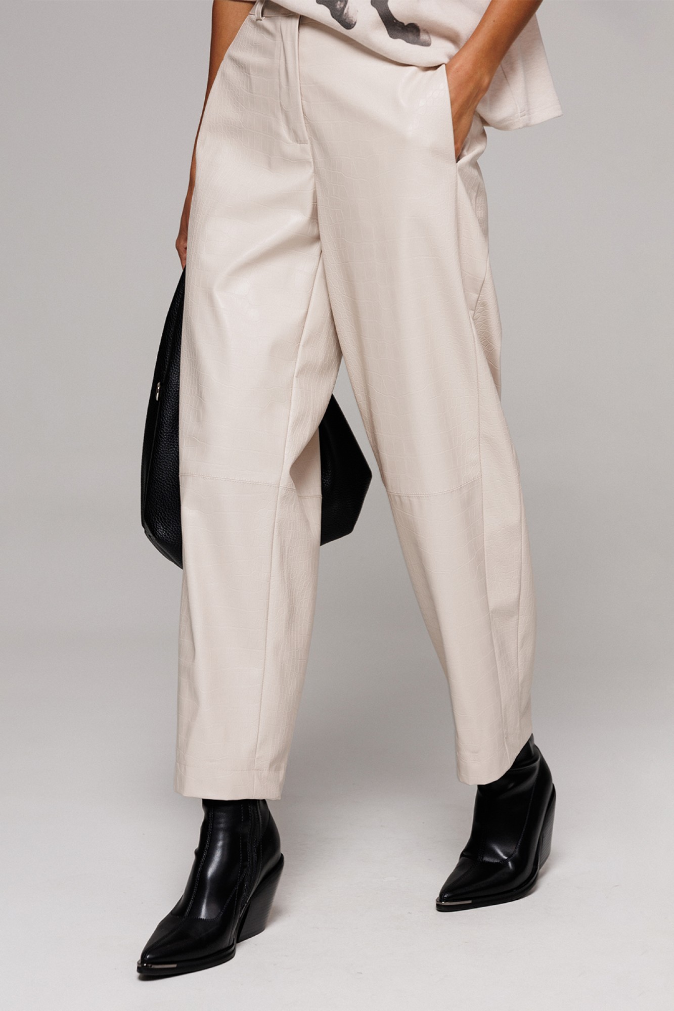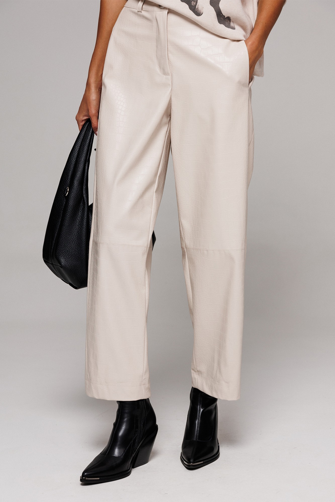 Брюки их эко-кожи немного заужены к низу. На притачном поясе со шлёвками, застежкой-гульфик. Пояс застегивается на петлю-пуговицу. По переду рельефы и карманами в них. По спинке вытачка от пояса. По переду и спинке брюки отрезные по лини колен.
