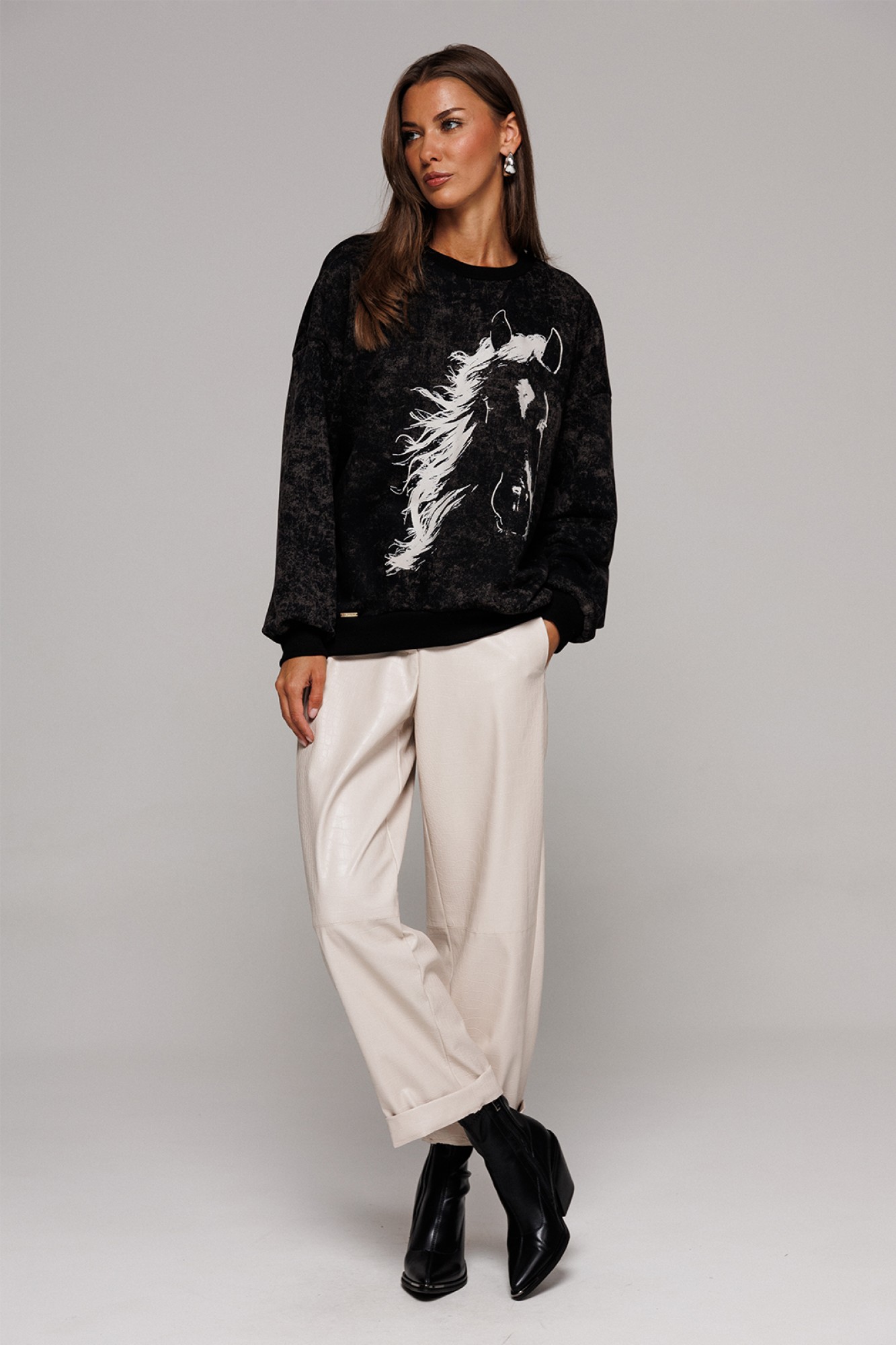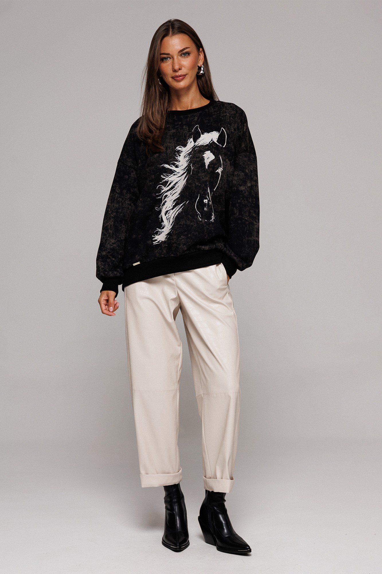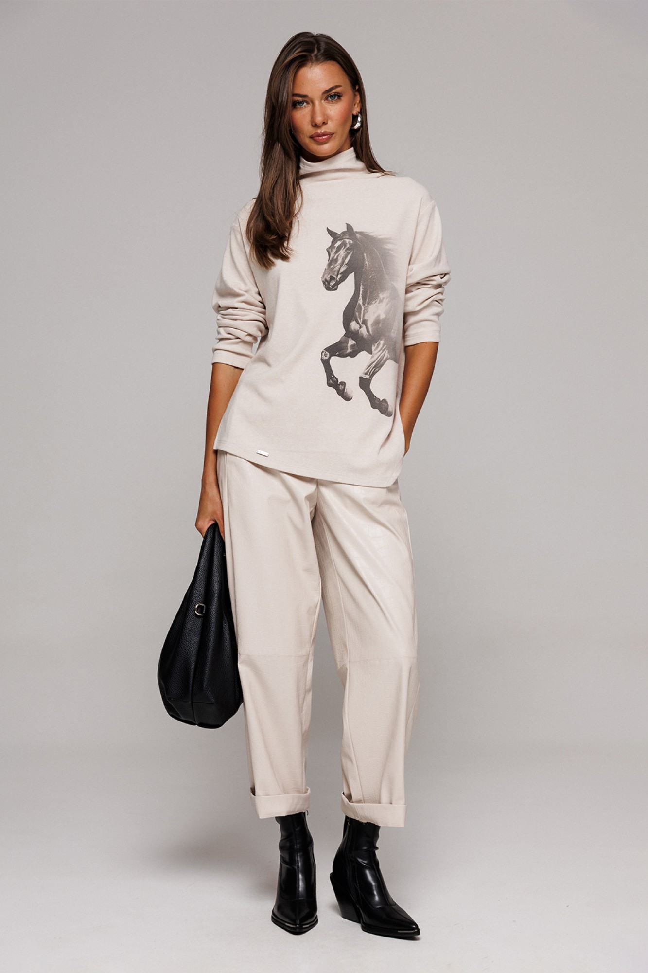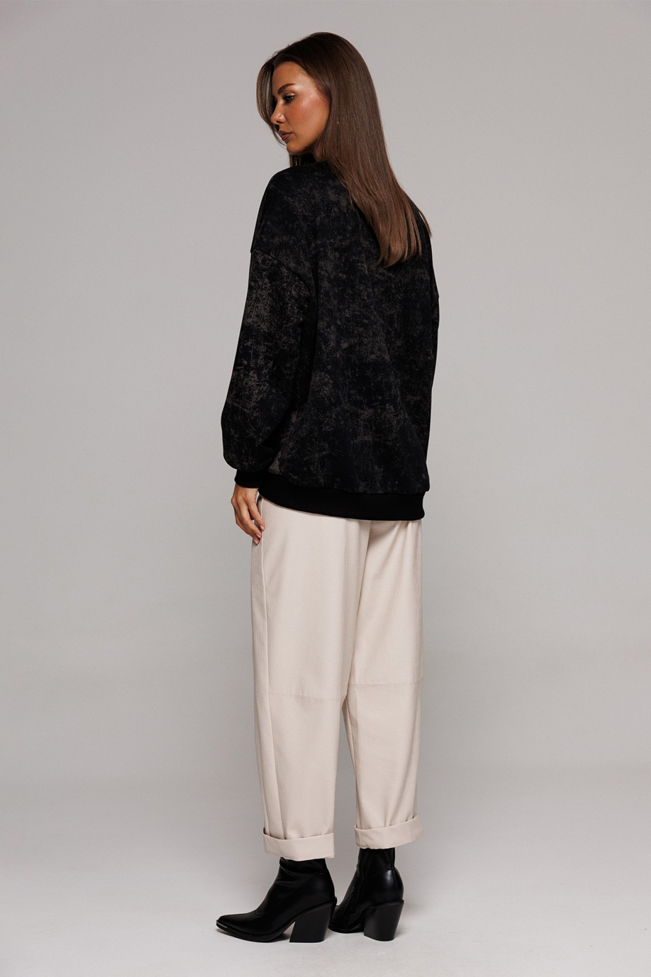 Брюки их эко-кожи немного заужены к низу. На притачном поясе со шлёвками, застежкой-гульфик. Пояс застегивается на петлю-пуговицу. По переду рельефы и карманами в них. По спинке вытачка от пояса. По переду и спинке брюки отрезные по лини колен.