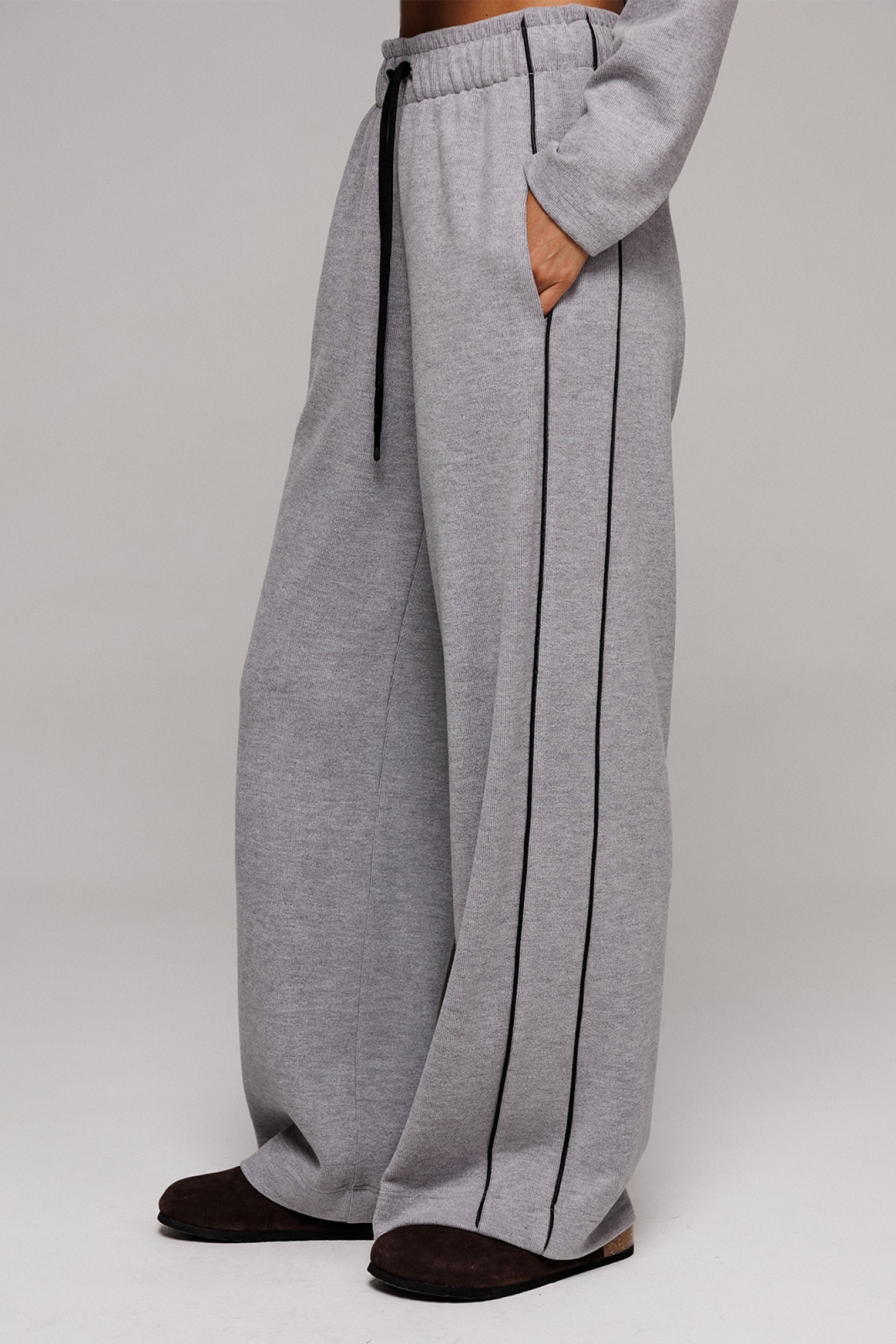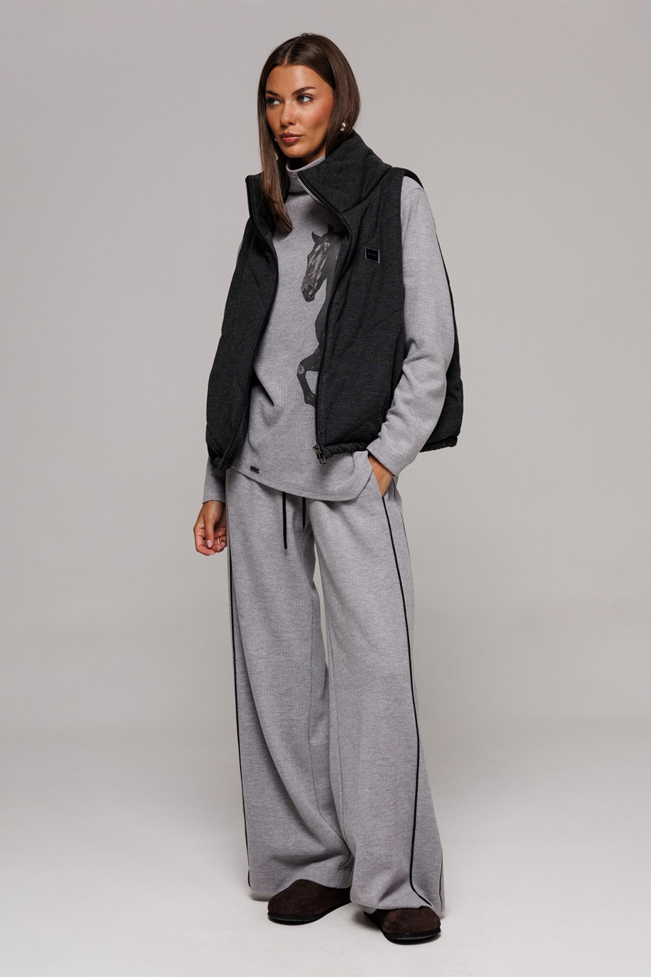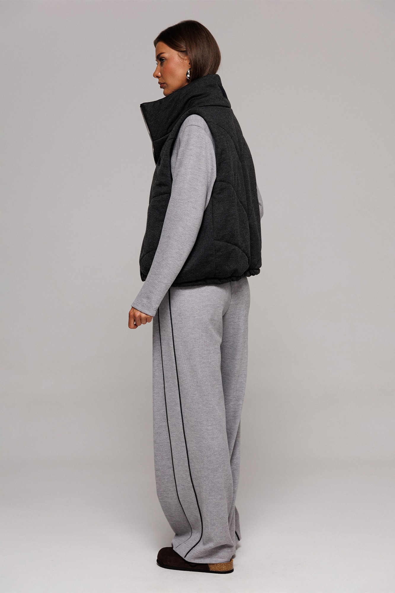 Брюки из трикотажного полотна с велюровым эффектом прямого силуэта на цельнокроеном отстроченном поясе со вставленной в него резинкой и декоративным шнурком. По бокам отрезной бочок с кантом и карманом в шве притачивания бочка.
