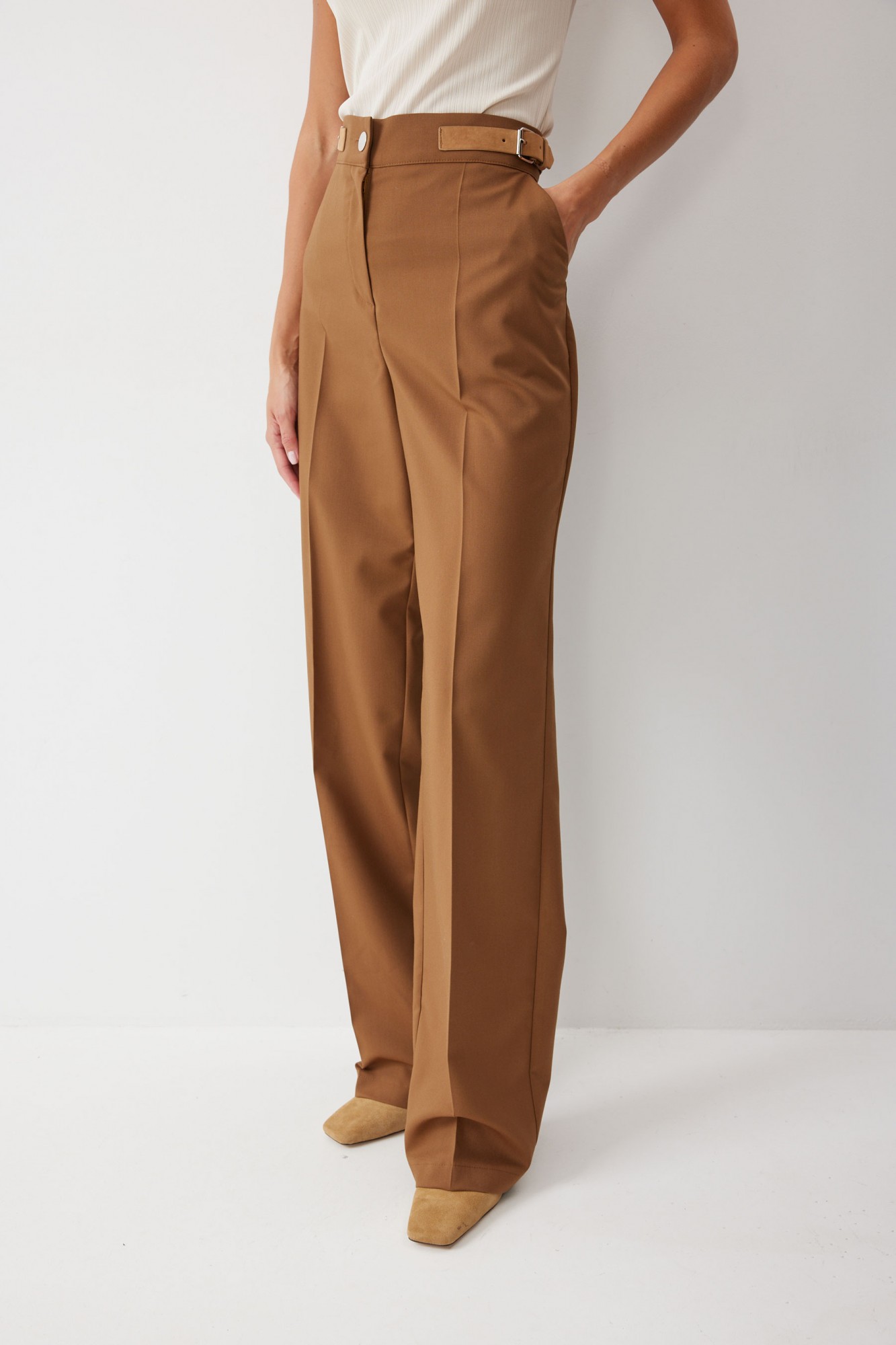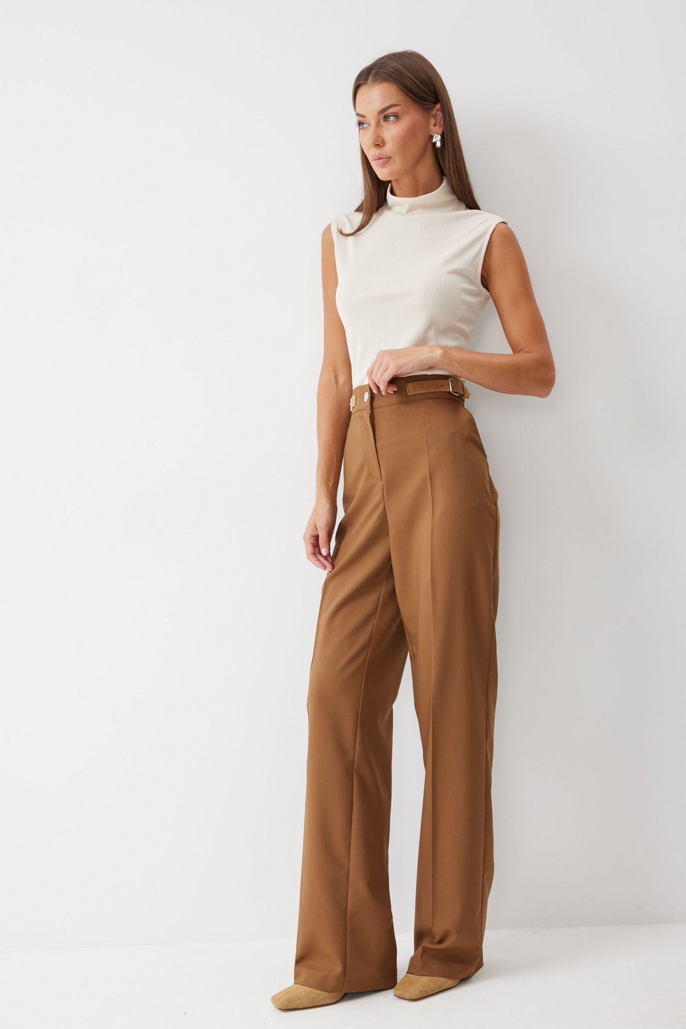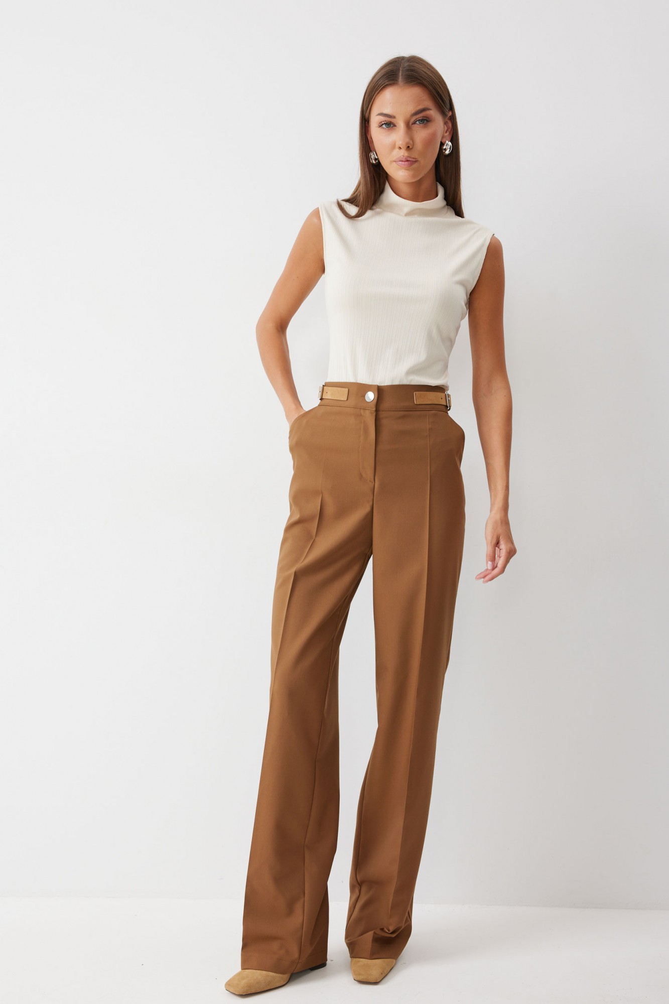 Брюки прямого силуэта из костюмной ткани. По верху брюк притачной пояс с застежкой на петлю и пуговицу, по верху пояса ,на боковых швах , расположены декоративные пряжки. На передних половинках обработаны карманы и застежка молния в среднем шве. На задних половинках вытачки. По поясу задних половинок брюк резинка. Обращаем ваше внимание, что фурнитура может незначительно отличаться от фото.