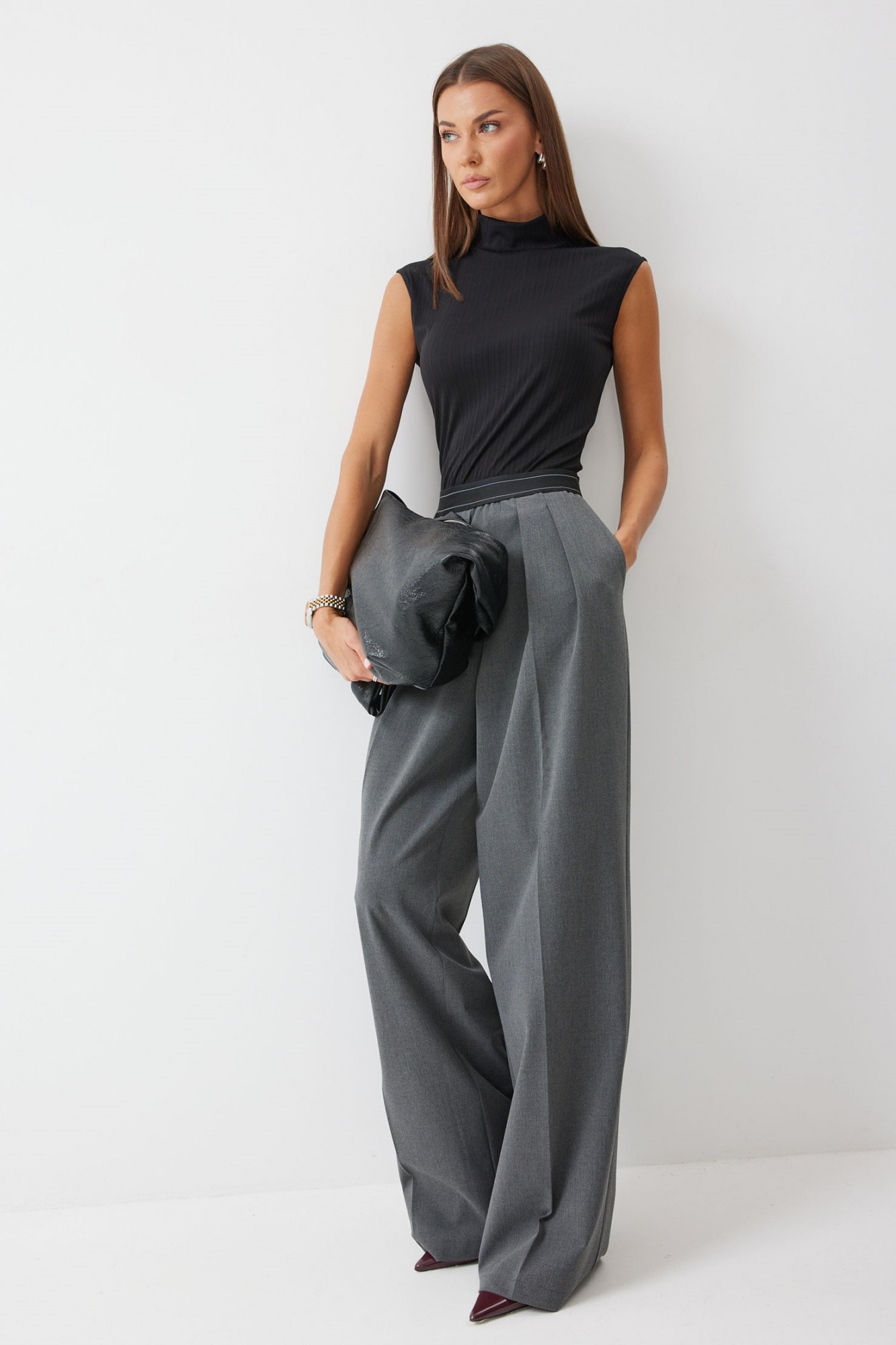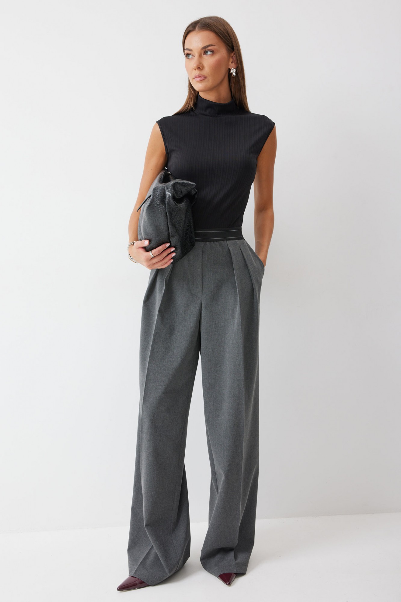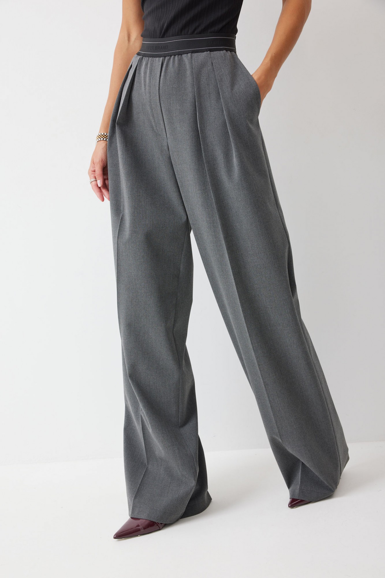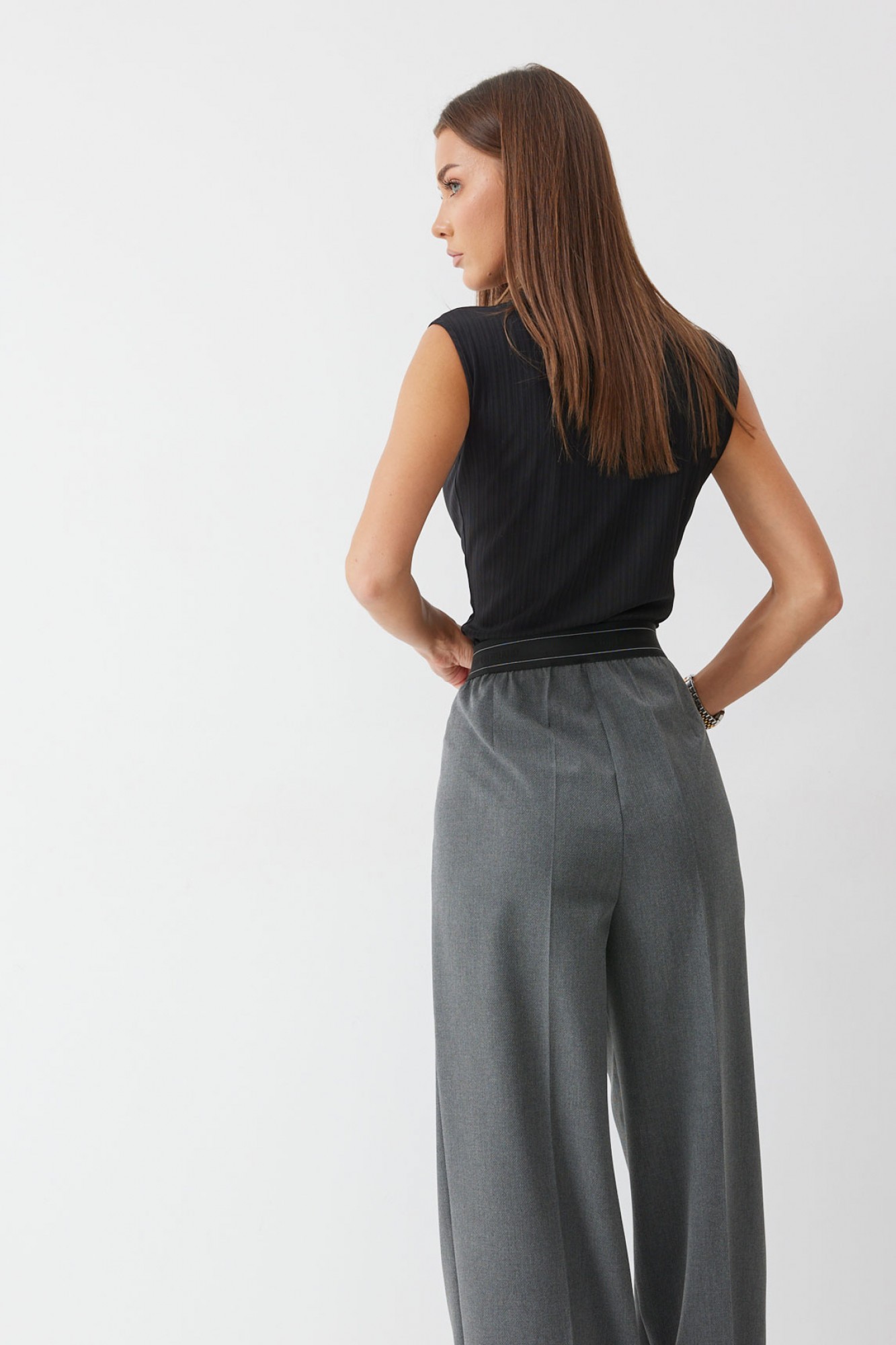 Брюки прямого силуэта из костюмной ткани. По верху брюк декоративная резинка. На передних половинках карманы и декоративные складки. На задних половинках вытачки. Обращаем ваше внимание, что фурнитура может отличаться от фото.
