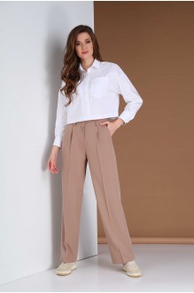 Брюки свободного кроя из поливискозной ткани с заутюженными стрелками, на стабильном поясе с застежкой по переду на молнию и пуговицу. В боковых швах карманы.