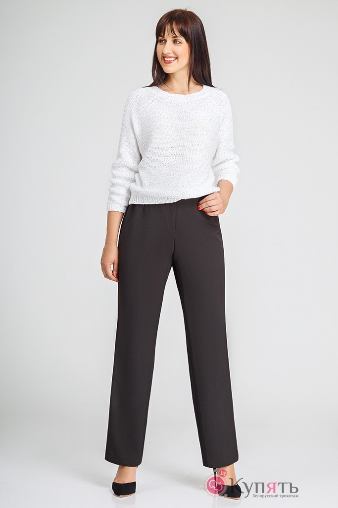Брюки женские, с притачным поясом шириной 4 см, застегивающимся на петлю и пуговицу, четыре шлевки на поясе, по бокам пояса вставлена резинка. По передним и задним частям брюк талиевые вытачки. На задних частях брюк имитация кармана с втачной листачкой. Застежка на молнию. Демисезон.