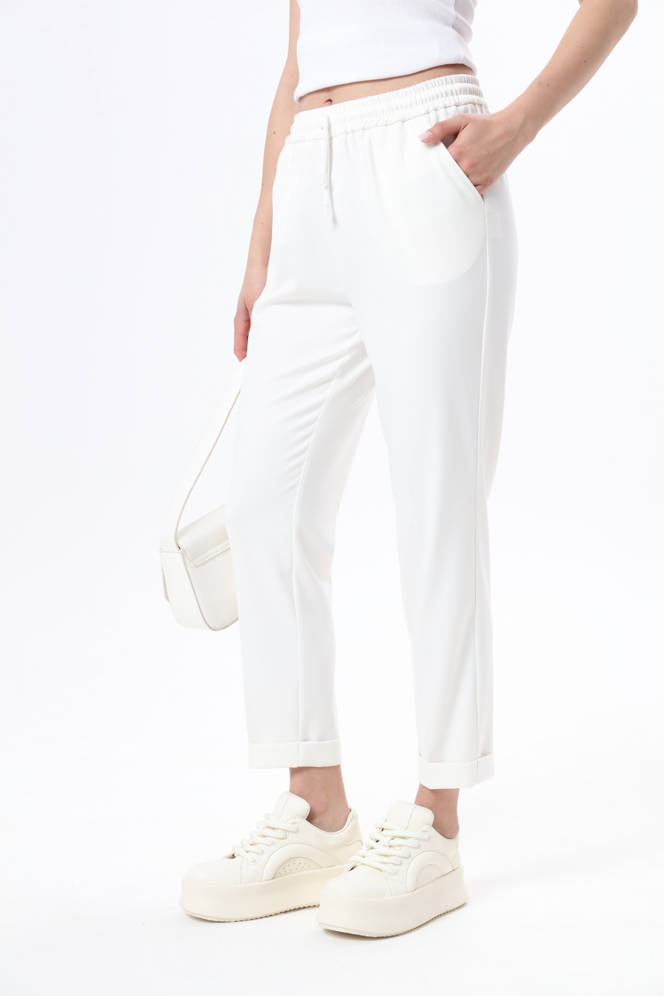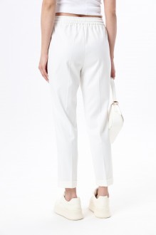 Зауженные брюки спортивного типа. Пояс на эластичной тесьме с кулисой и втянутым шнурком. Вход в карман фигурный, наклонный к боковому шву. Рост фотомодели 175 см. Размер у фотомодели – 44.