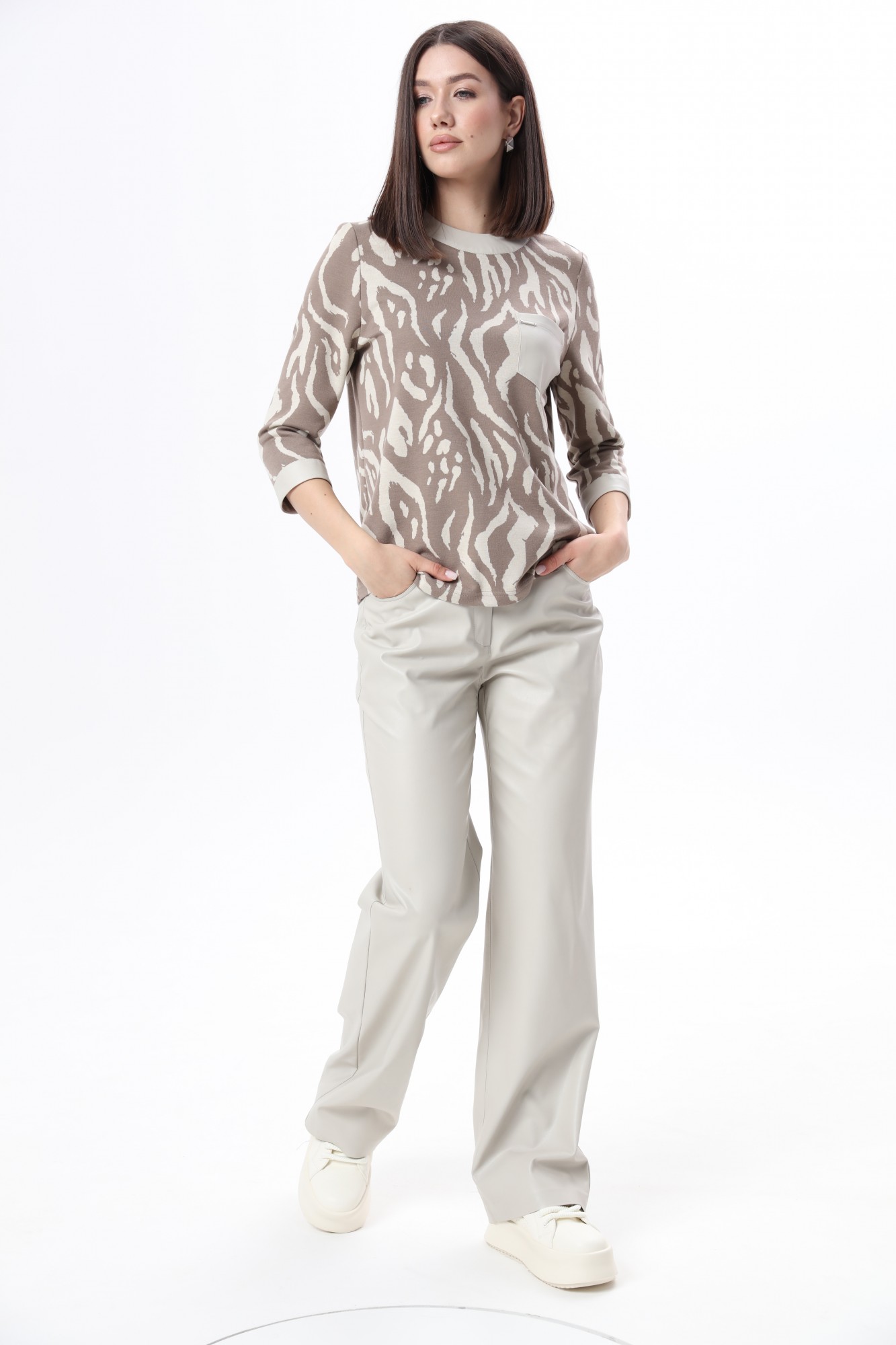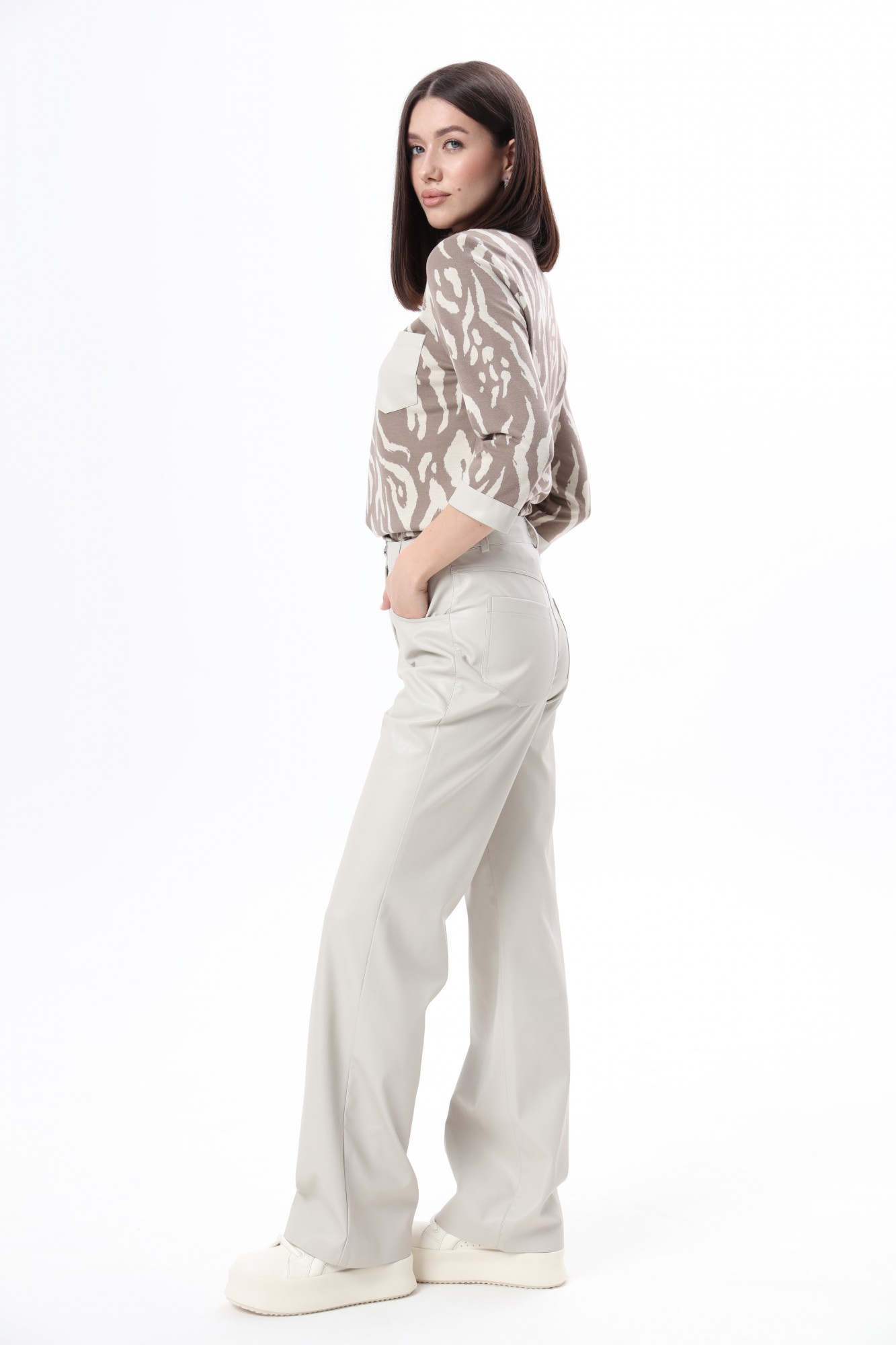 Прямые брюки из мягкой экокожи с «замшевой» изнанкой, очень приятной к телу. По переду и сзади расположены карманы по принципу джинсовых брюк. Застёжка на молнию и пуговицу. Рост фотомодели 175 см. Размер у фотомодели – 44.