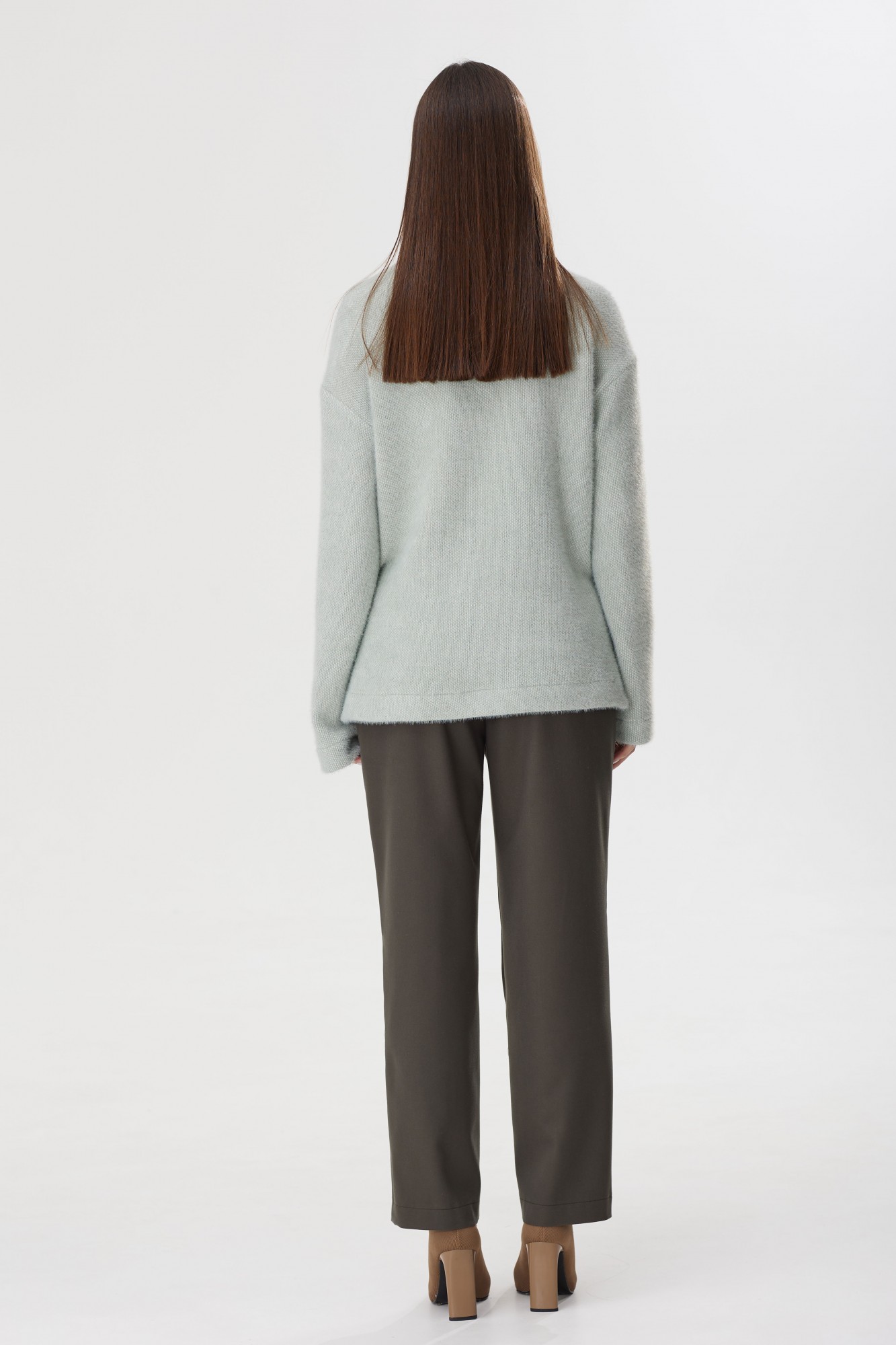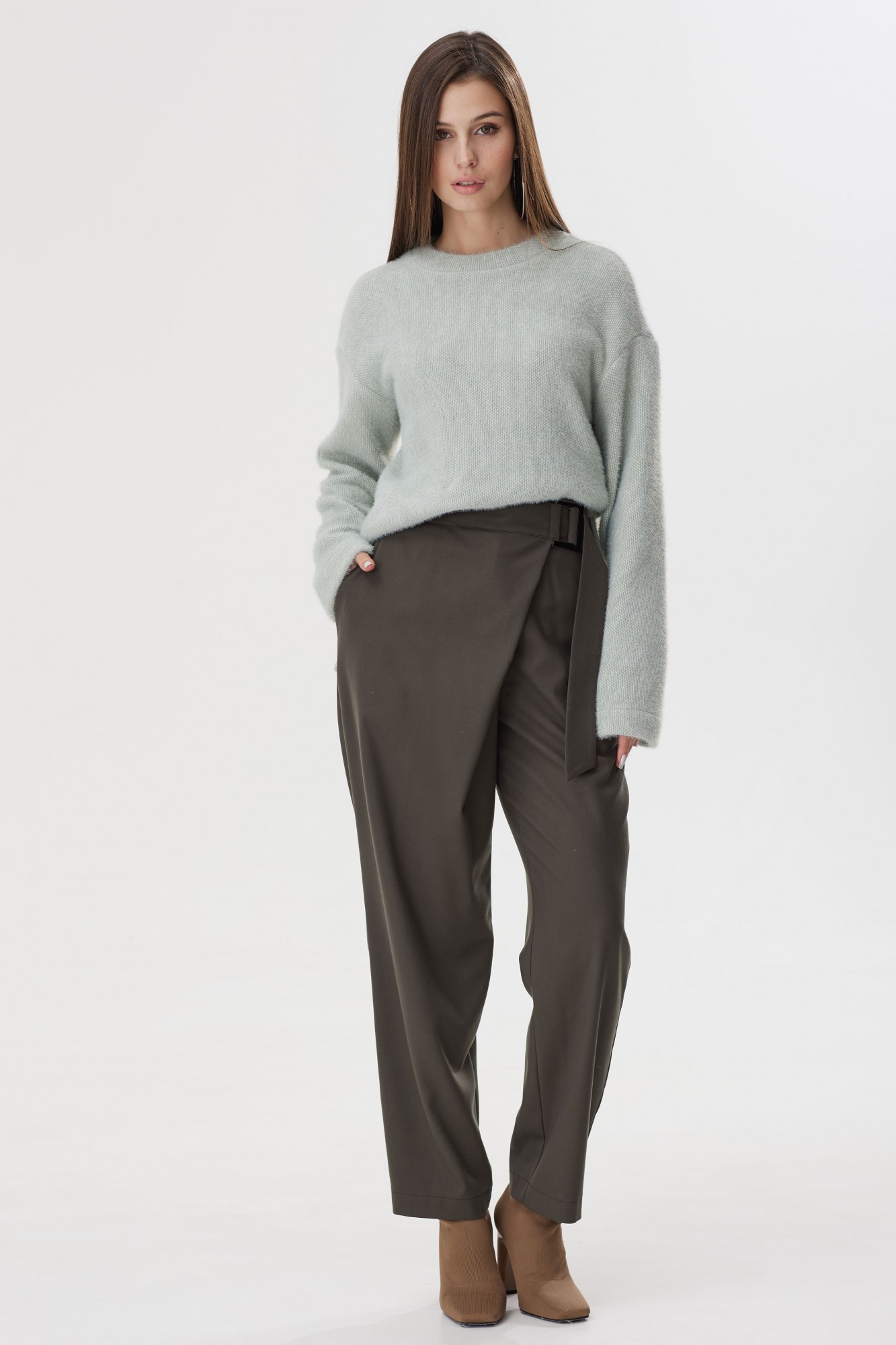 Стильные брюки на запах зауженные книзу из костюмной ткани. По верху брюки на притачном поясе с центральной застежкой на молнию. Правая брючина формирует запах с застежкой на полукольца. В боковых швах карманы. На задних половинках брюк декоративные листочки. С 48 по 60 размер в брюки на поясе вставлена эластичная тесьма (резинка).