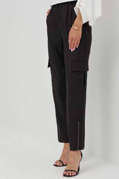 Брюки полуприлегающего покроя из костюмной ткани. По верху брюк притачной пояс с застежкой на петлю и пуговицу и шлевками для ремня. С 50 по 60 размер предусмотрена резинка по спинке. На передних половинках обработаны наклонные карманы и застежка молния в среднем шве. На задних половинках вытачки. По переду брюк декоративные карманы с клапанами, по низу - молнии.