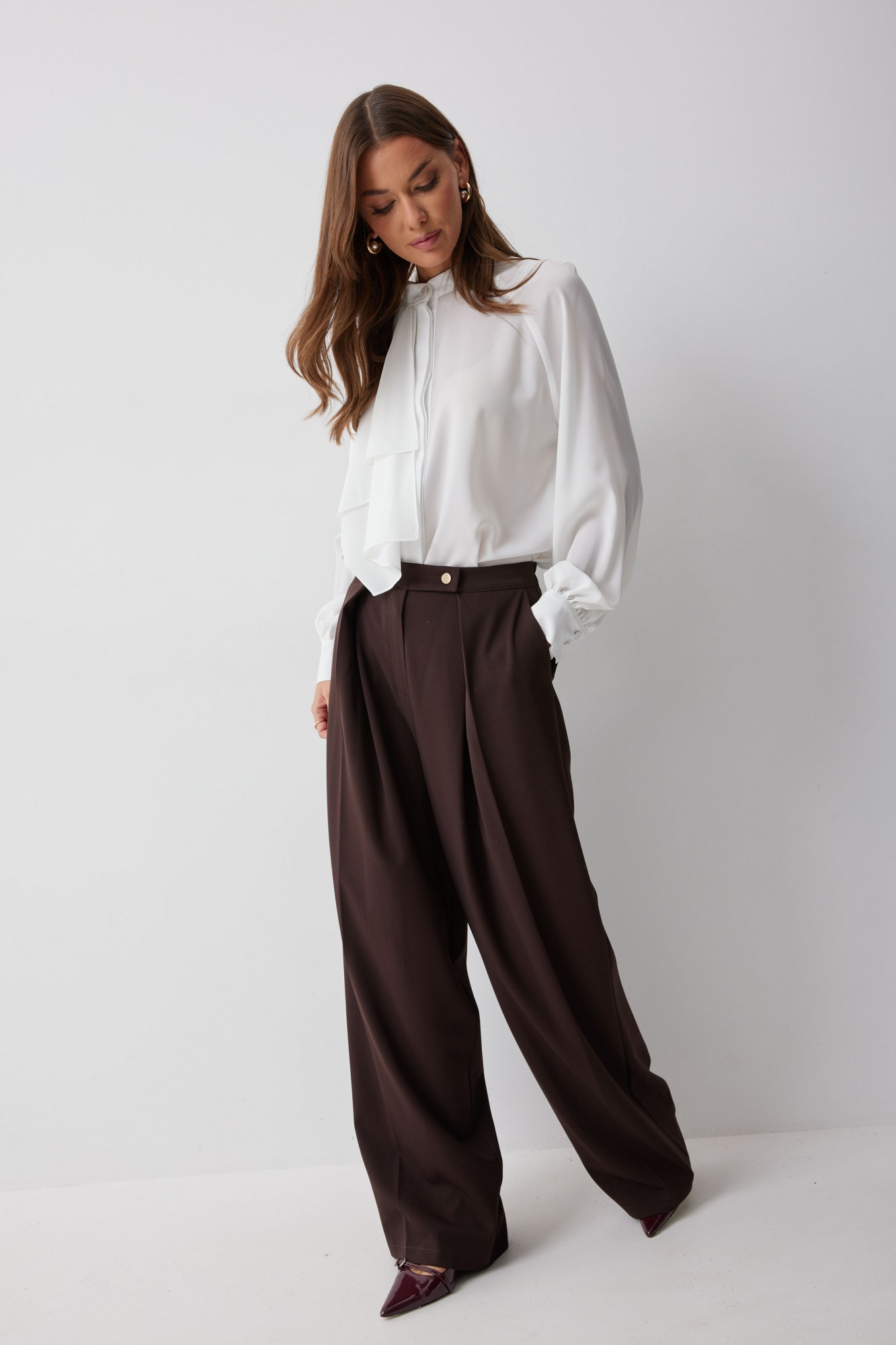 Брюки прямого силуэта расширенные книзу из костюмной ткани. По верху брюк притачной пояс с застежкой на петли и пуговицы. На передних половинках обработана застежка молния в среднем шве. На передних половинках карманы и декоративные складки. По поясу задних половинок брюк резинка и вытачки. Обращаем ваше внимание, что фурнитура может отличаться от фото.