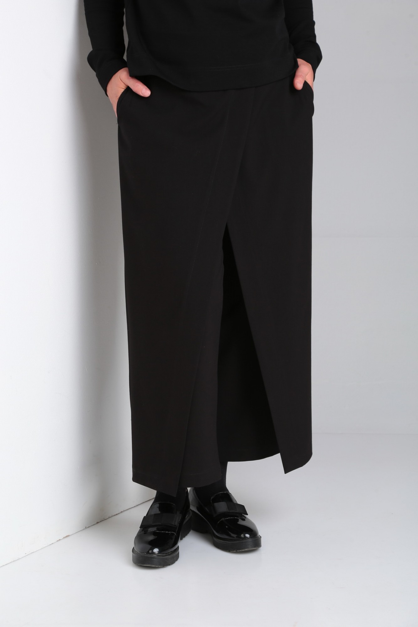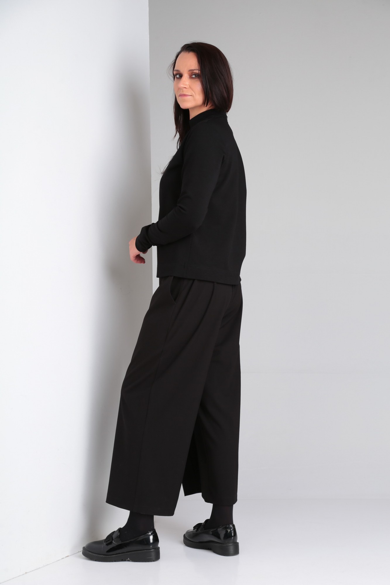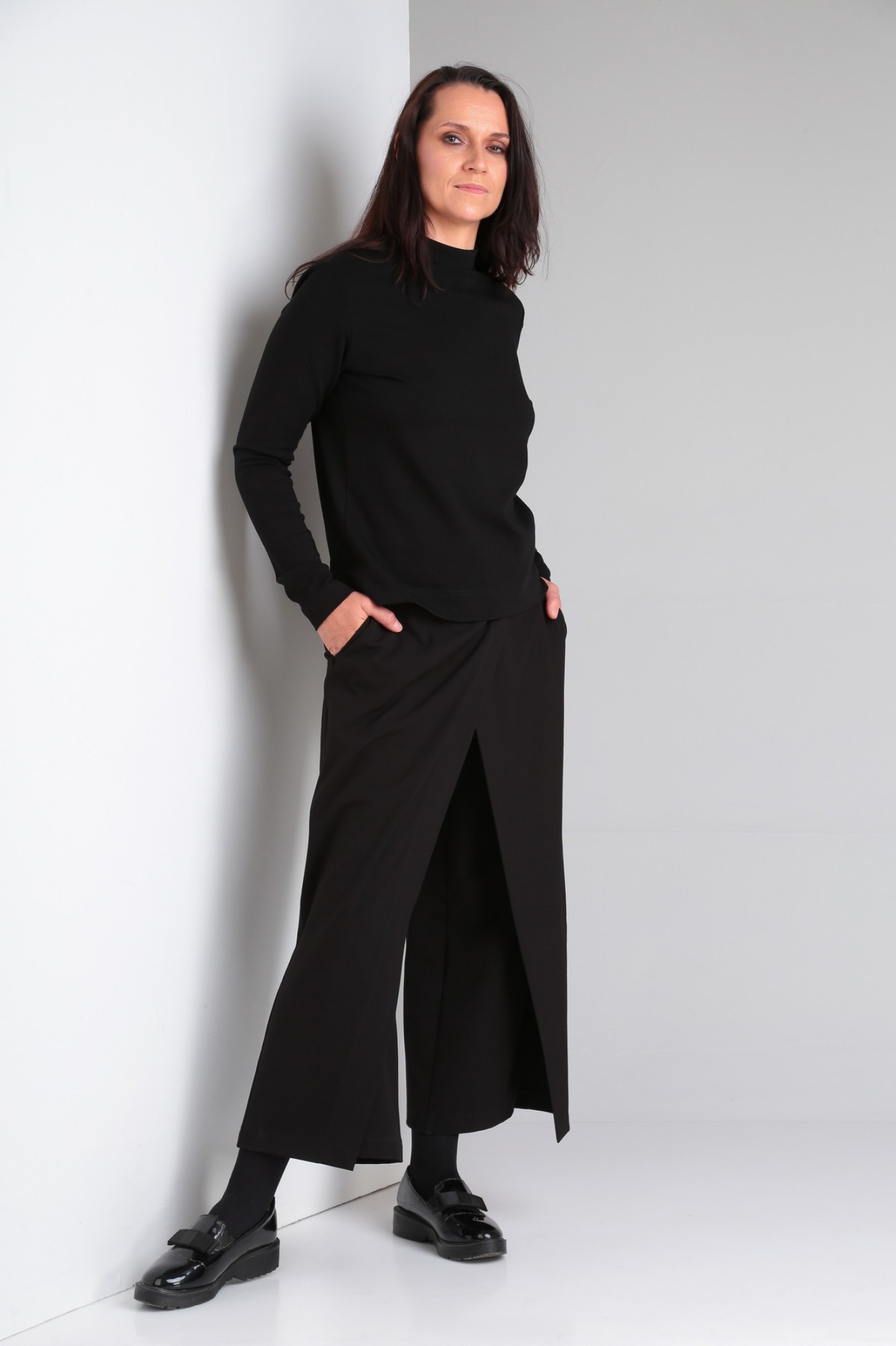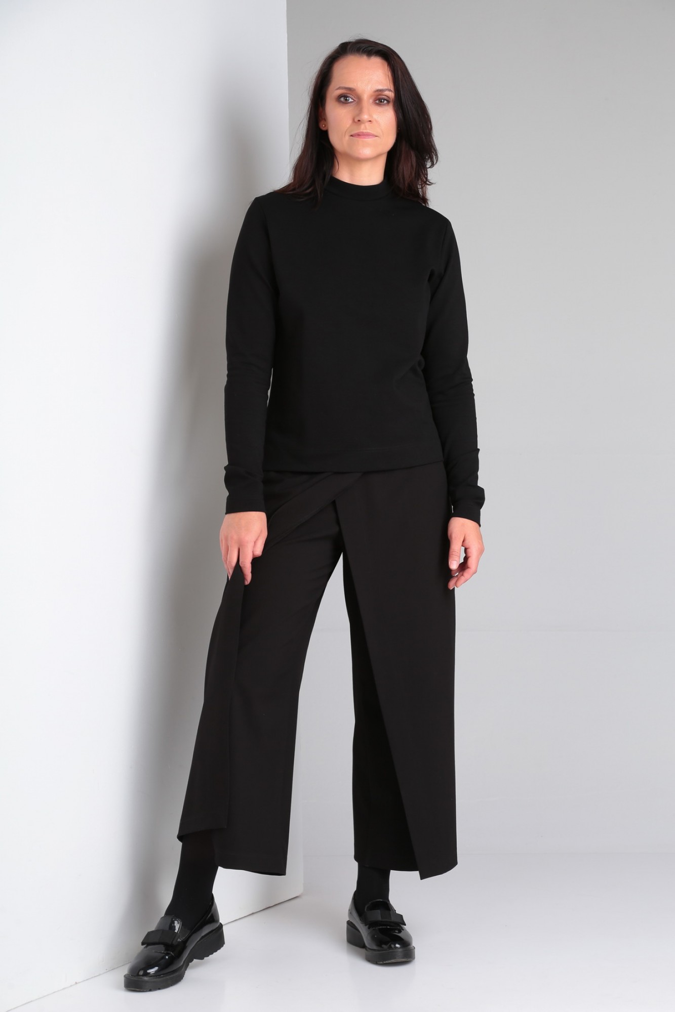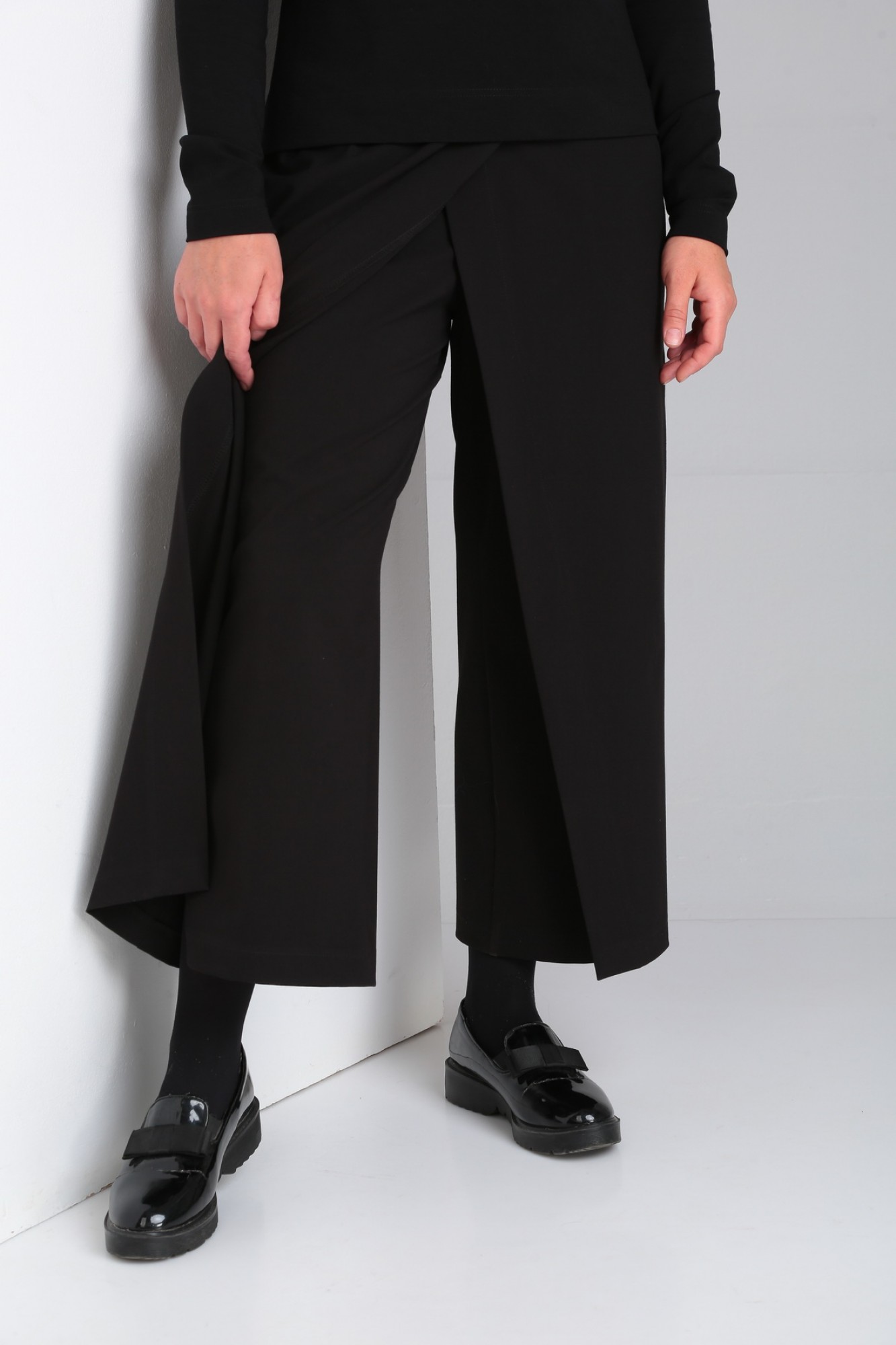 Кюлоты из мягкой, струящейся ткани с запахом по переду. Застежка на потайную тесьму-молнию в боковом шве. Пояс регулируется по спинке резинкой.