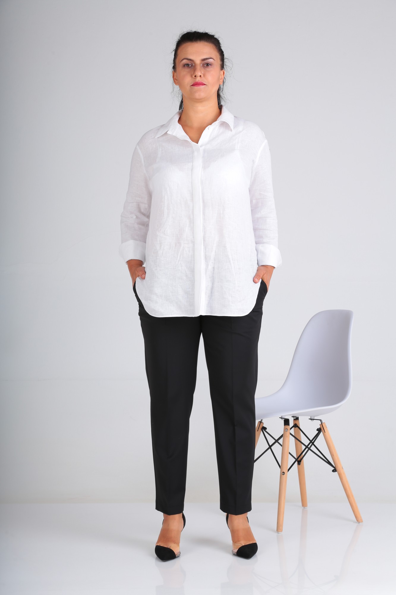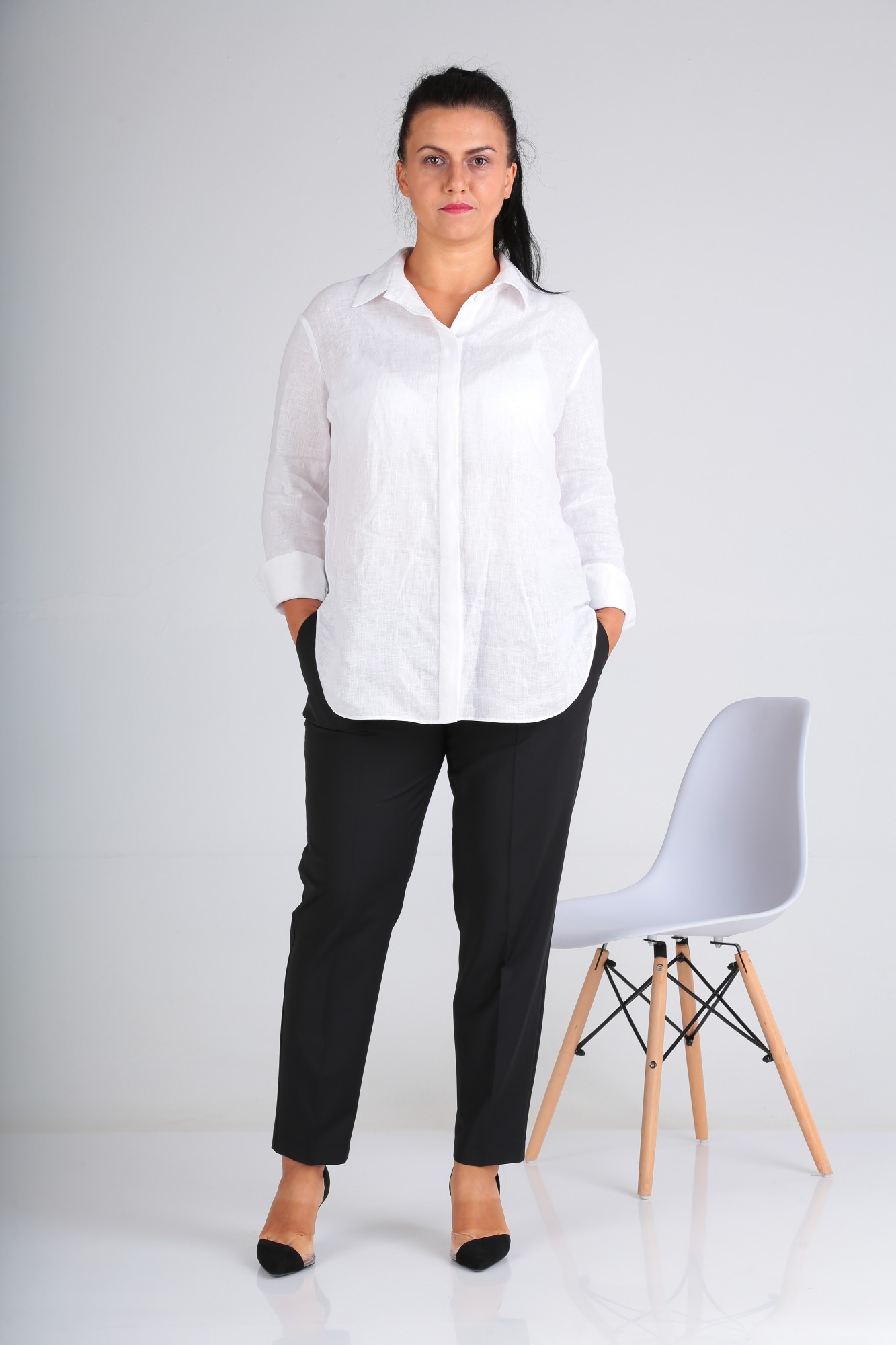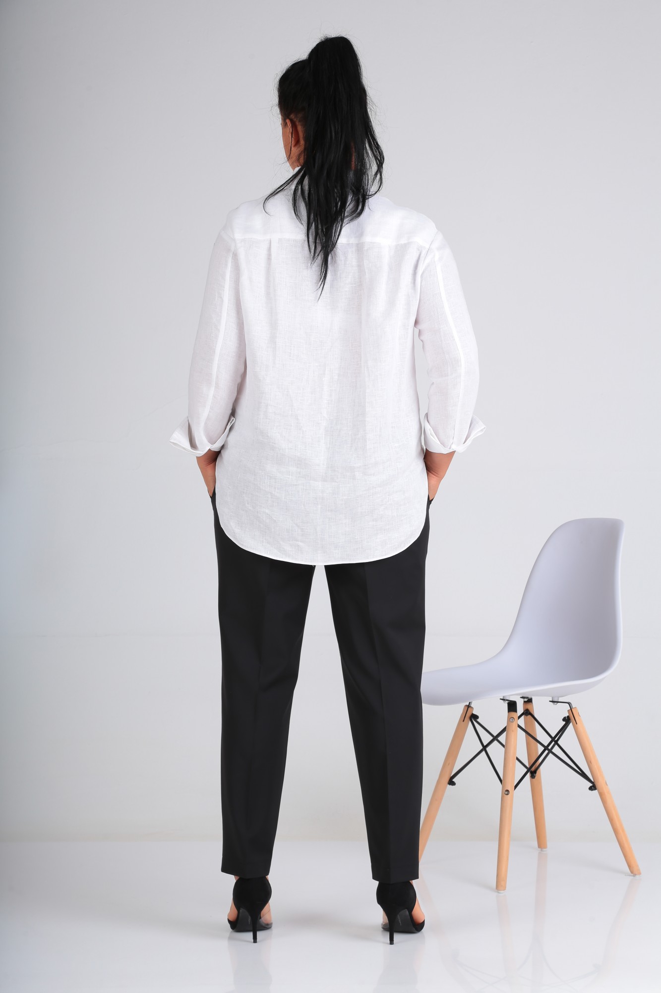 Классические брюки длиной до щиколотки, с боковыми карманами. Карман обработан в отрезном бочке. С классической посадкой по линии талии.
