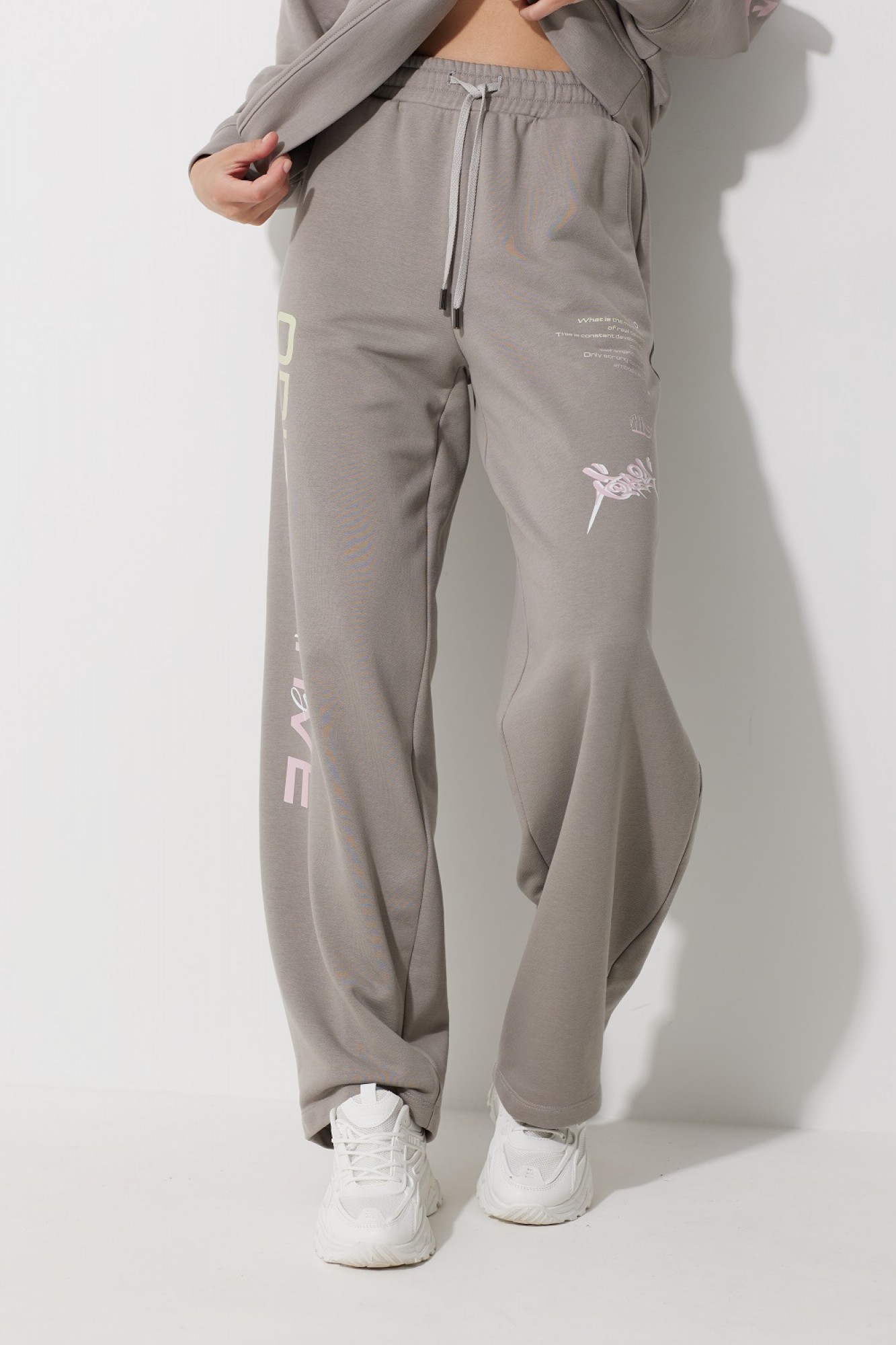 Мешковатые брюки бэги свободного кроя. Выполнены из трикотажного полотна футер 3-х нитка. В боковых швах имеются карманы. Пояс притачной на эластичной тесьме с декоративным шнуром. По переду изделия разположены печати.
