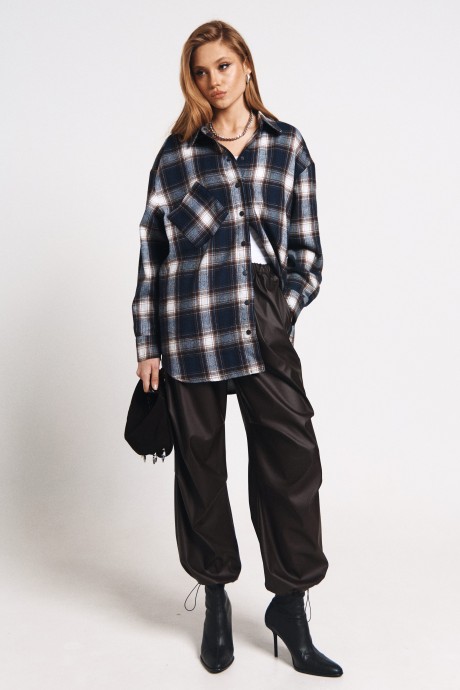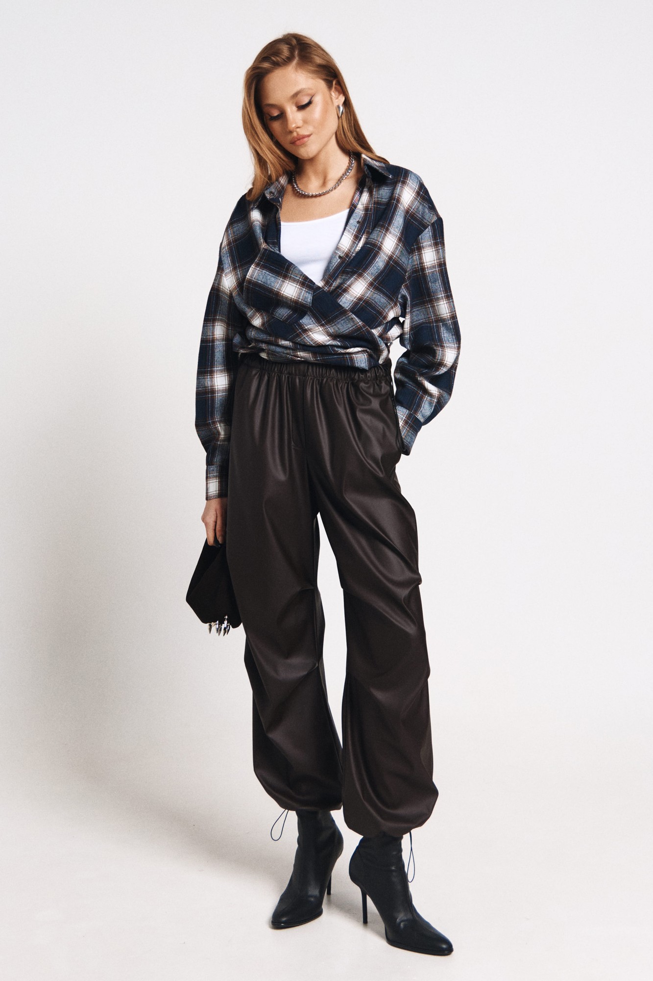 Брюки актуального силуэта с резинками и фиксаторами ширины по талии и по низу брюк. Декоративная нашивка-декор на заднем кармане.