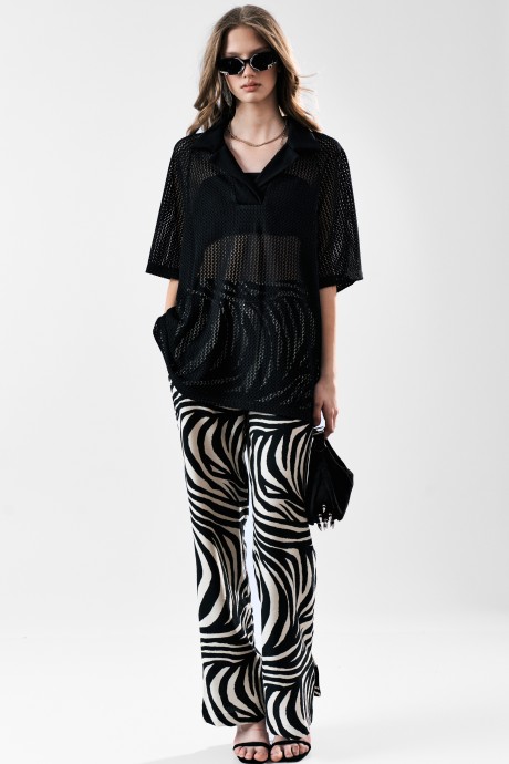 Брюки палаццо, пояс на резинке. Карманы в боковом шве. Разрез по низу брючин.
