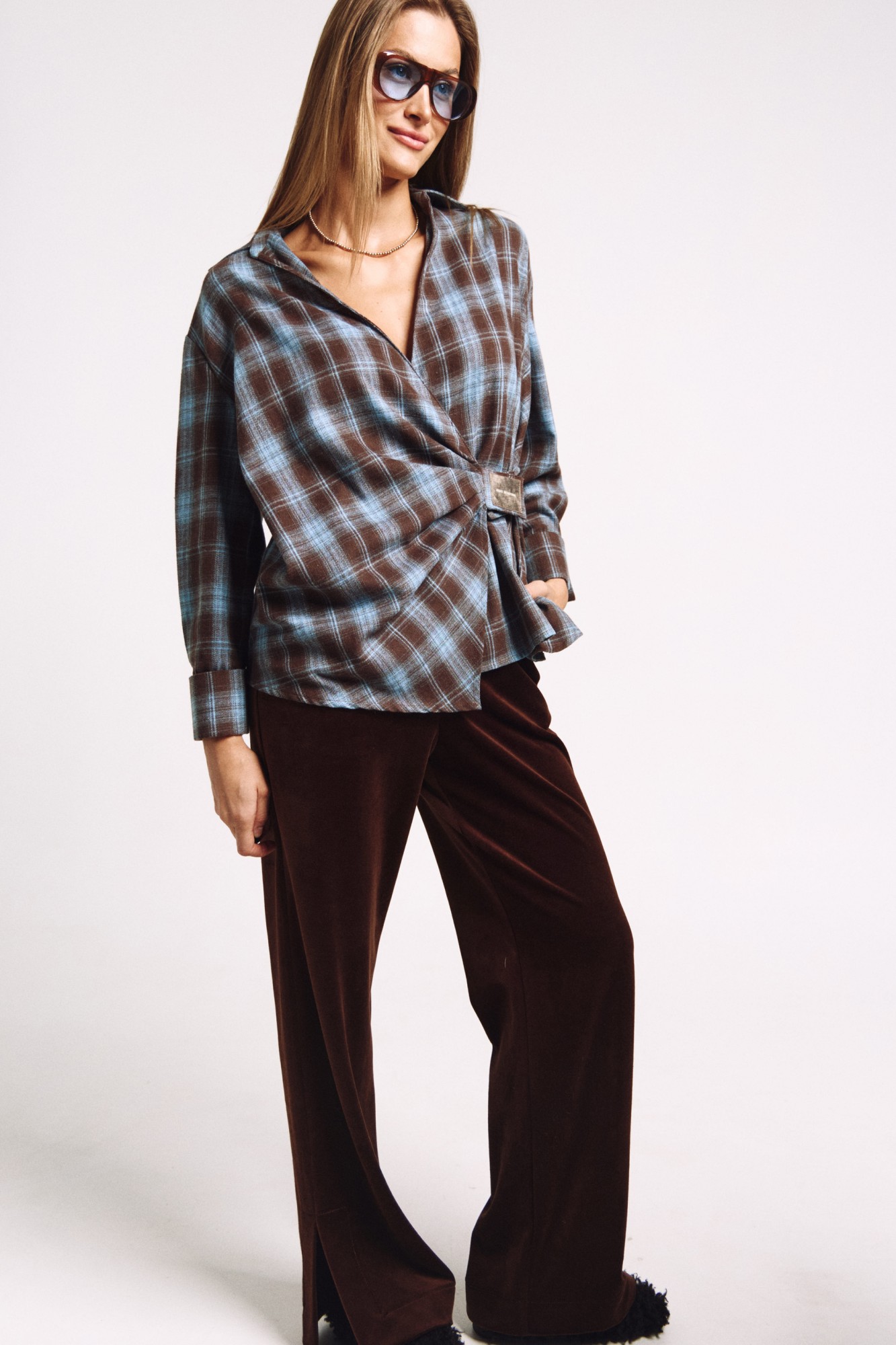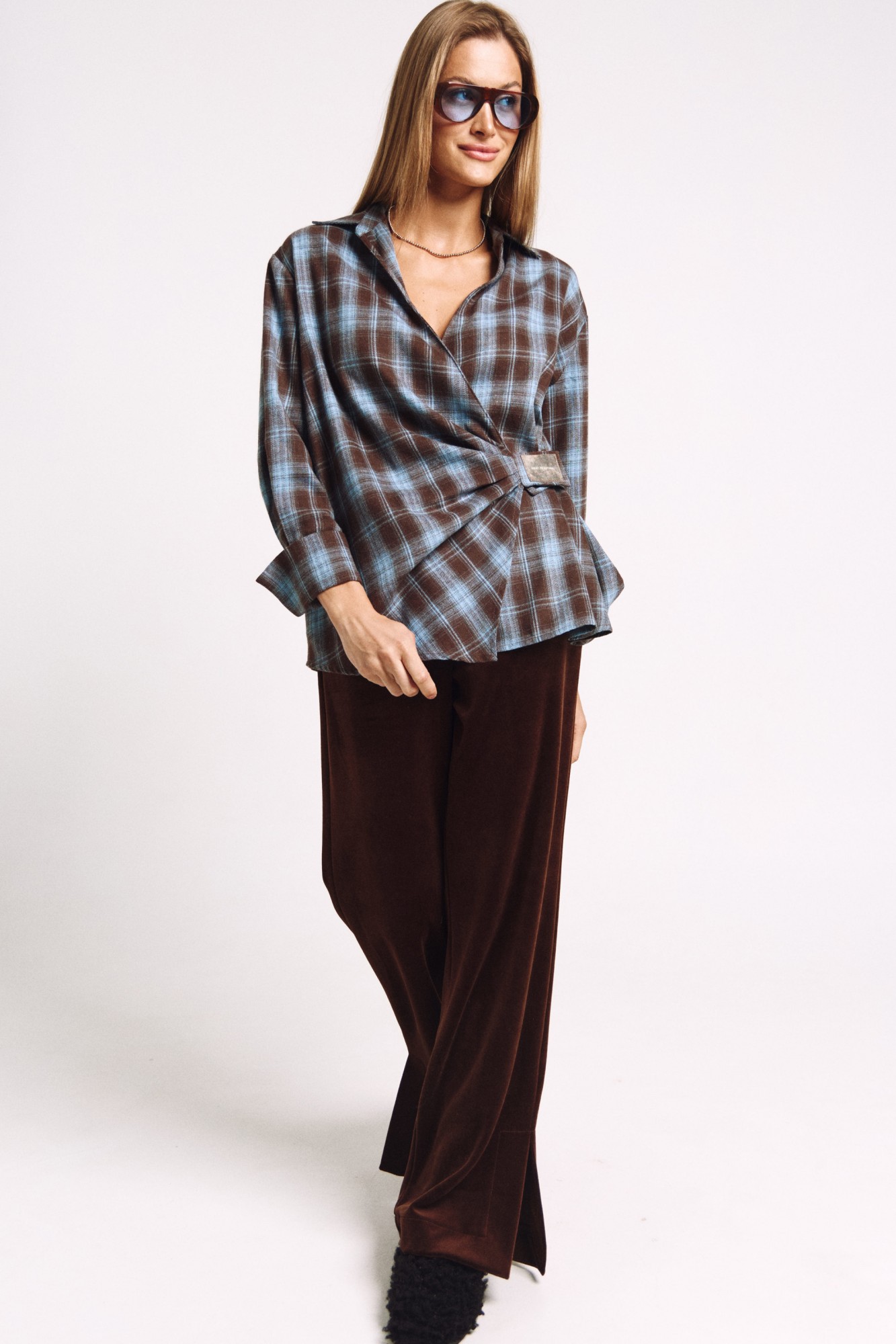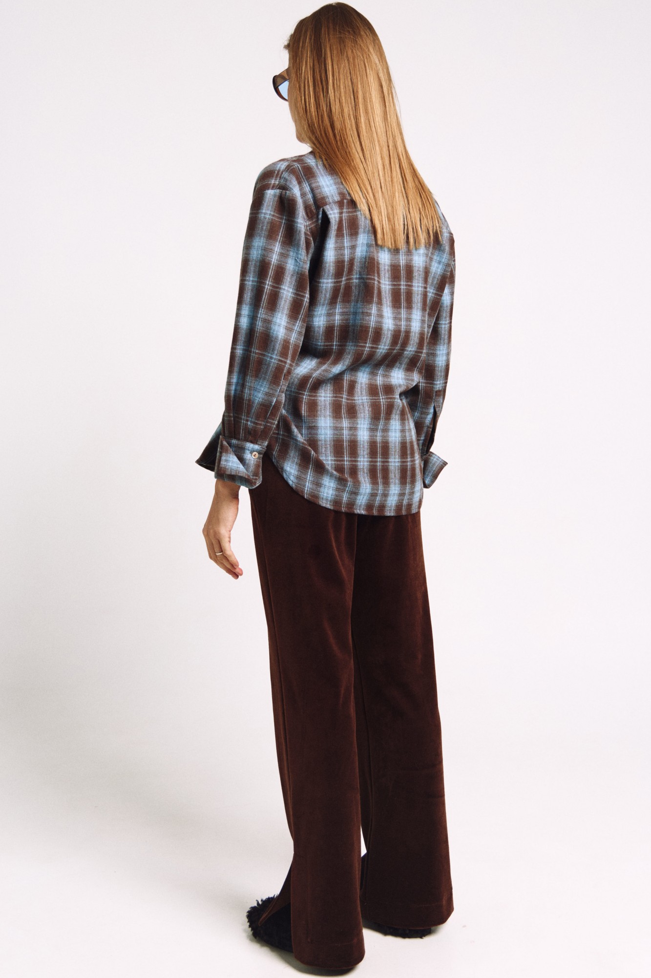 Брюки бархатные, глубокого коричневого цвета. Ворс среднего размера. Карманы в боковых швах. Средняя посадка. Пояс на резинке. По низу брюк - разрез по внешнему шву. Два универсальных размера - S (соответствует 42-44-46), L (соответствует 48-50-52).