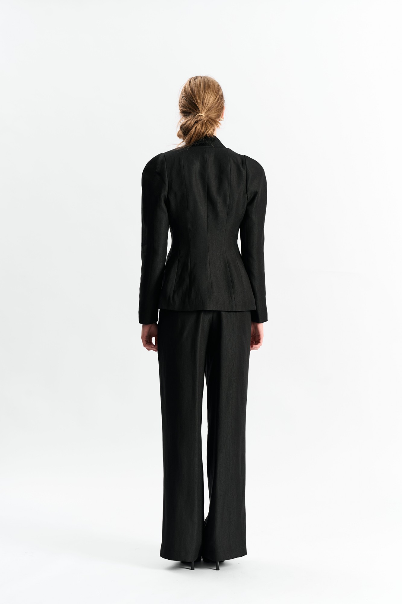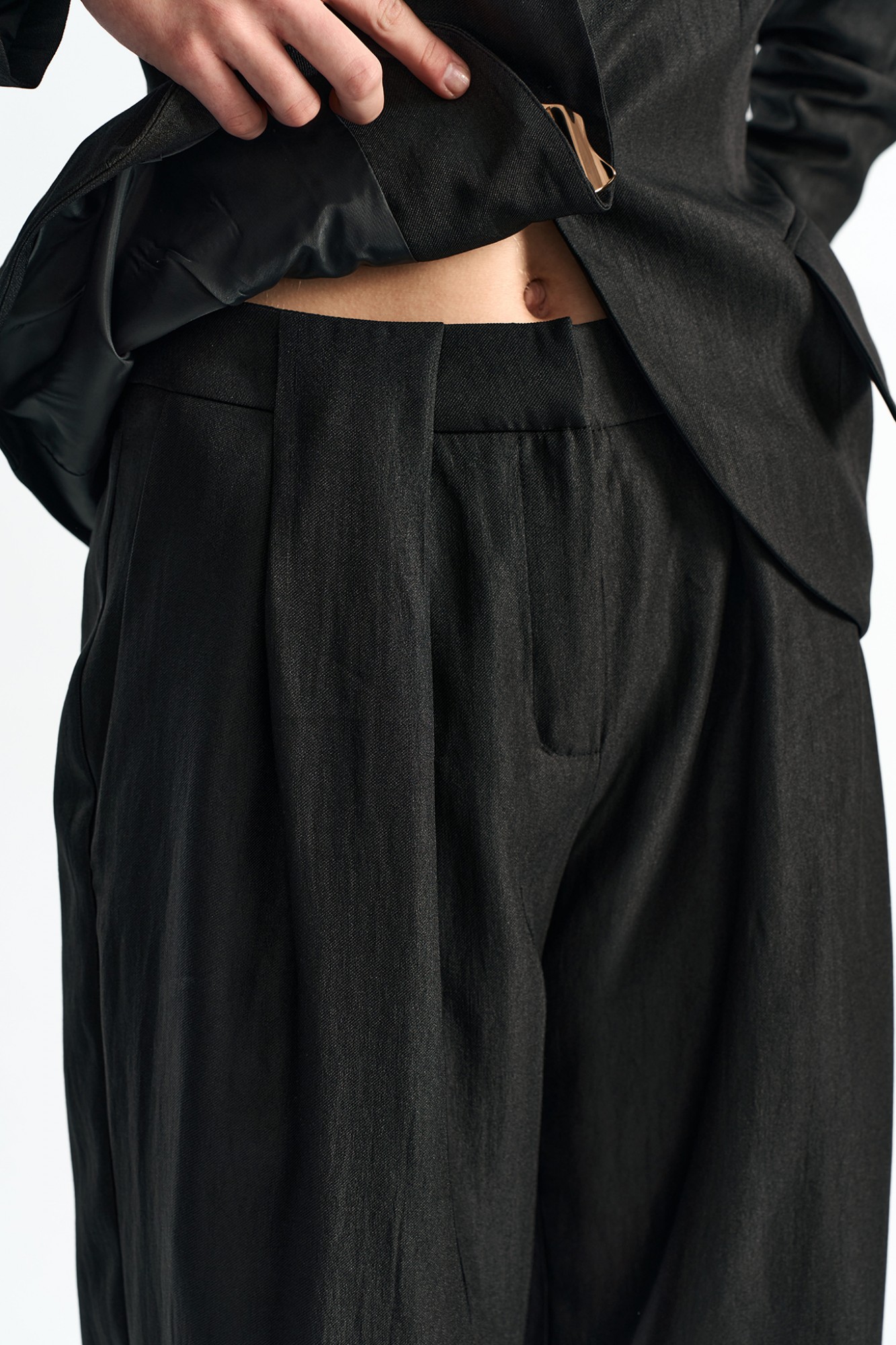 Брюки-палаццо умеренной ширины с акцентной складкой, переходящей на пояс.