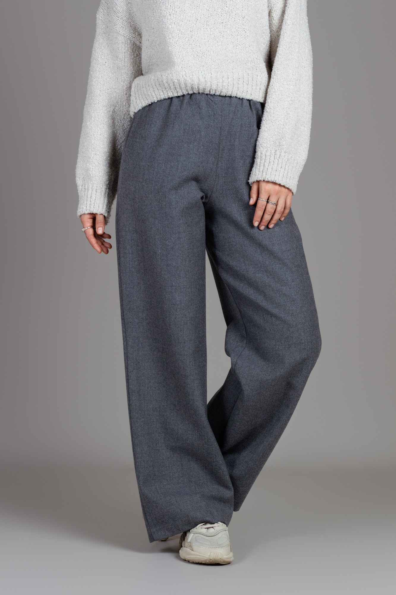 Брюки свободного кроя, прямые книзу, с завышенной талией и карманами в боковых швах. Пояс широкий на резинке, ширина пояса 6 см.