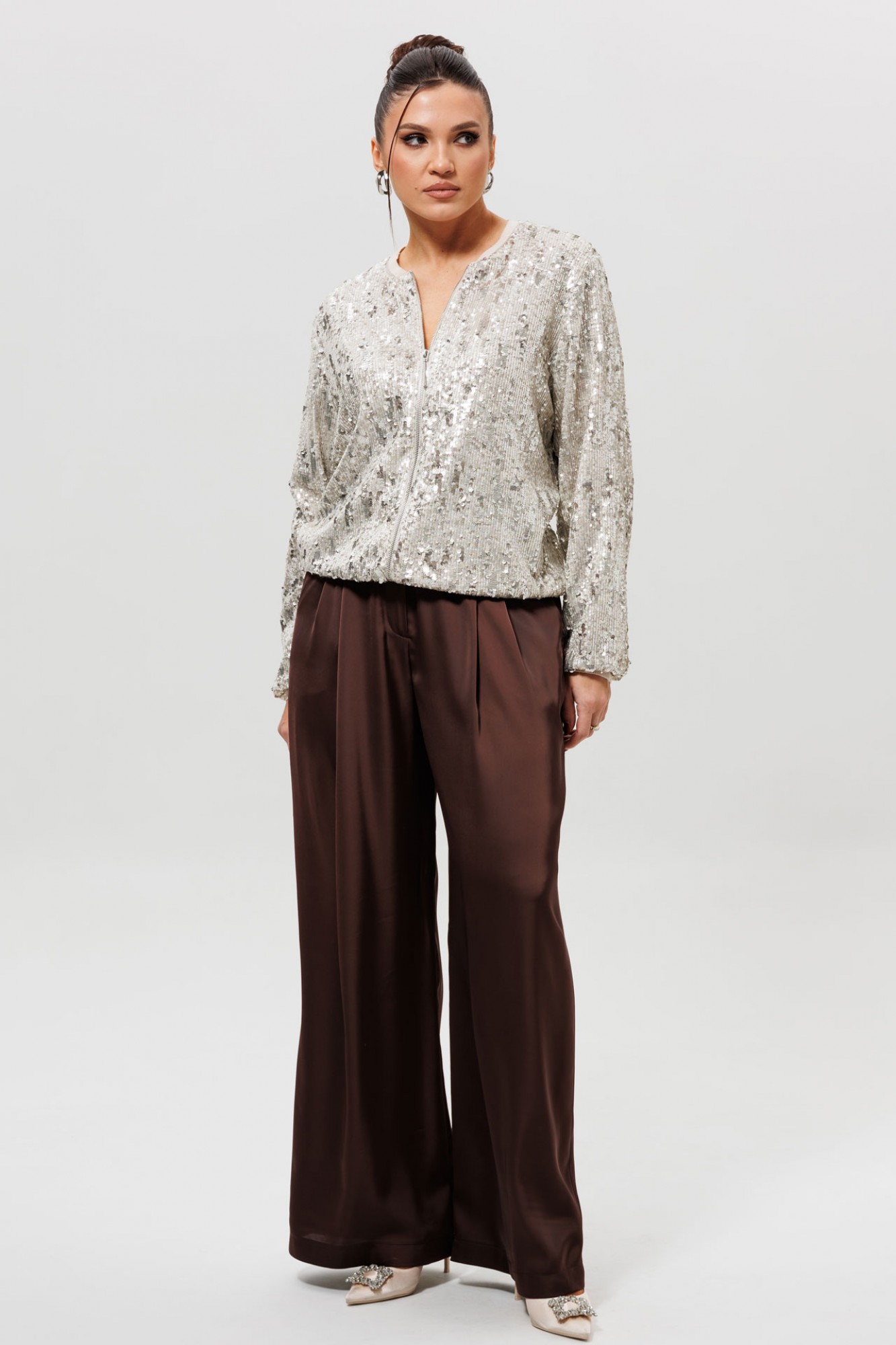 Брюки выполнены из атласной ткани, расширены к низу. На передних половинках брюк обработаны 2 складки и боковые карманы. На задних – талиевые вытачки. Застёжка на молнию и 2 потайных крючка. Эти атласные брюки (Арт. 1282) — Must Have для создания безупречного вечернего или праздничного образа. Модель представлена в двух богатых оттенках: насыщенном красном и глубоком шоколадном. Брюки выполнены из атласной ткани, которая мягко струится, подчеркивая изящество каждого движения. Универсальный крой позволяет сочетать их как с атласными топами (арт.1164) и блузами (например арт.1280) для выхода в свет, так и с кашемировыми джемперами для создания смарт-кэжуал образа. Атласные брюки с завышенной талией обеспечивают комфортную посадку и визуально вытягивают силуэт.