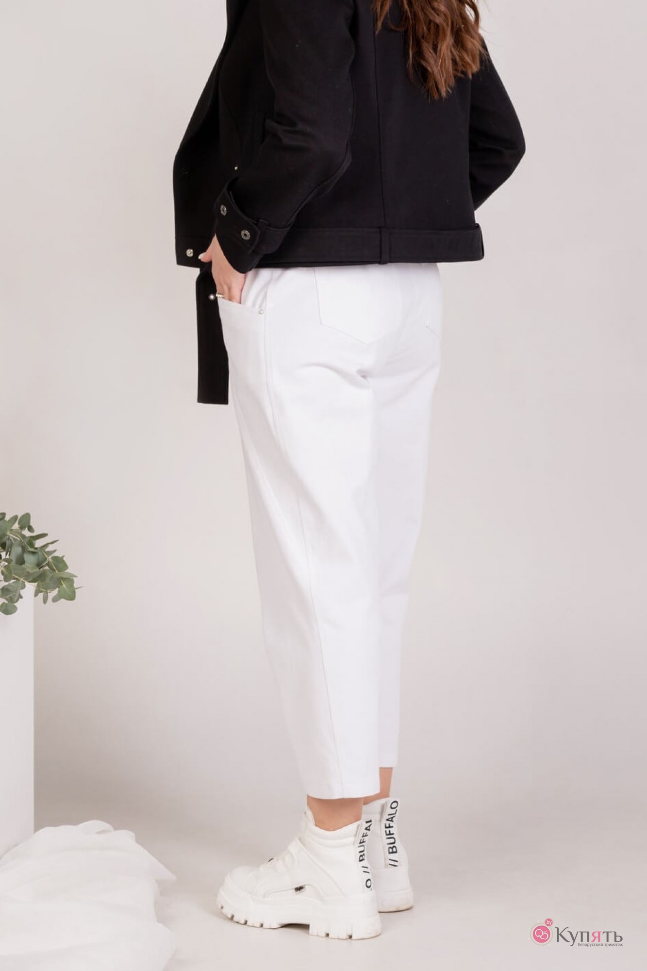 Брюки с высокой посадкой слегка зауженные к низу, на притачном поясе. По переду застёжка молния с гульфиком и откоском, косые подрезы и втачные карманы. Пояс застёгивается на прорезную петлю и пуговицу. Спинка с талевыми вытачками и накладными карманами на задних половинках брюк. Украшают брюки хольнитены и отделочные двойные строчки.