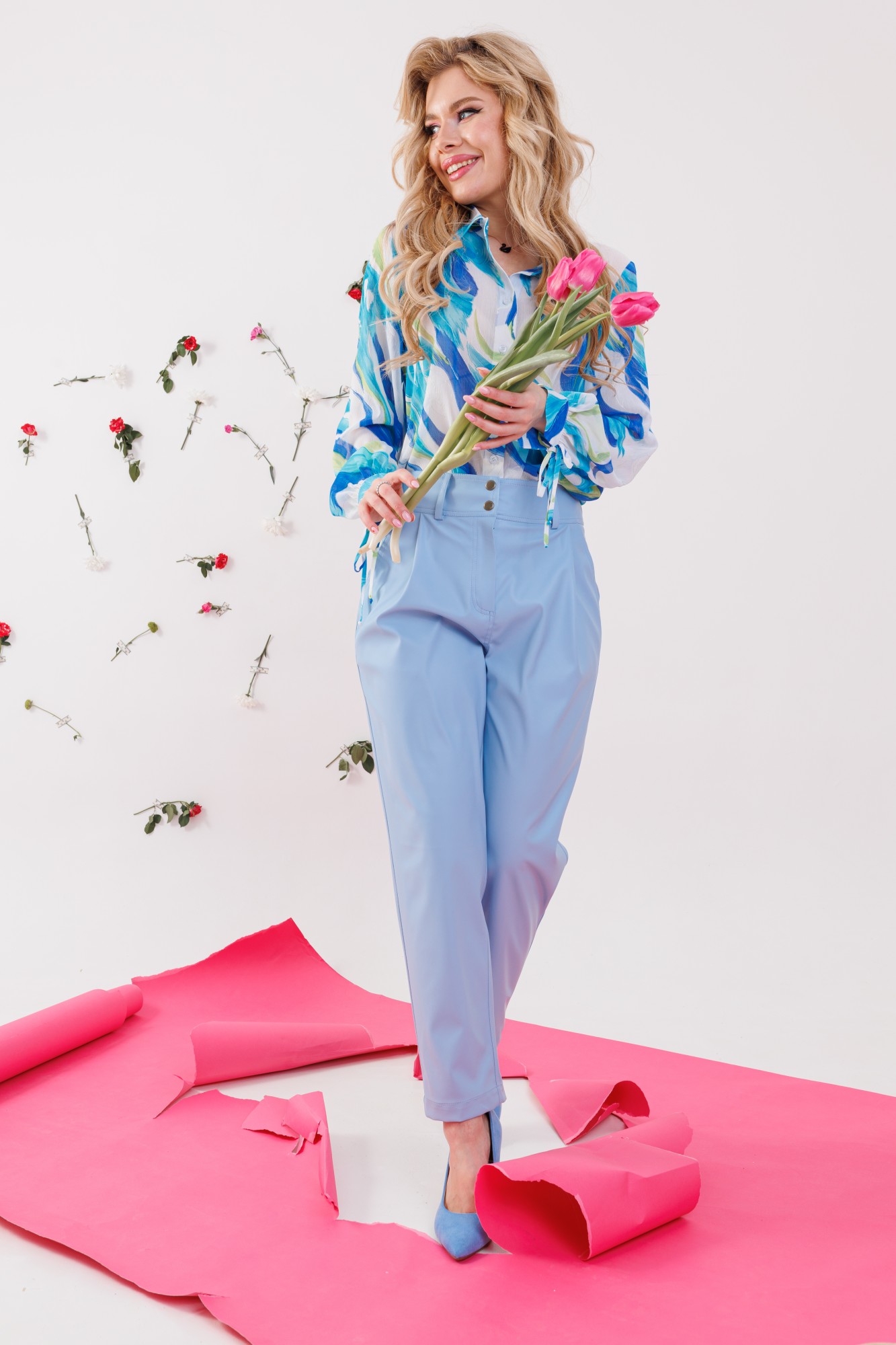Комфортные брюки из экокожи свободного кроя со складками и карманами по переду. Пояс притачной со шлёвками и центральной застёжкой на гульфик и молнию. По спинке изделия накладные карманы.