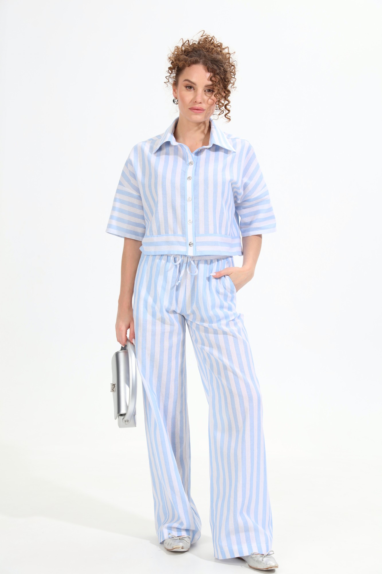 Брюки свободного кроя сочетают элегантность и комфорт. Широкая резинка на поясе с завязками и наличие функциональных карманов подчеркивают удобство модели.