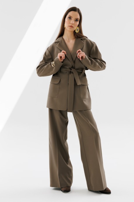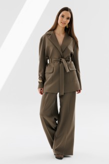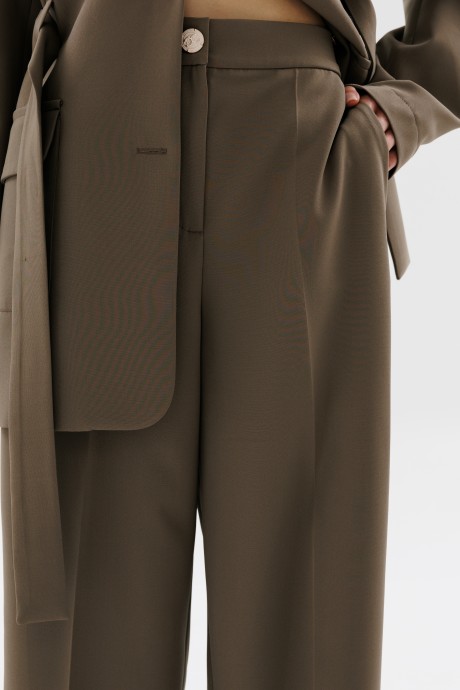 Брюки прямого кроя. На передних половинках брюк карманы с наклонным входом и отрезной боковой частью. Пояс притачной, подкройной. Линия талии приспущена.