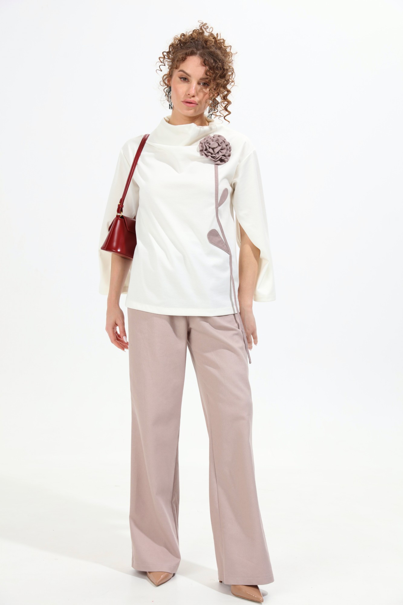 Прямые брюки с двойным поясом из отделочной контрастной ткани. Изделие по линии талии на резинке с имитацией гульфика. Карманы с отрезным бочком.