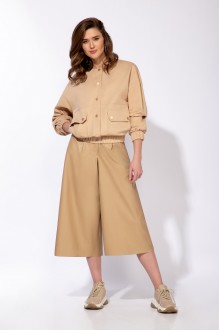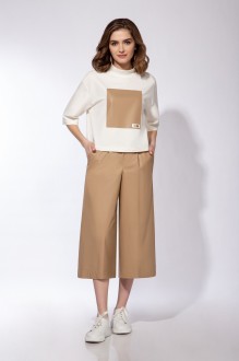 Кюлоты с высокой талией, расширенные к низу, с притачным поясом. Застежка на тесьму-молнию и 1 петлю и пуговицу-болт. На передних половинках обработаны по 1 складке-вытачке, в боковых швах наклонные карманы. На задних частях брюк обработаны по 1 вытачке на каждой половинке.