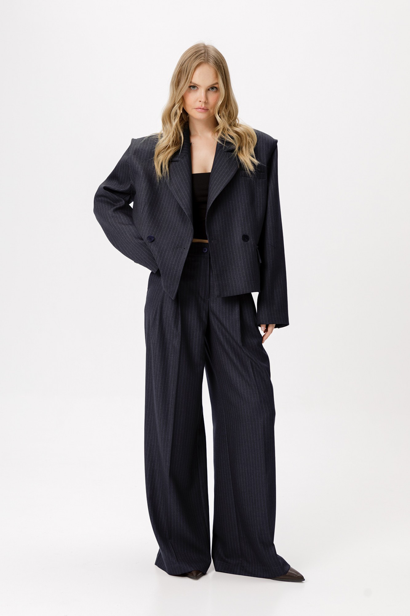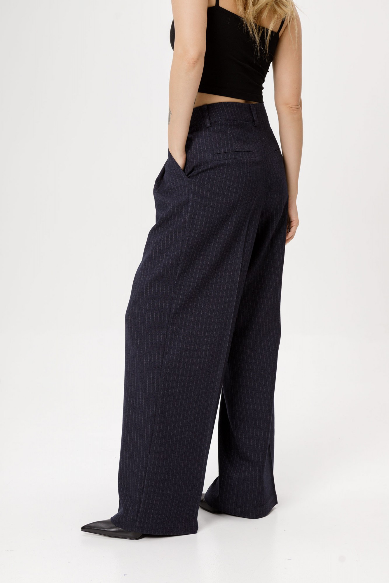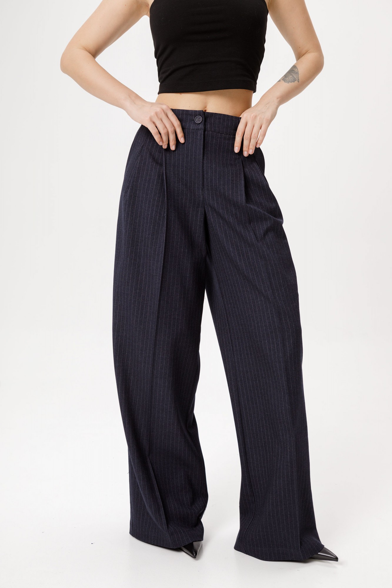 Широкие брюки-палаццо в полоску. Детали: брюки с притачным поясом со шлевками, складки у пояса, застежка на молнию и пуговицу, боковые карманы, заутюженные стрелки. Задние части брюк с вытачками и имитацией карманов.