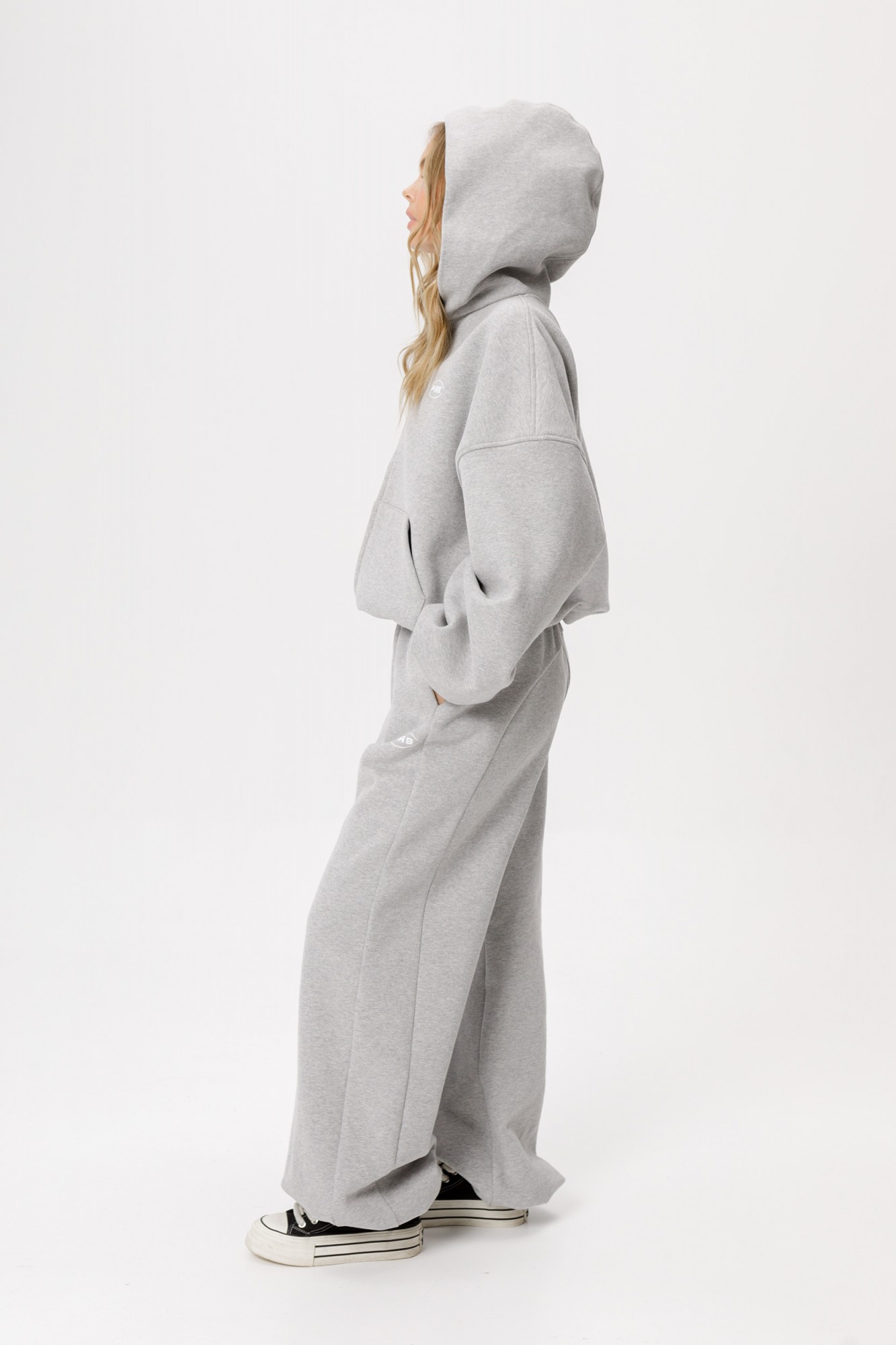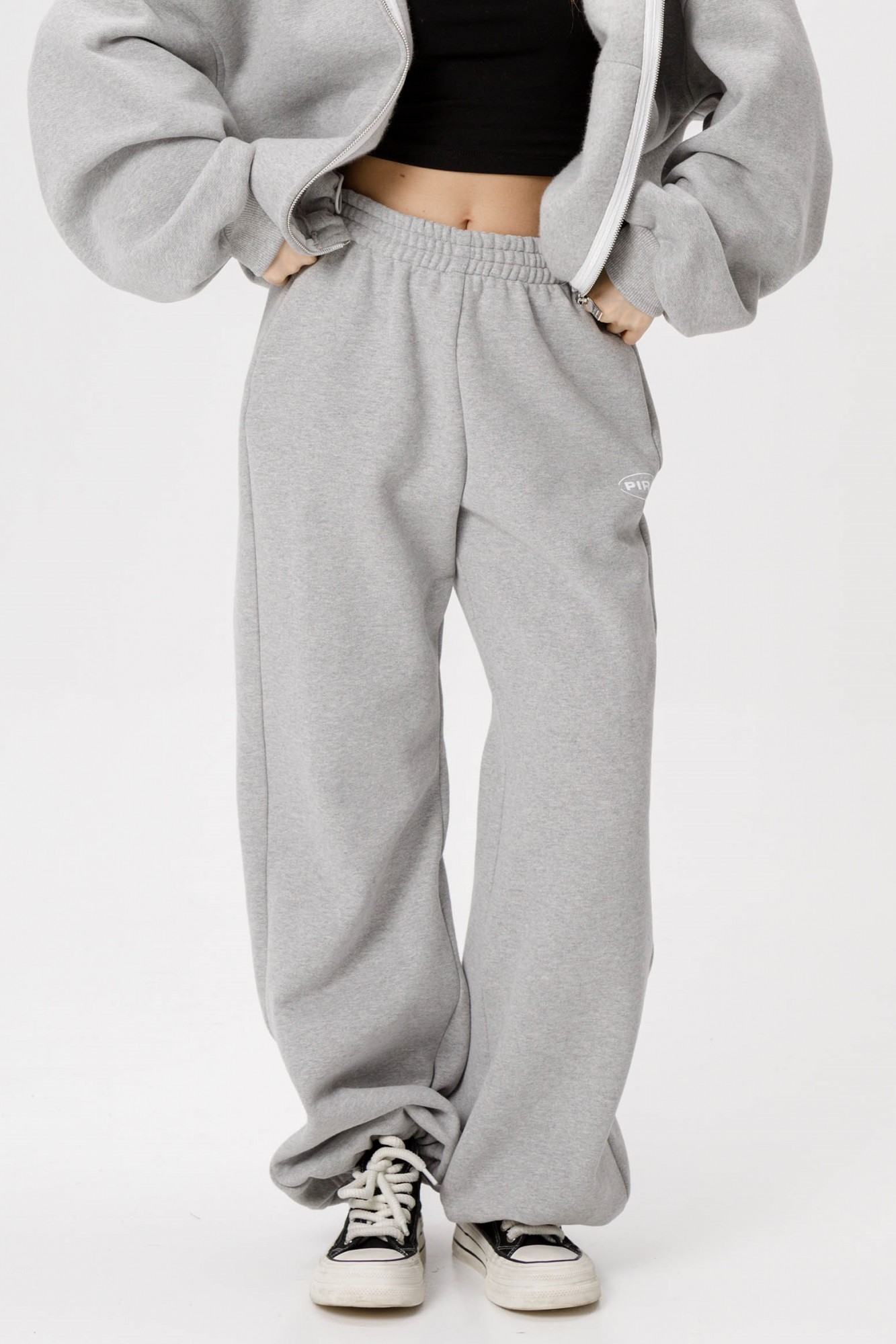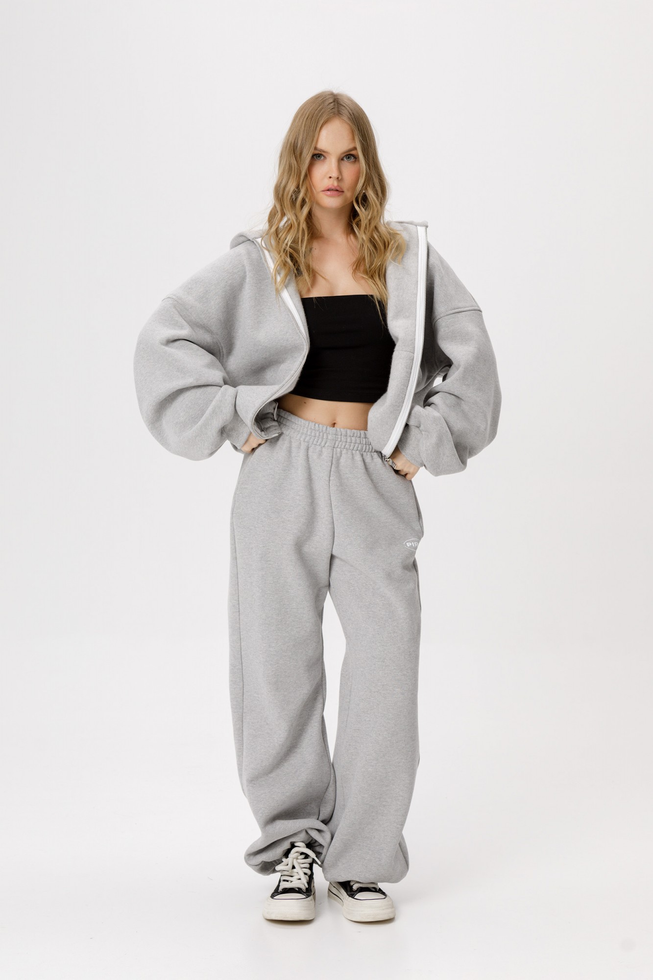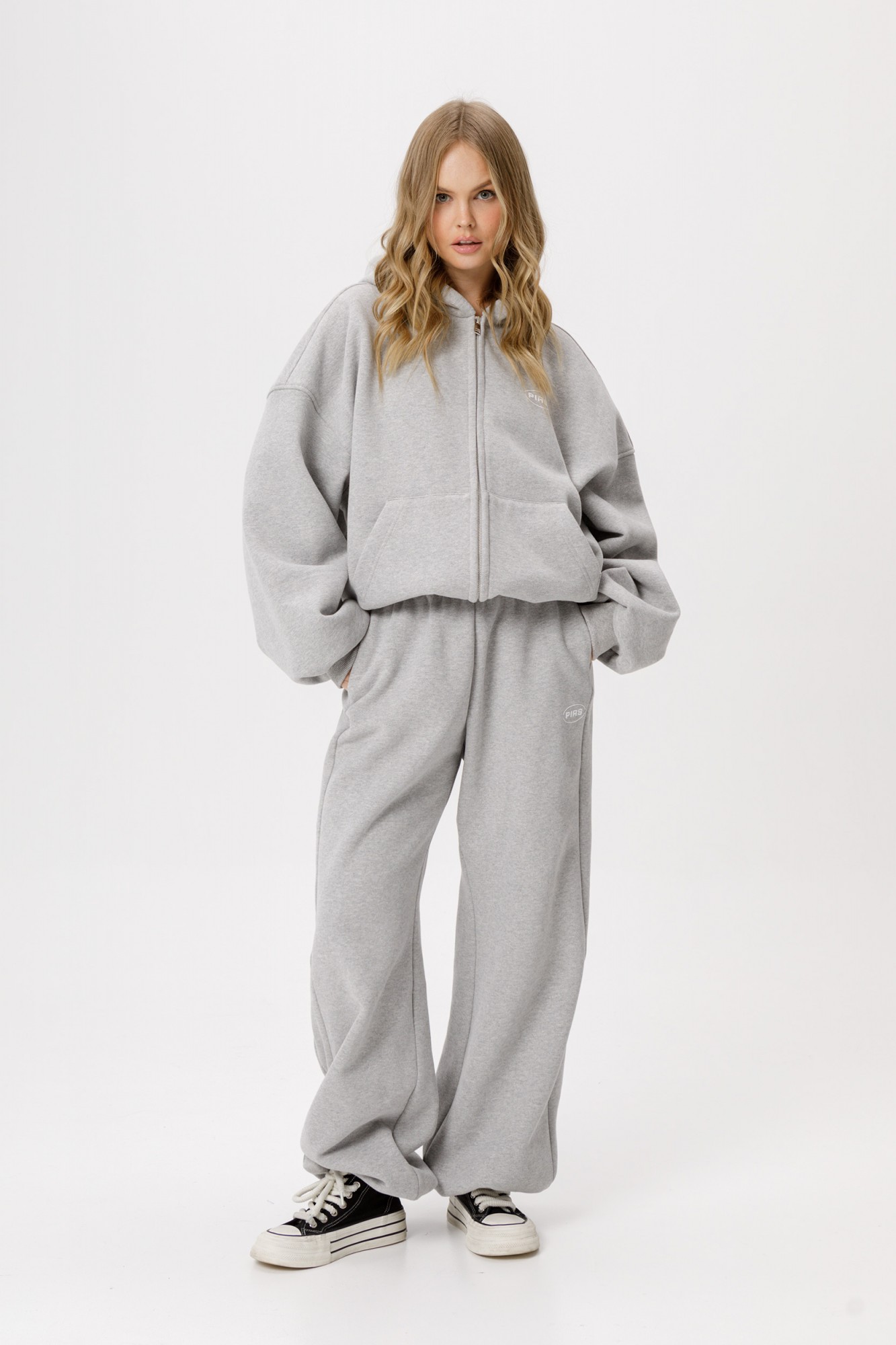 Спортивные свободные брюки из трехнитки с начесом. Детали: брюки широкие с рельефными швами и регулировкой по низу, боковые карманы. На передней части нанесен небольшой фирменный логотип.