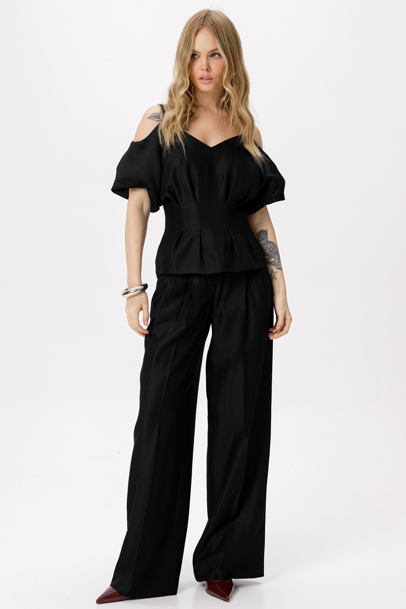 Широкие брюки-палаццо со стрелками. Детали: брюки с притачным поясом со шлевками, складки у пояса, застежка на молнию и пуговицу, боковые карманы, заутюженные стрелки. Задние части брюк с вытачками и имитацией карманов.