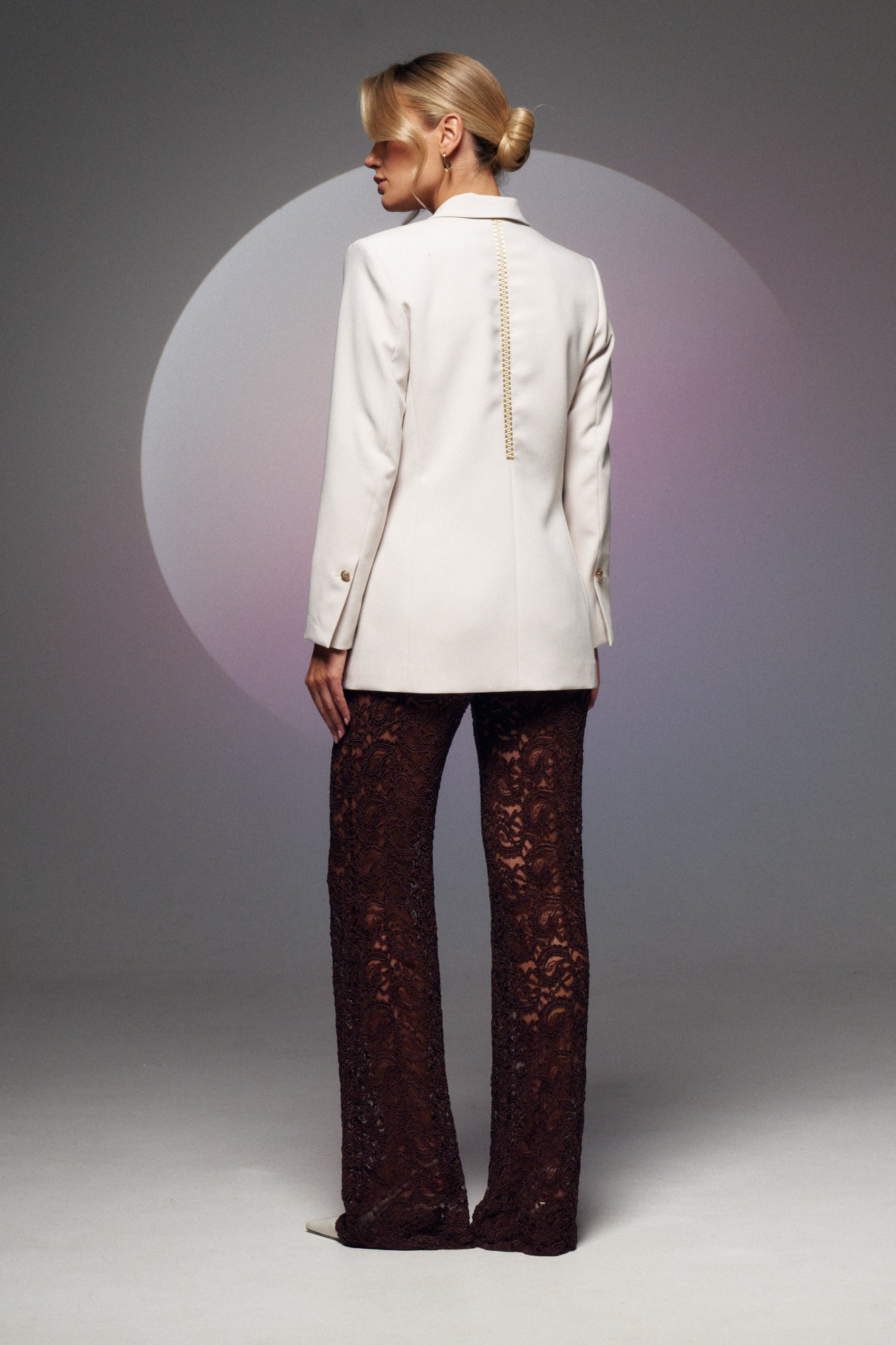 Брюки прямого кроя из кружевного полотна с кружевным подкладом в в виде нижнего белья. Пояс на резинке.