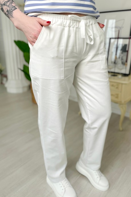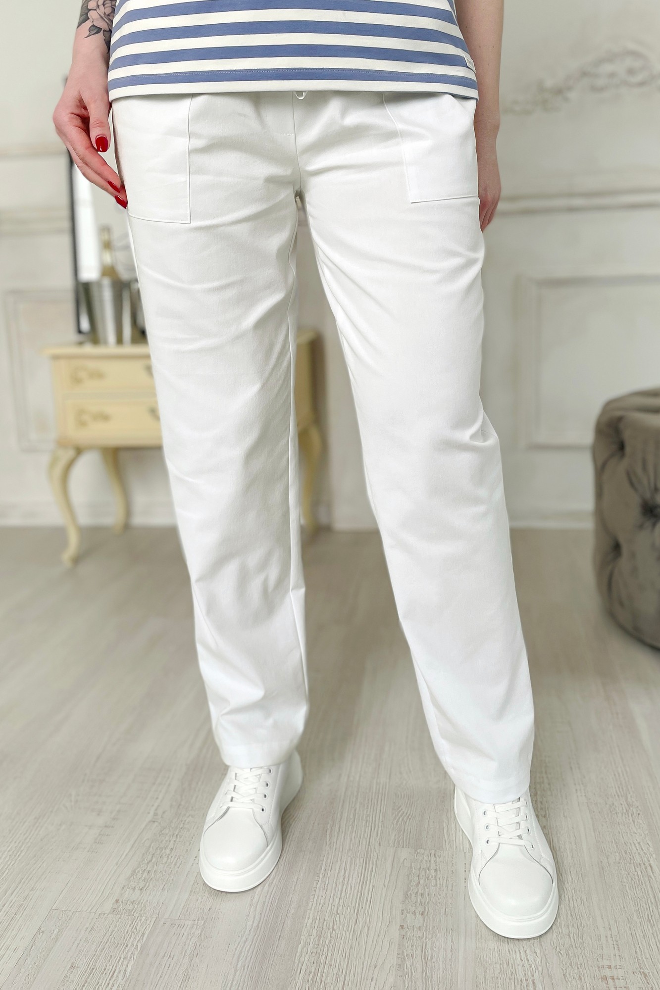 Брюки женские из текстильной ткани (джинс) слегка заужены к низу. По переду расположены накладные карманы. Вверх брюк обработан поясом с широкой резинкой. В пояс вставлена тесьма.