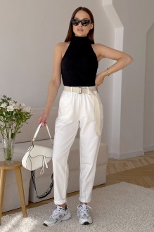 Брюки женские из трикотажной хлопковой ткани (двунитка), слегка заужены к низу. В боковых швах расположены карманы. По низу передних половинок есть защип. Задняя половинка брюк с отрезной кокеткой и накладными карманами. Вверх брюк обработан поясом с резинкой (без молнии). ПОЯС ВХОДИТ В КОМПЛЕКТ.