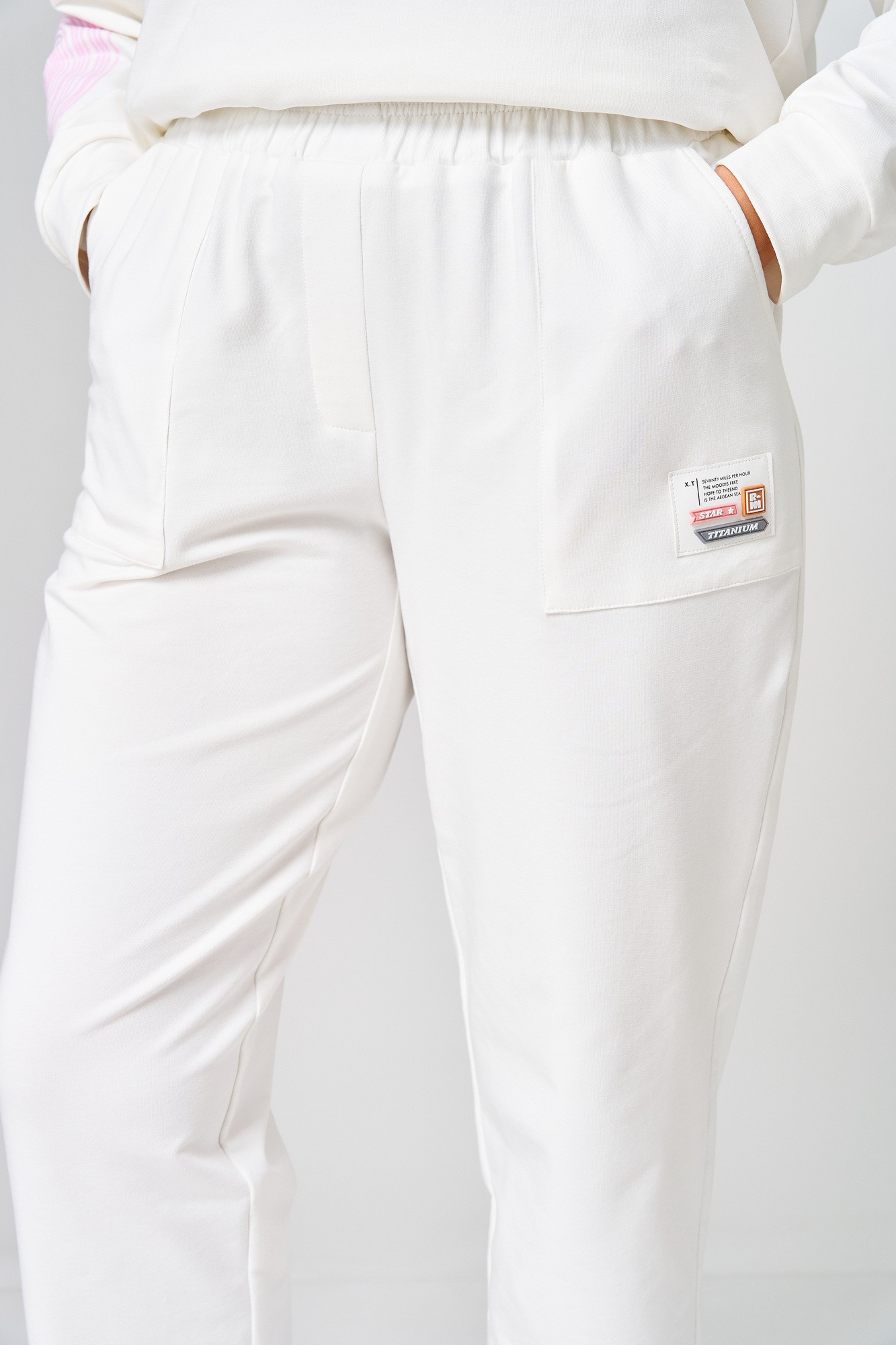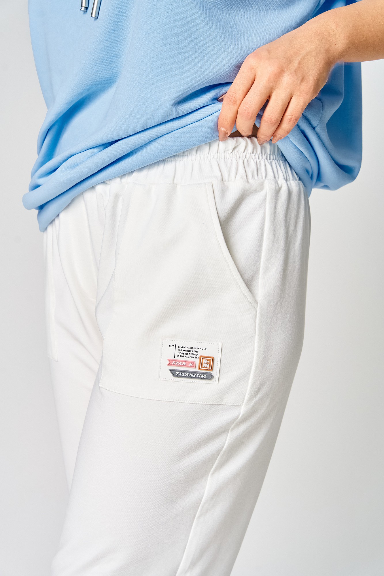 Брюки женские из трикотажной ткани (двунитка), слегка заужены к низу. По переду брюк расположены накладные карманы. На левом кармане настрочной декоративный элемент. В пояс вставлена резинка по кругу.