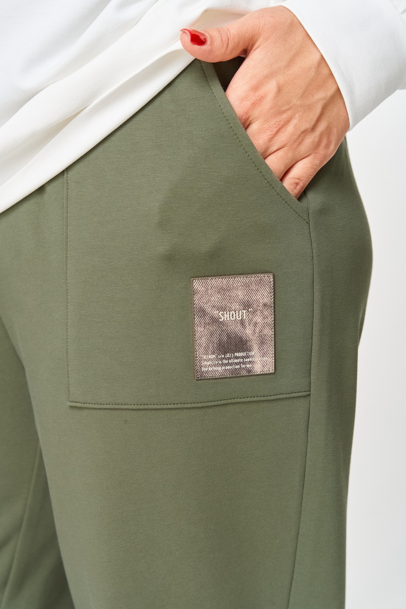 Брюки женские из трикотажной ткани (двунитка), слегка заужены к низу. По переду брюк расположены накладные карманы. На левом кармане настрочной декоративный элемент. В пояс вставлена резинка по кругу.