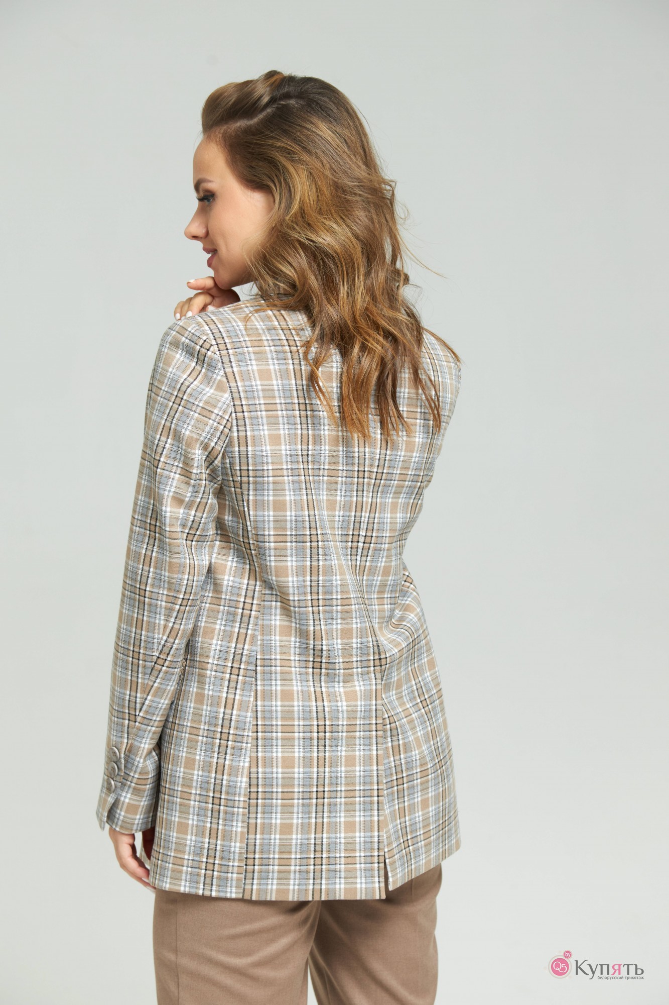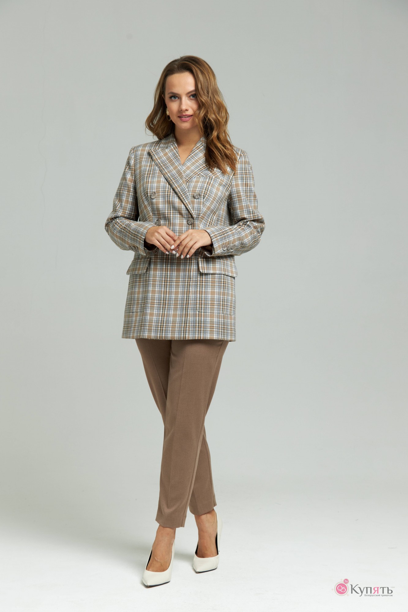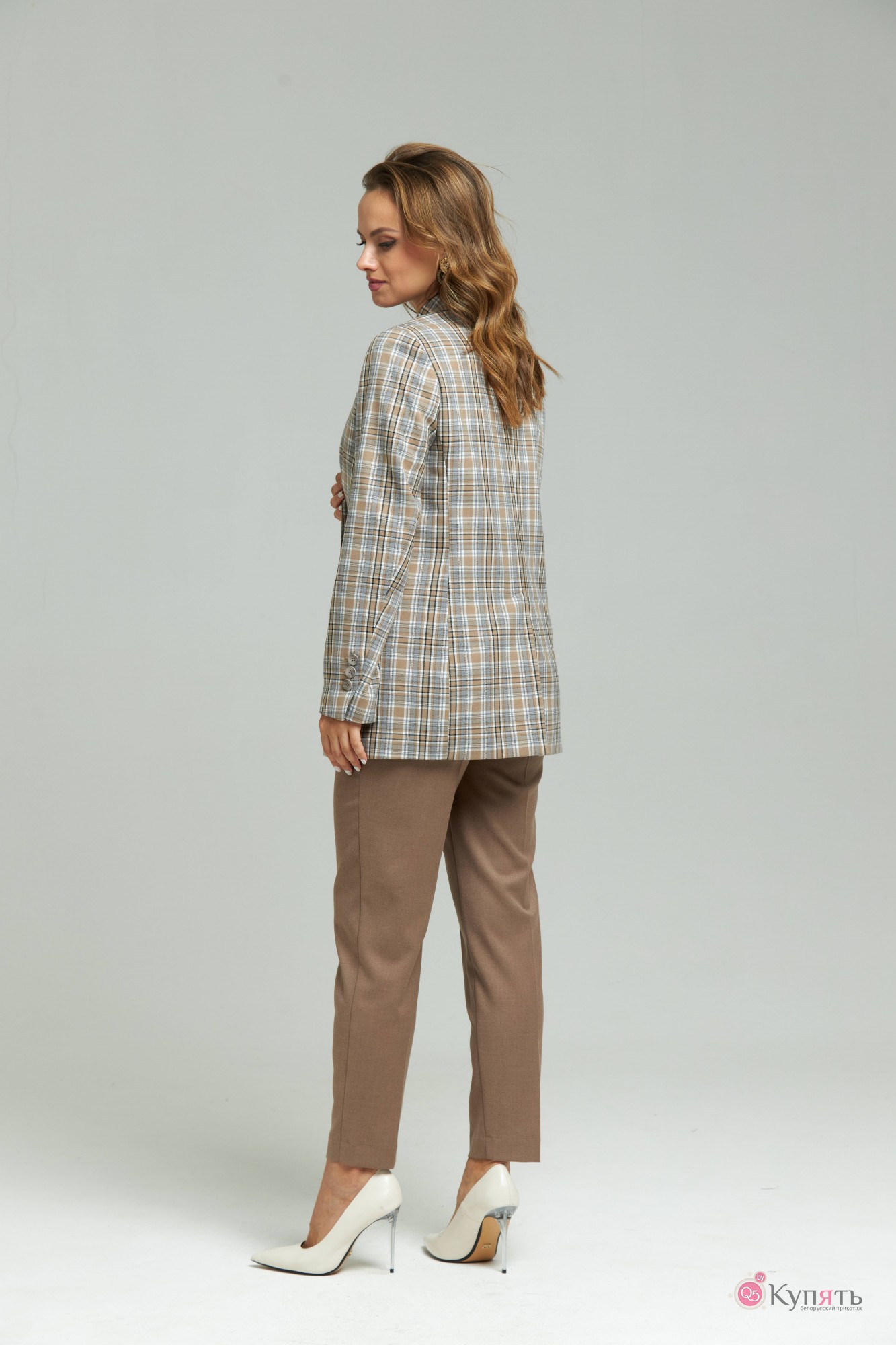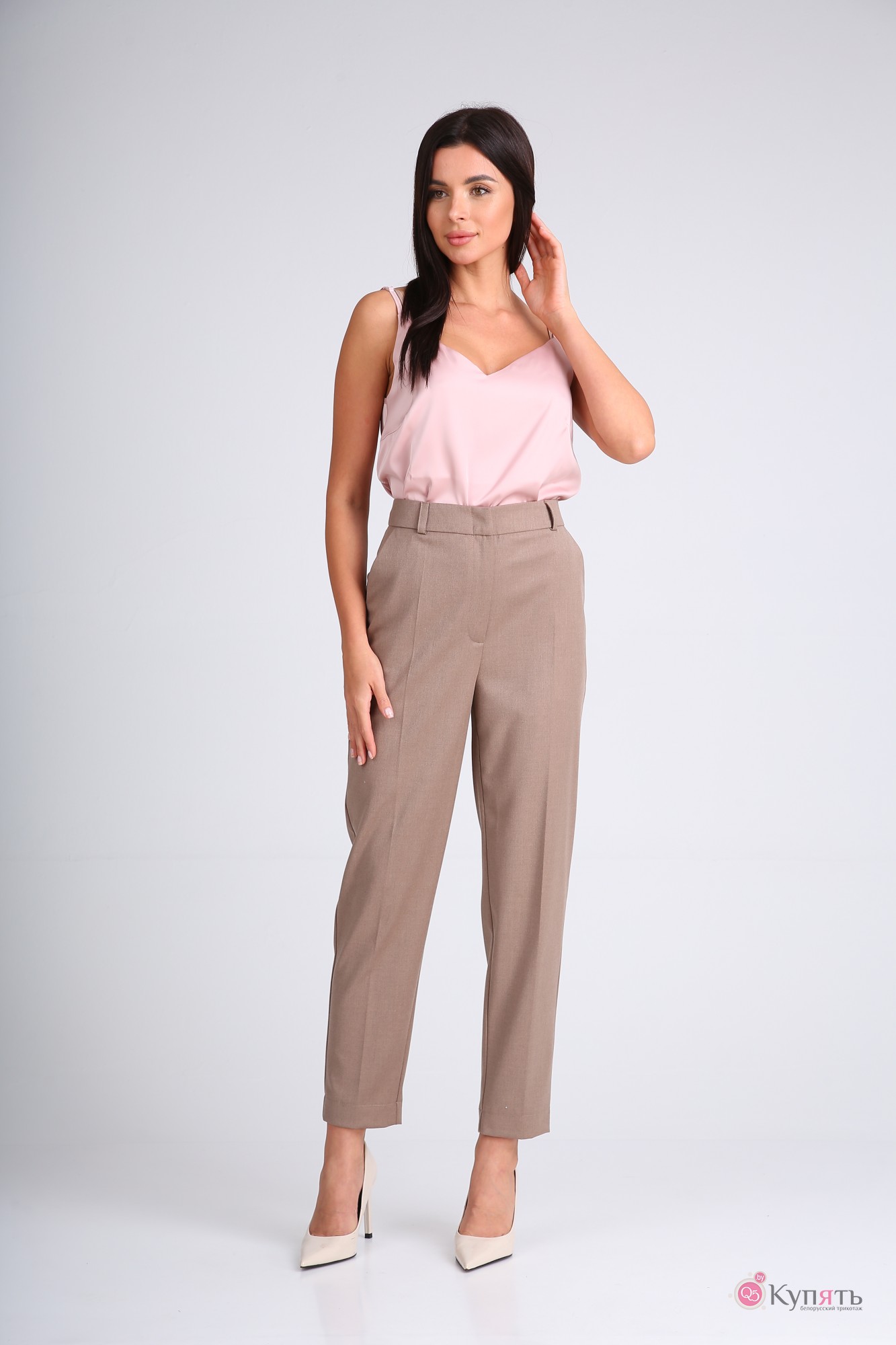 Брюки классические из костюмной ткани, с посадкой на линии талии, длиной до щиколотки, заужены к низу, со стрелками по переду и спинке. Передние половинки с карманами, наклонными к боковым швам, с застёжкой на тесьму-молнию в среднем шве, обработанной гульфиком и откоском. Задние половинки с вытачками от шва притачивания пояса до линии кармана, с прорезными нефункциональными карманами с листочкой. Пояс обтачной по верхнему краю, с застёжкой по центру переда на два потайных крючка, на поясе расположены пять шлёвок: по центру деталей переда, по центру шва сидения, возле боковых швов, со смещением в сторону спинки.