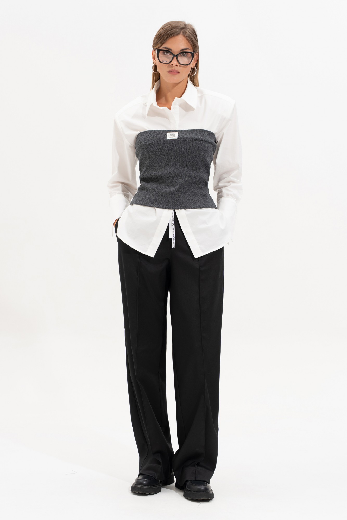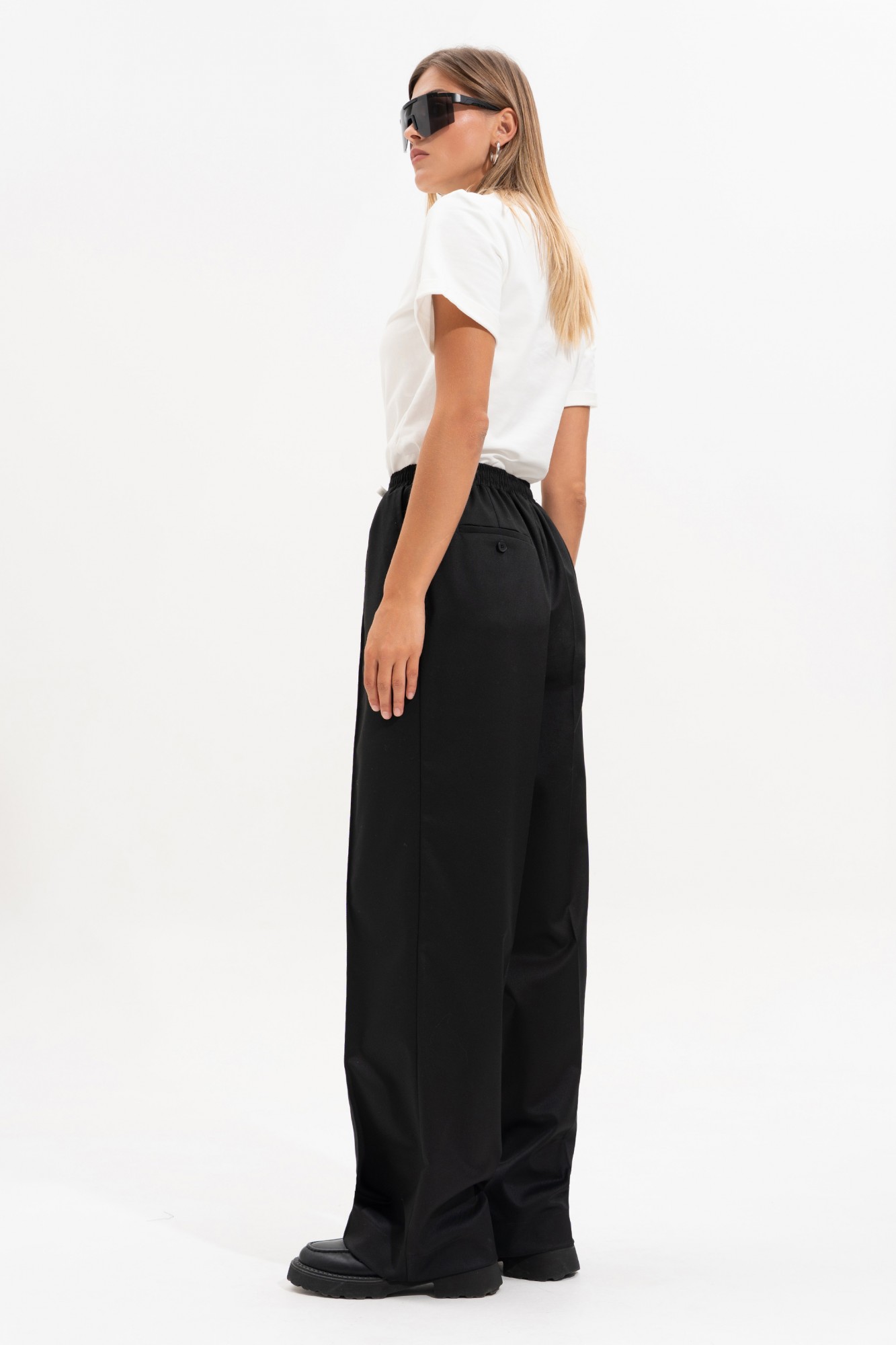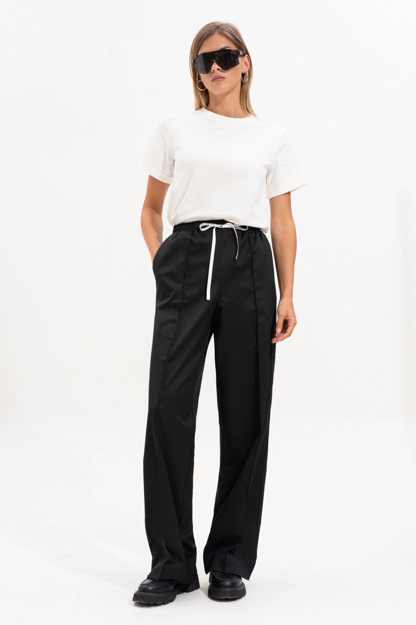 Брюки прямого свободного силуэта, впереди с застроченными кантами. На задней части брюк карман-листочка с пуговицей. Пояс на резинке, с контрастным шнурком, по переду боковые наклонные карманы.