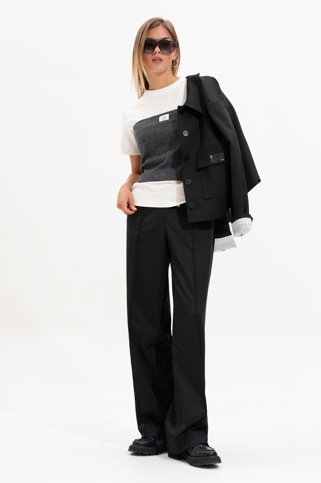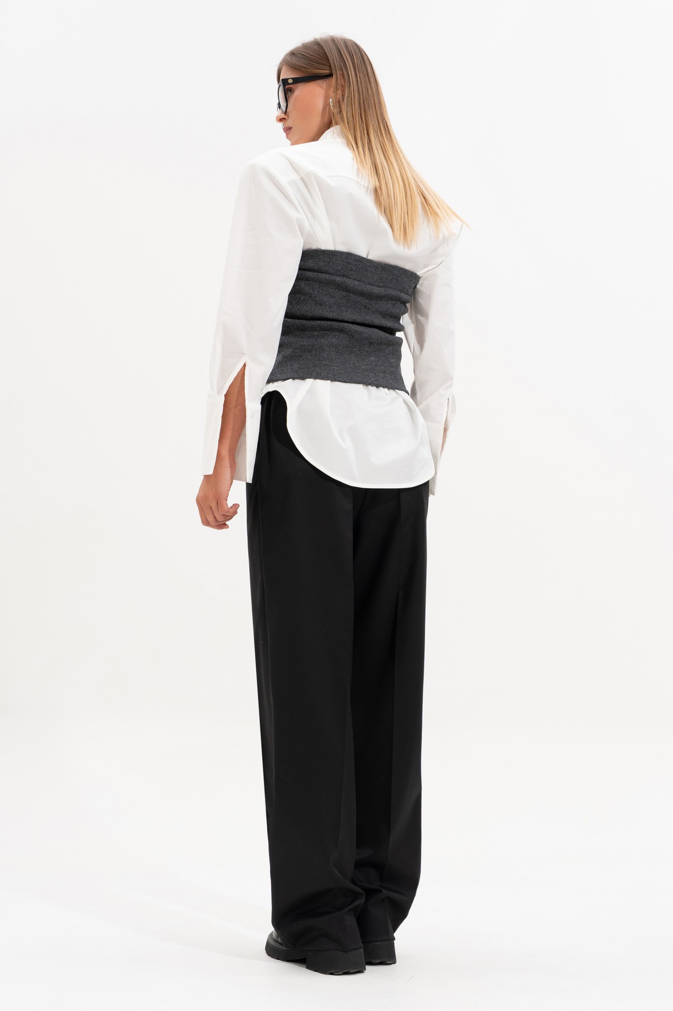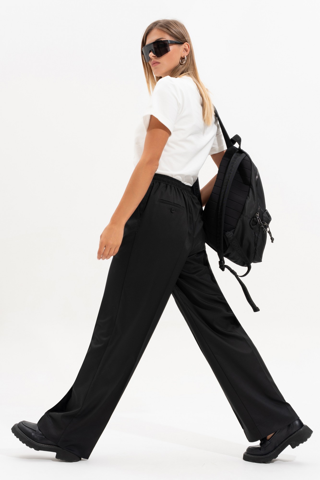 Брюки прямого свободного силуэта, впереди с застроченными кантами. На задней части брюк карман-листочка с пуговицей. Пояс на резинке, с контрастным шнурком, по переду боковые наклонные карманы.