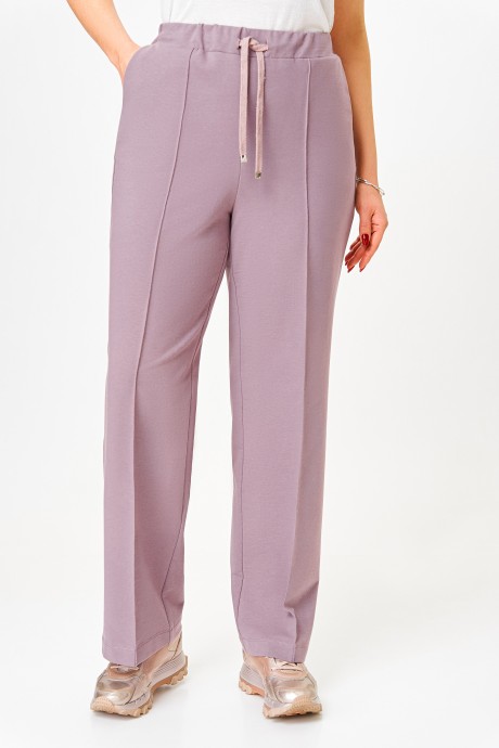 Брюки женские спортивного стиля из эластичного хлопкового полотна, прямого от бедра кроя. По передним половинкам брюк расположены фигурные карманы. По передним и задним половинкам отсрочены канты. Пояс брюк притачной с эластичной тесьмой-резинкой, в передней части пояса вставлен декоративный шнурок с металлическими наконечниками. Прекрасно сочетаются с жакетом Модель 785.