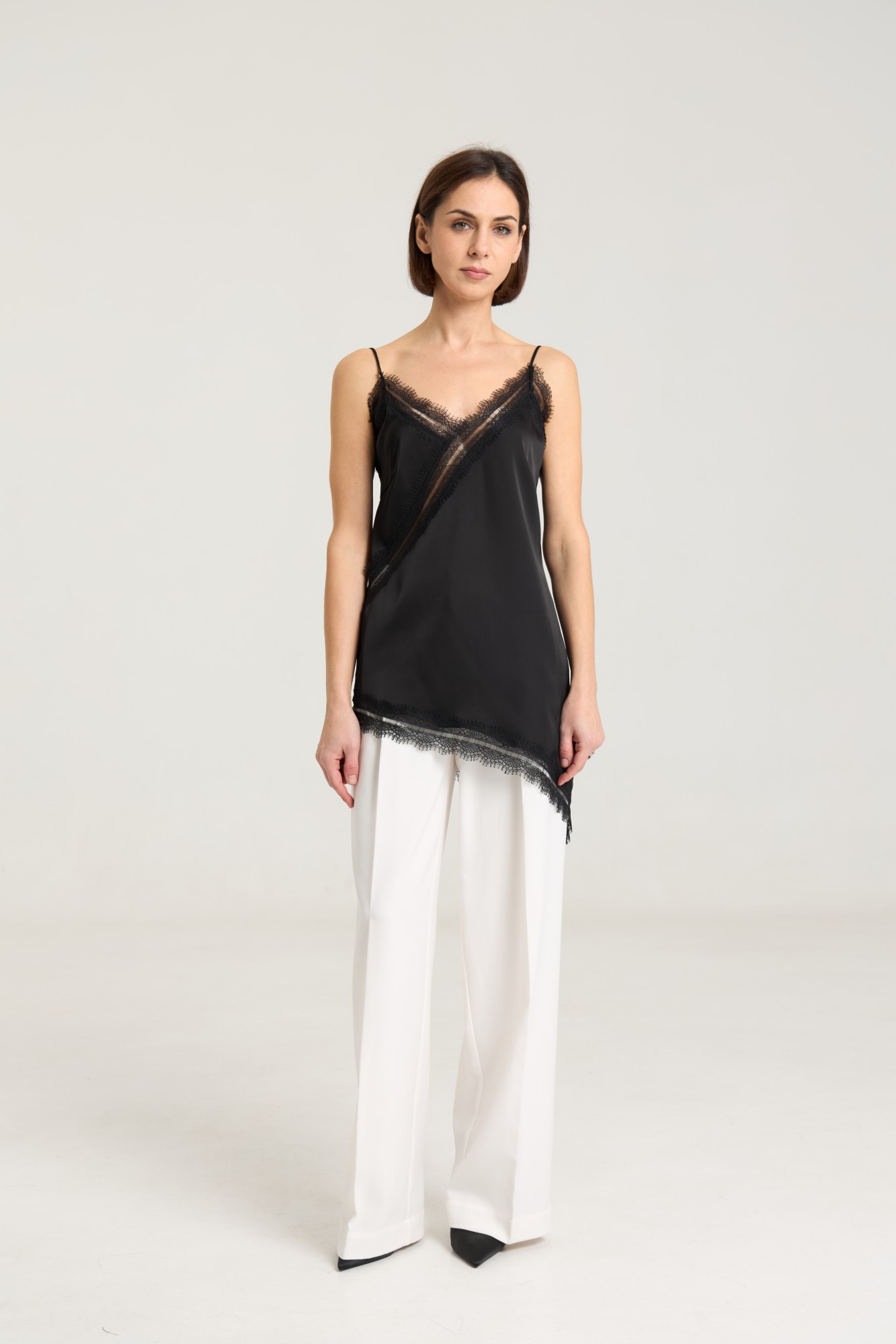Брюки прямые классические с боковыми карманами, спереди застежка- молния, по переду защипы. Брюки выполнены из премиальной ткани костюмной группы. Верх брюк обработан притачным поясом со шлевками. Выполнены из плотной костюмной ткани молочного цвета. Брюки не просвечивают.