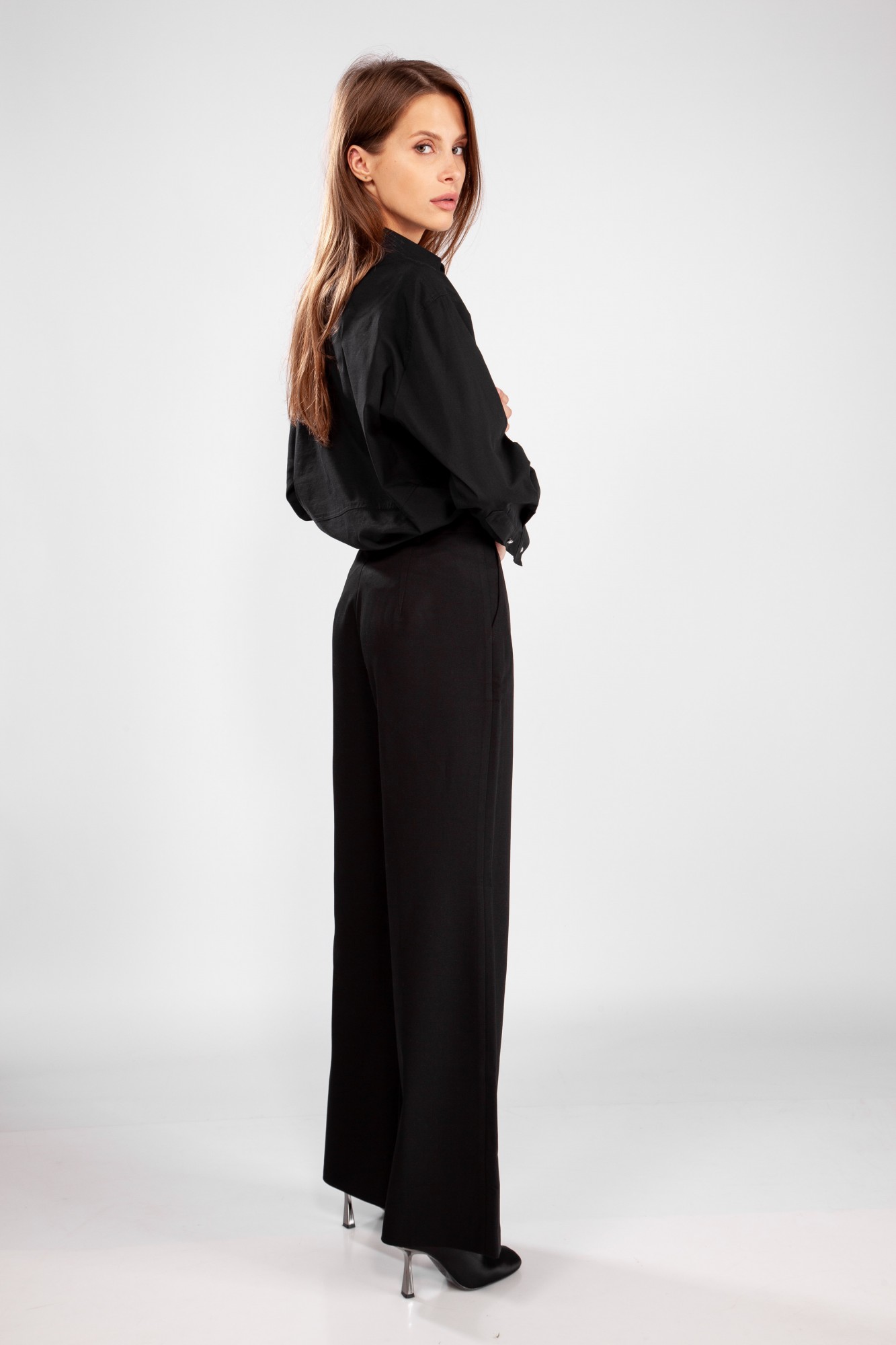 Стильные женские брюки свободного силуэта, расклешённые к низу. Пояс брюк со шлевками. Застегиваются на молнию и петлю-пуговицу. Карманы - боковые наклонные.