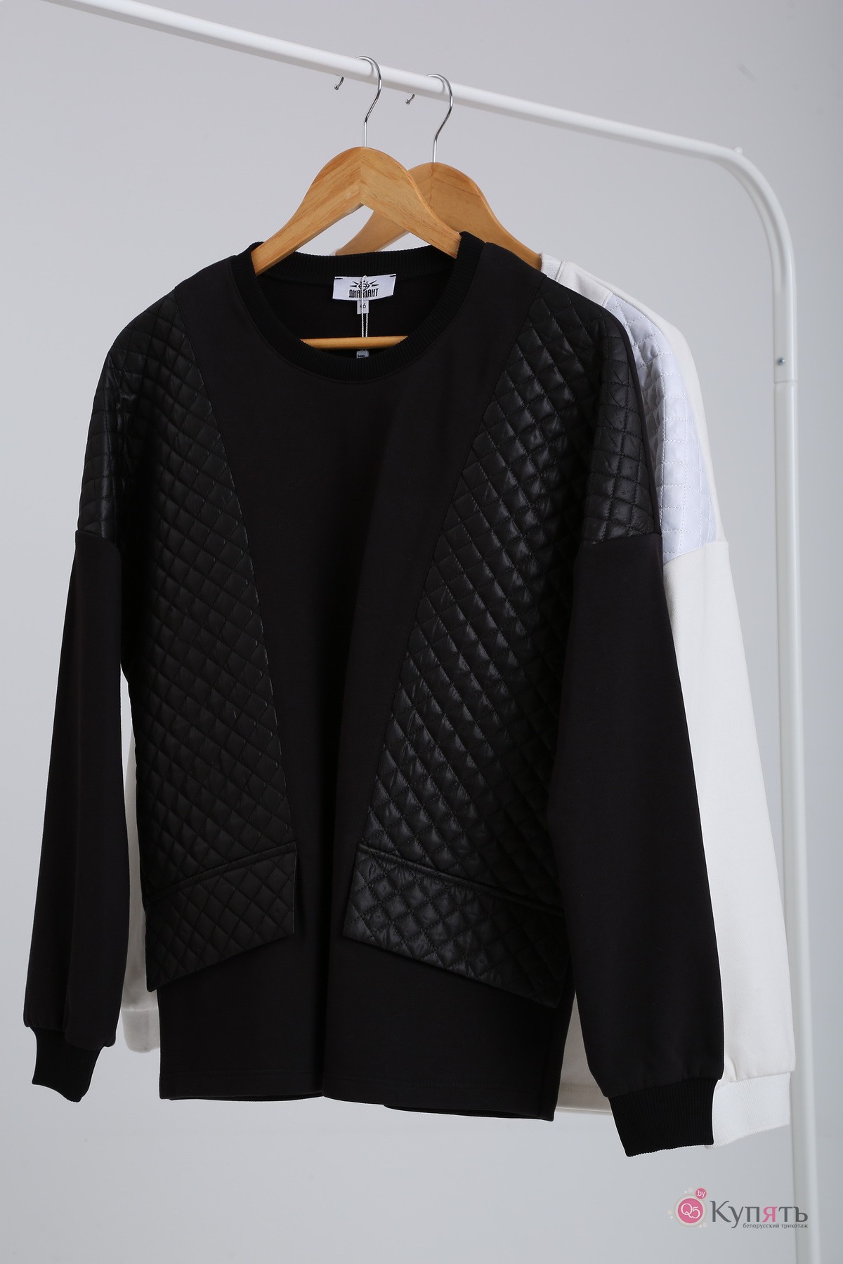 Джемпер женский, свободного кроя, линия плеча спущена, рукав втачной одношовный с притачным манжетом. По переду отрезные бочки из отделочной ткани, в подрезе отлетные отделочные клапаны.