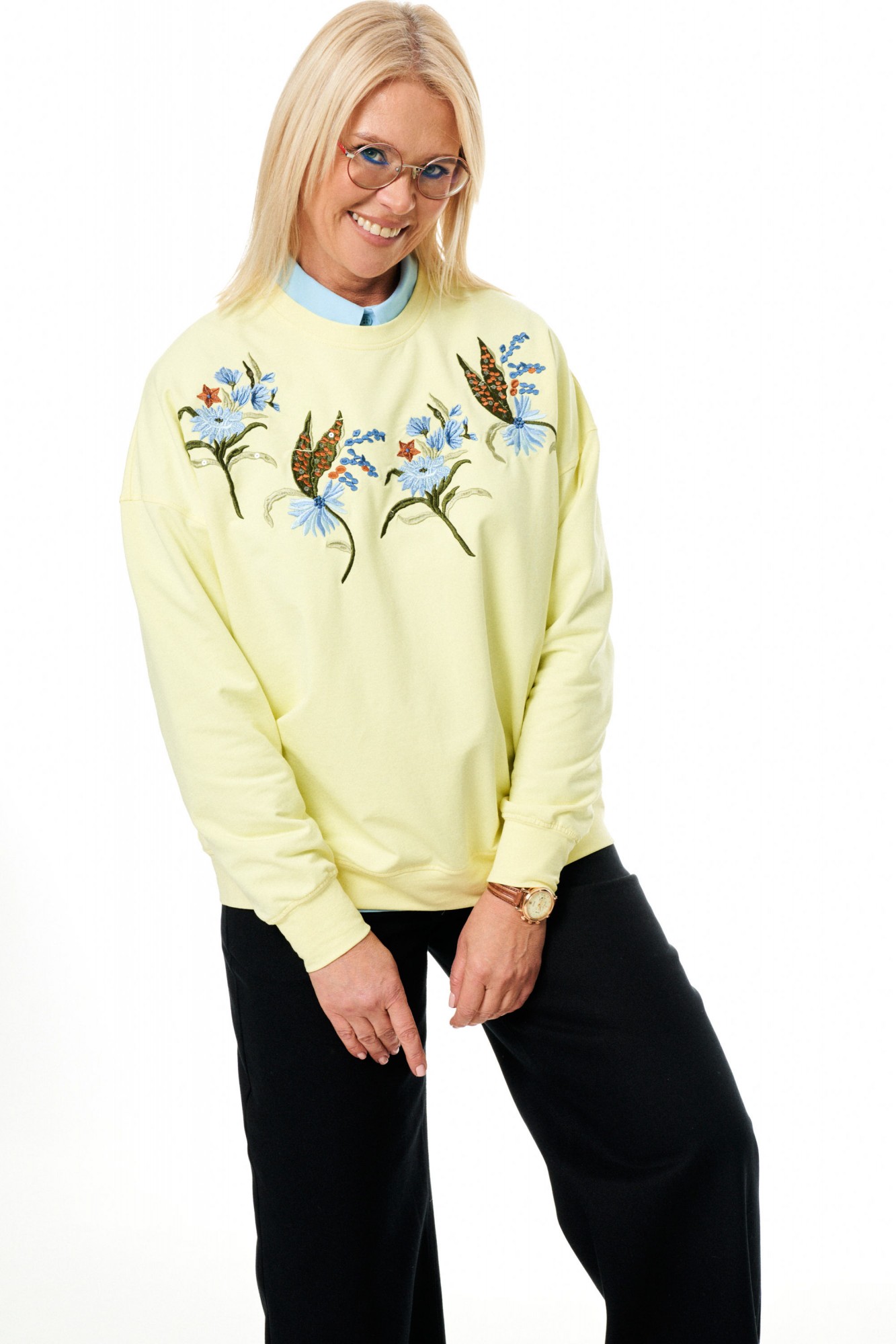 Джемпер женский, свободного силуэта из трикотажного полотна. Со спущенной линией плеча. Перед с декоративной вышивкой. Круглая горловина с отделочной обтачкой. Рукав длинный с притачной манжетой. Низ с притачной планкой.