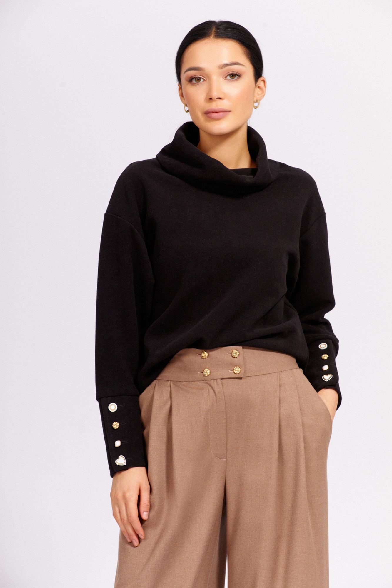 Джемпер женский, прямого силуэта. Перед цельнокроеный. Спинка цельнокроеная. Плечо спущено. Рукав одношовный, по низу обработан широкой притачной манжетой, застегивающейся на декоративные пуговицы и петли. Горловина обработана воротником –«хомут».