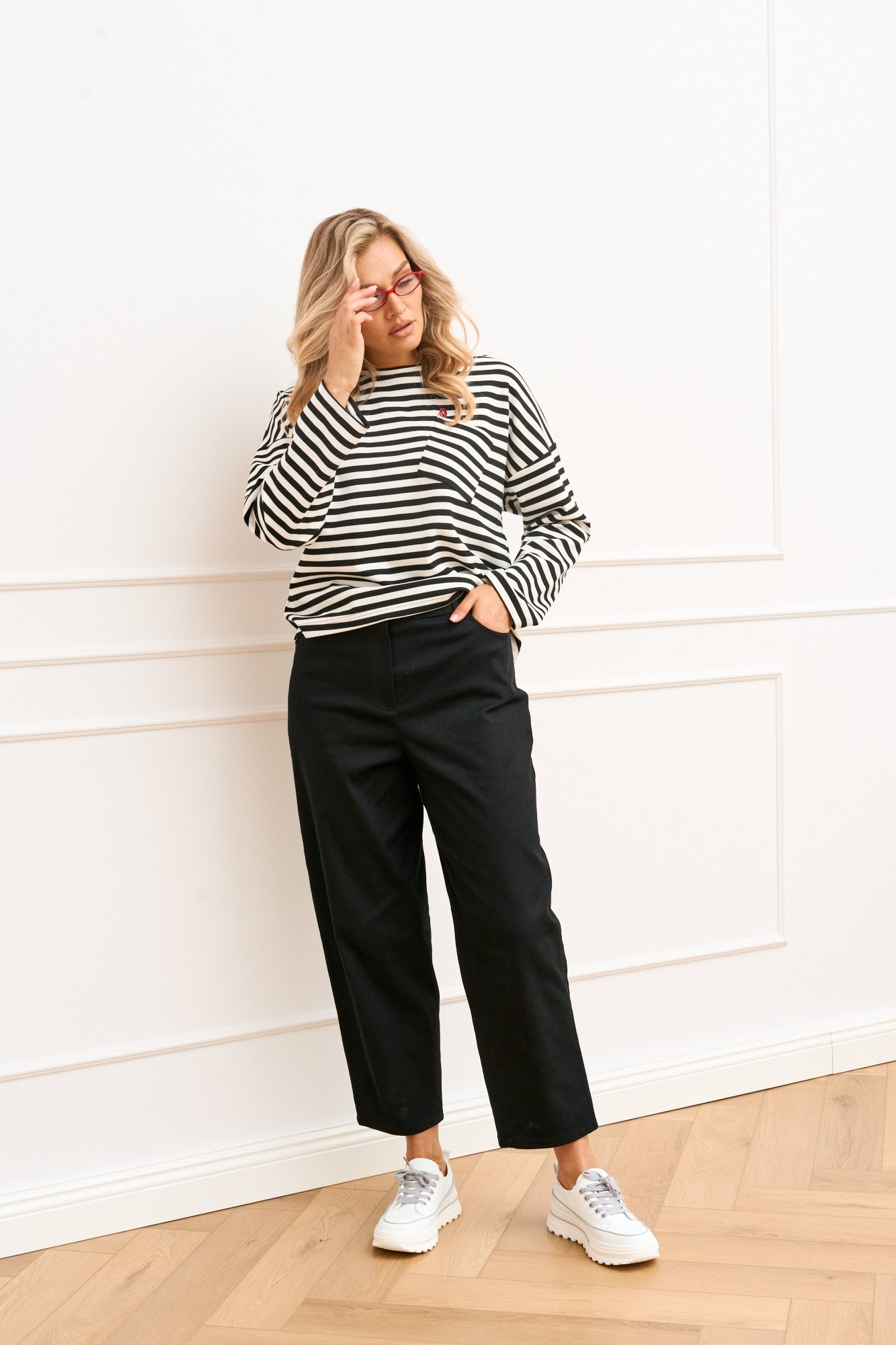 Джемпер свободного силуэта из трикотажного полотна в полоску длиной ниже линии бедер. Линия плеча спущена, рукав длинный втачной одношовный. Вырез горловины круглый обработан притачной бейкой. По полочке с левой стороны обработан накладной карман. Низ изделия асимметричный по спинка длиннее относительно переда.