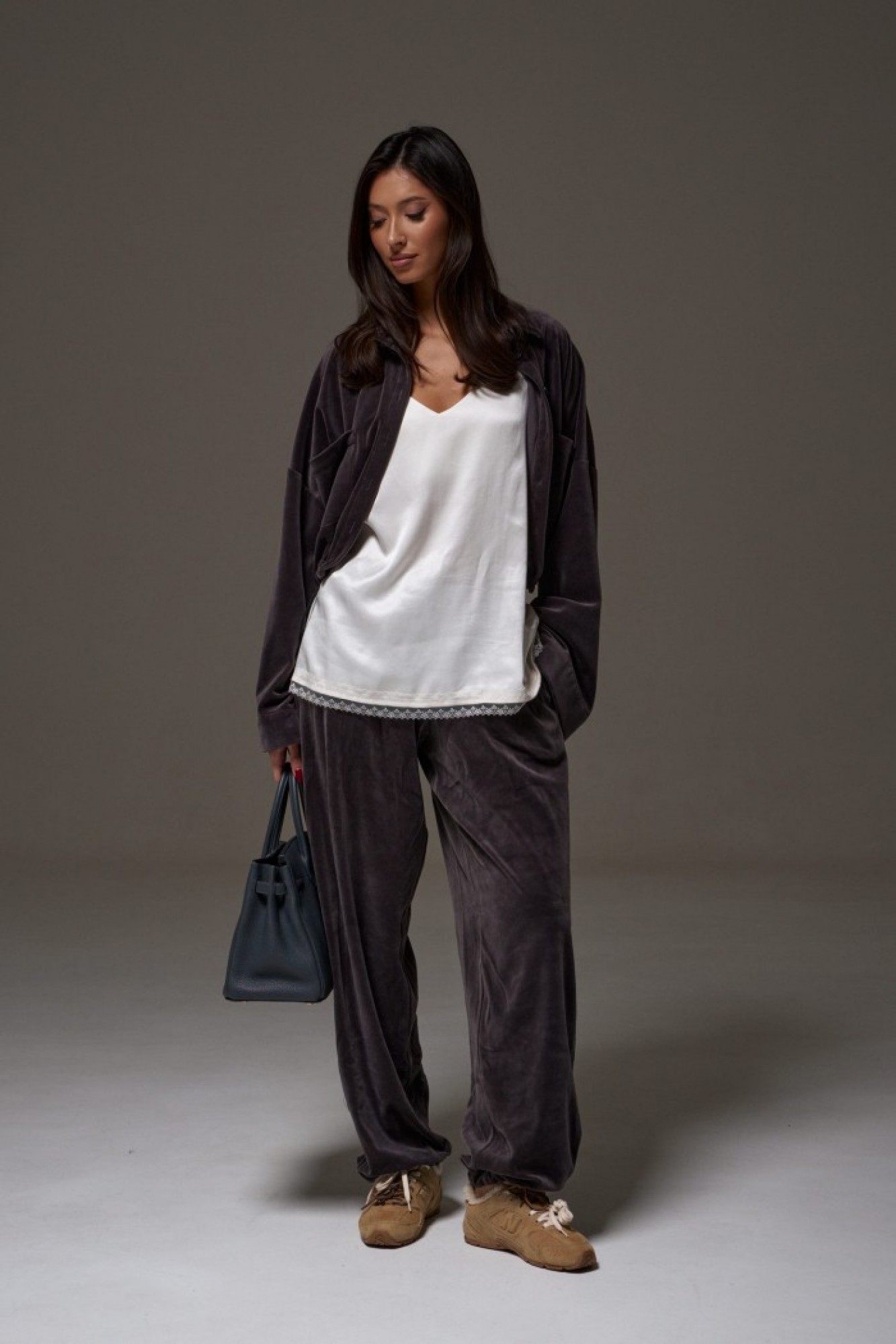 Джемпер свободного, прямого кроя выполнен из полотна велюра графитового цвета. Характеристики: прямой крой, отложной воротник, застежка центральная на петли-пуговицы, рукав втачной спущенный, манжет широкий, по низу изделие собирается на резинку с фиксаторами, по переду изделия крупные накладные карманы.