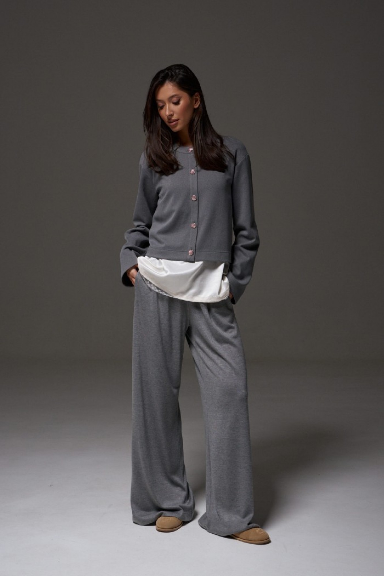 Джемпер прямого кроя выполнен из мягкого трикотажного полотна. Характеристика: прямой крой, овальная горловина, застежка центральная на петли - акцентные пуговицы. Рукав втачной, спущен. Спинка цельнокроеная.