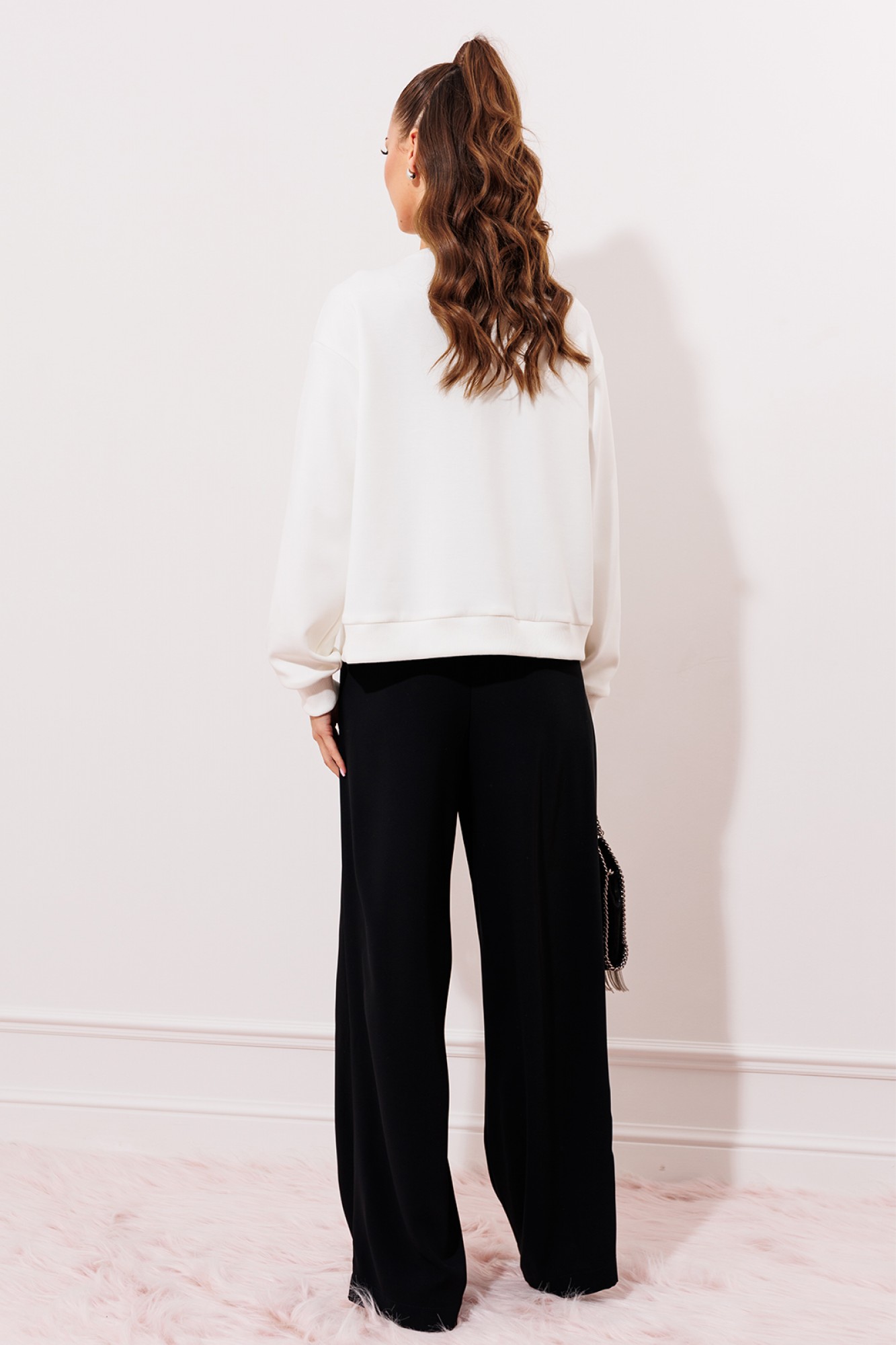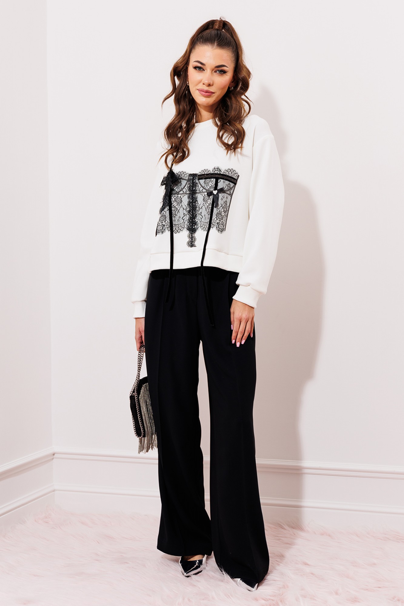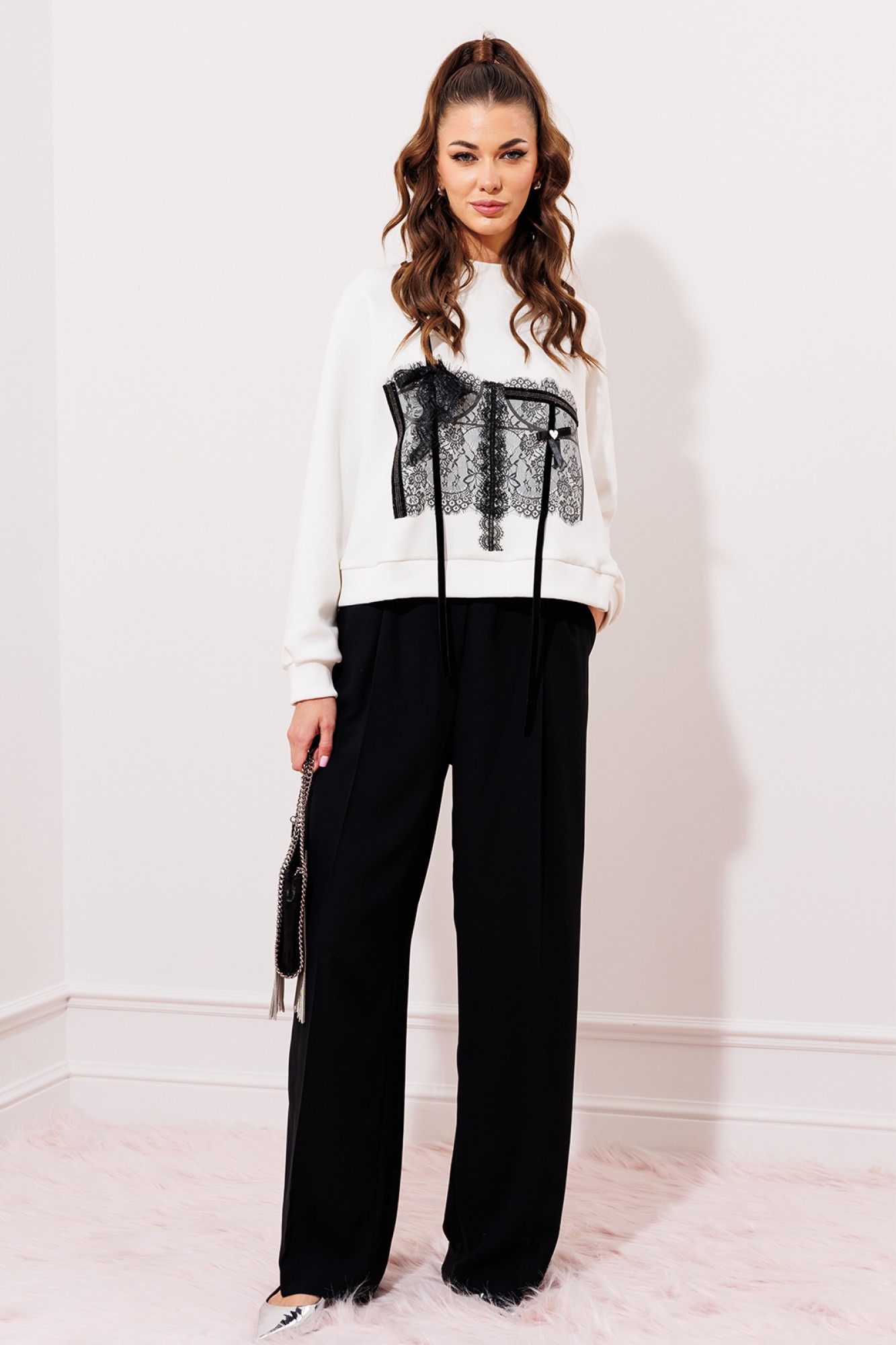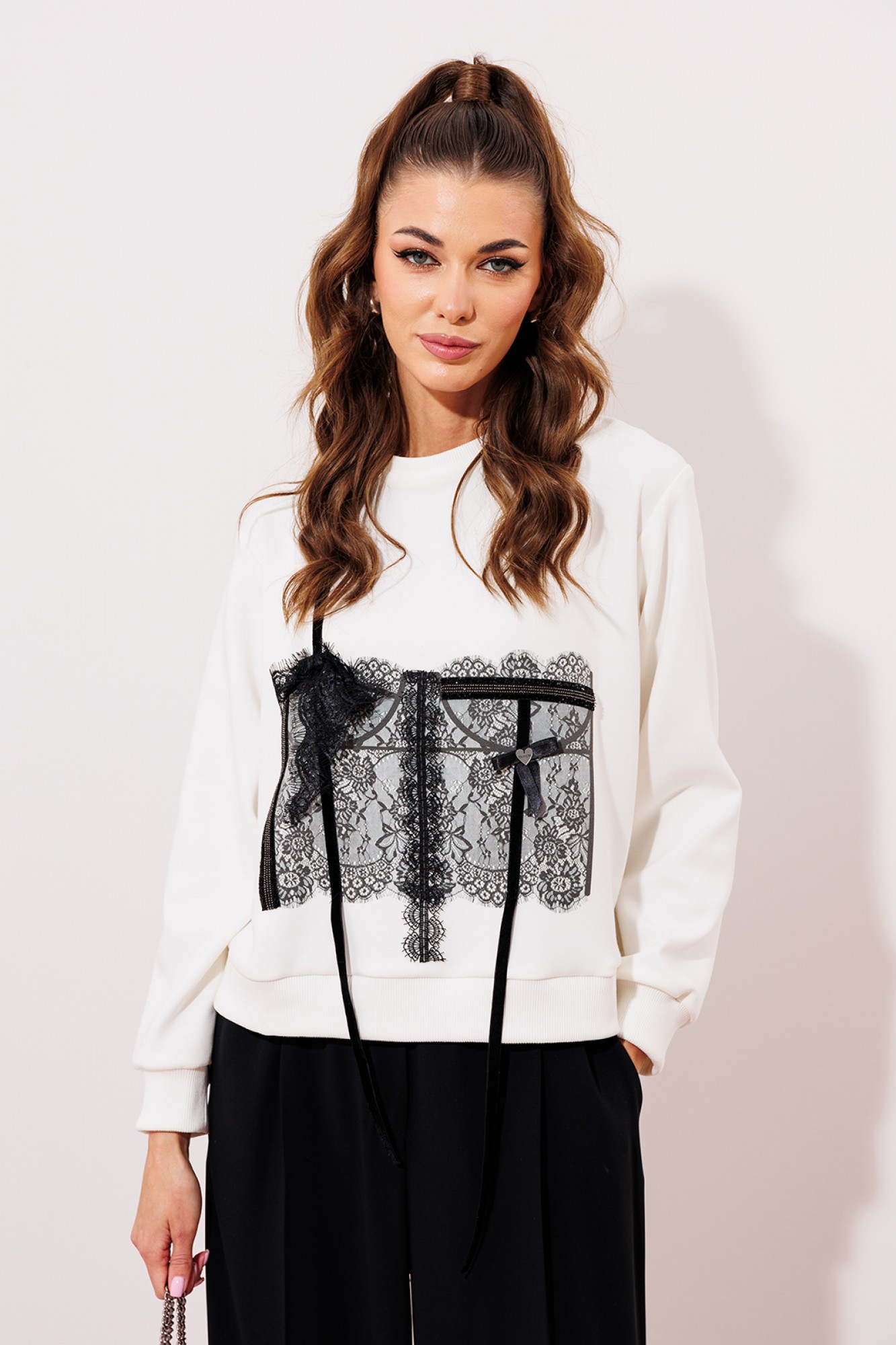 Джемпер из технологичного трикотажного полотна с эффектом peach. С втачным рукавом на манжете. По горловине и низу изделия планки из довяза. Полочка печатью, имитирующей кружевной корсет с надстрочным деталями из бархатной тесьмы и кружева.