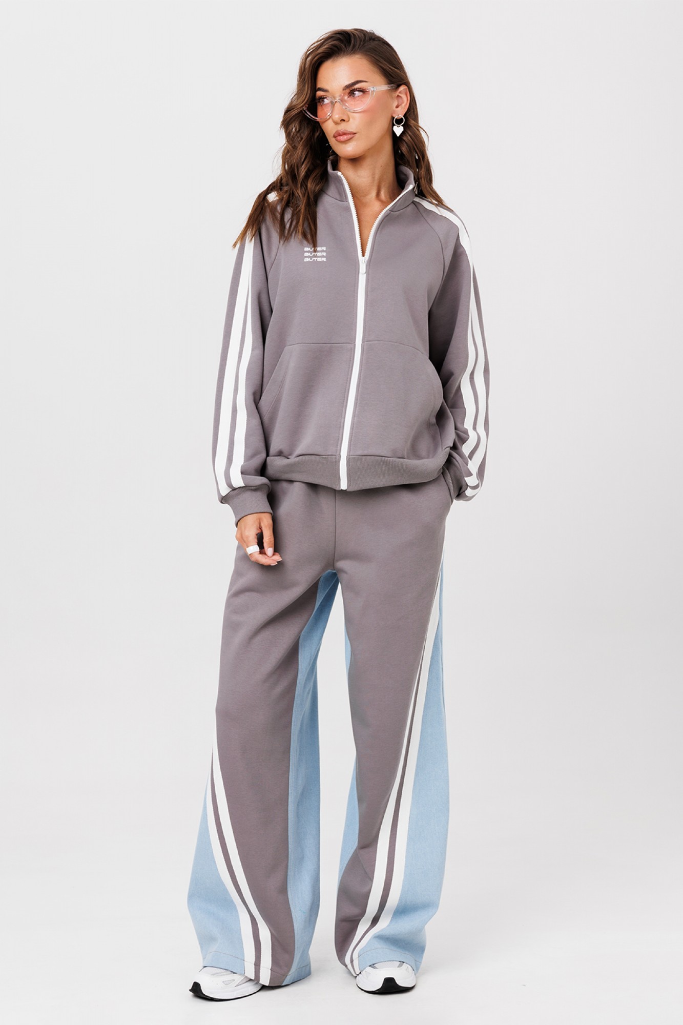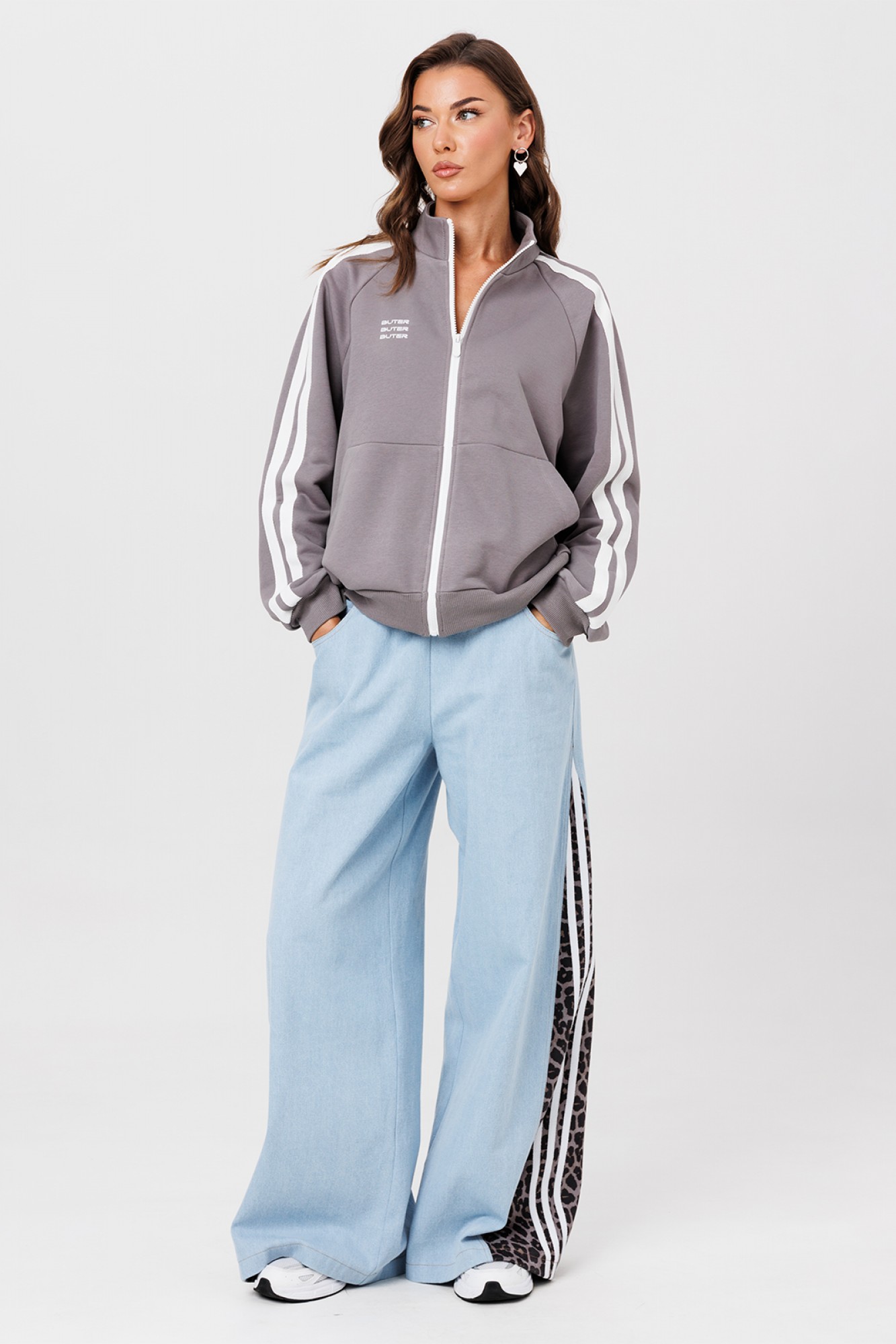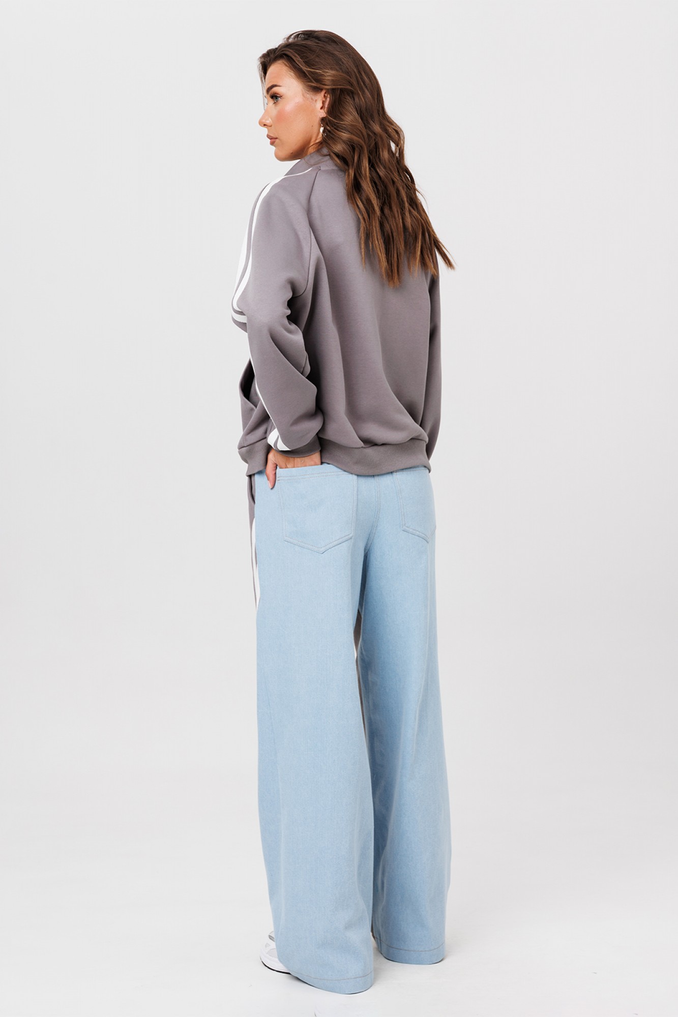 Джемпер трикотажный прямого силуэта с втачным длинным рукавом-реглан внизу на притачной манжете. Рукав с широкими настроченными лампасами. Полочка, с центральной застежкой на тесьму-молнию, карманом-кенгуру и печатью «BUTER». По низу джемпера притачная планка. Воротник-стойка. Джемпер без подкладки.